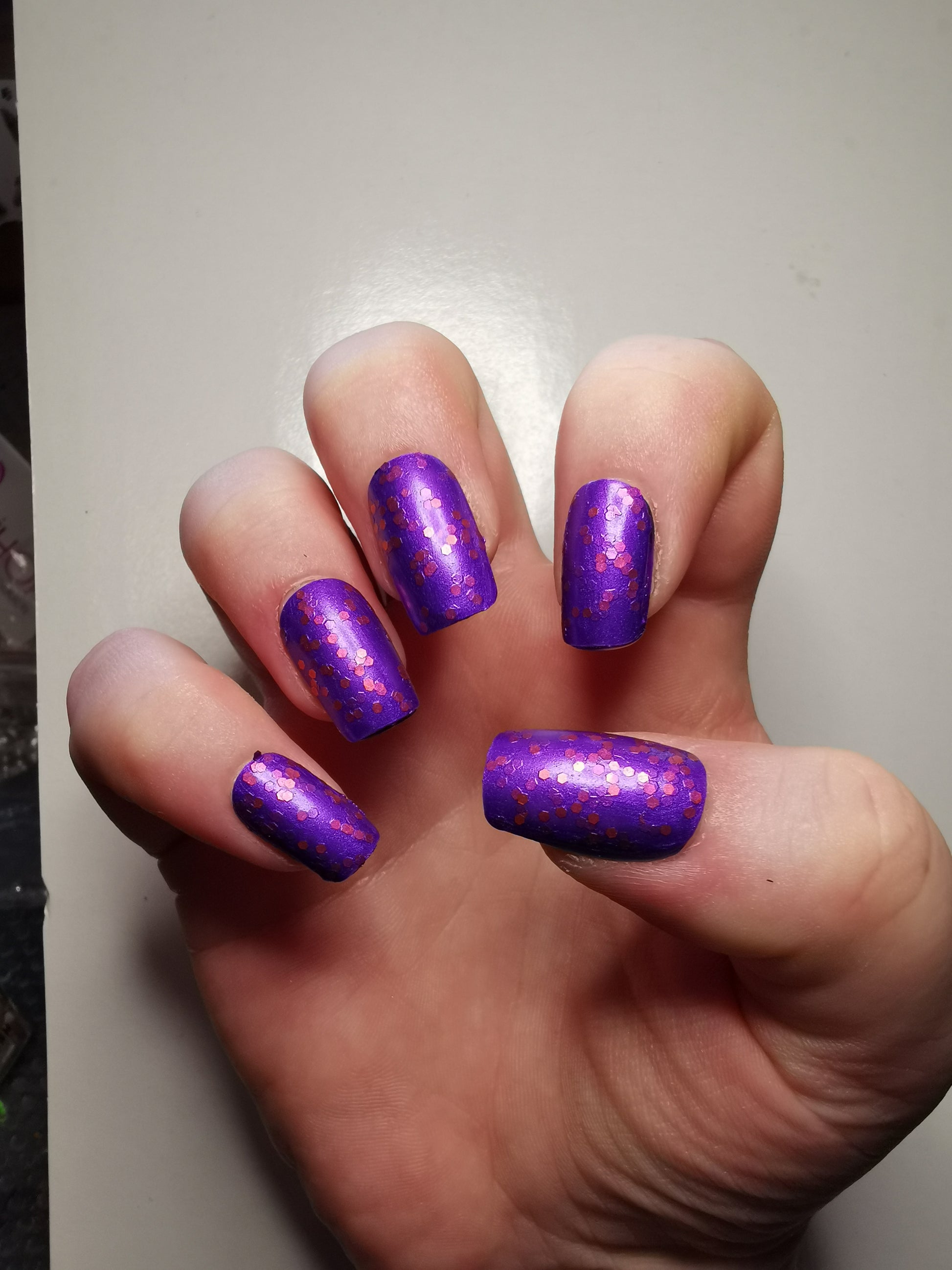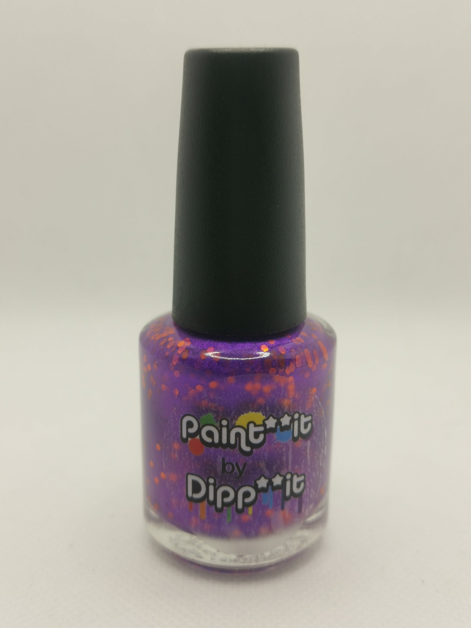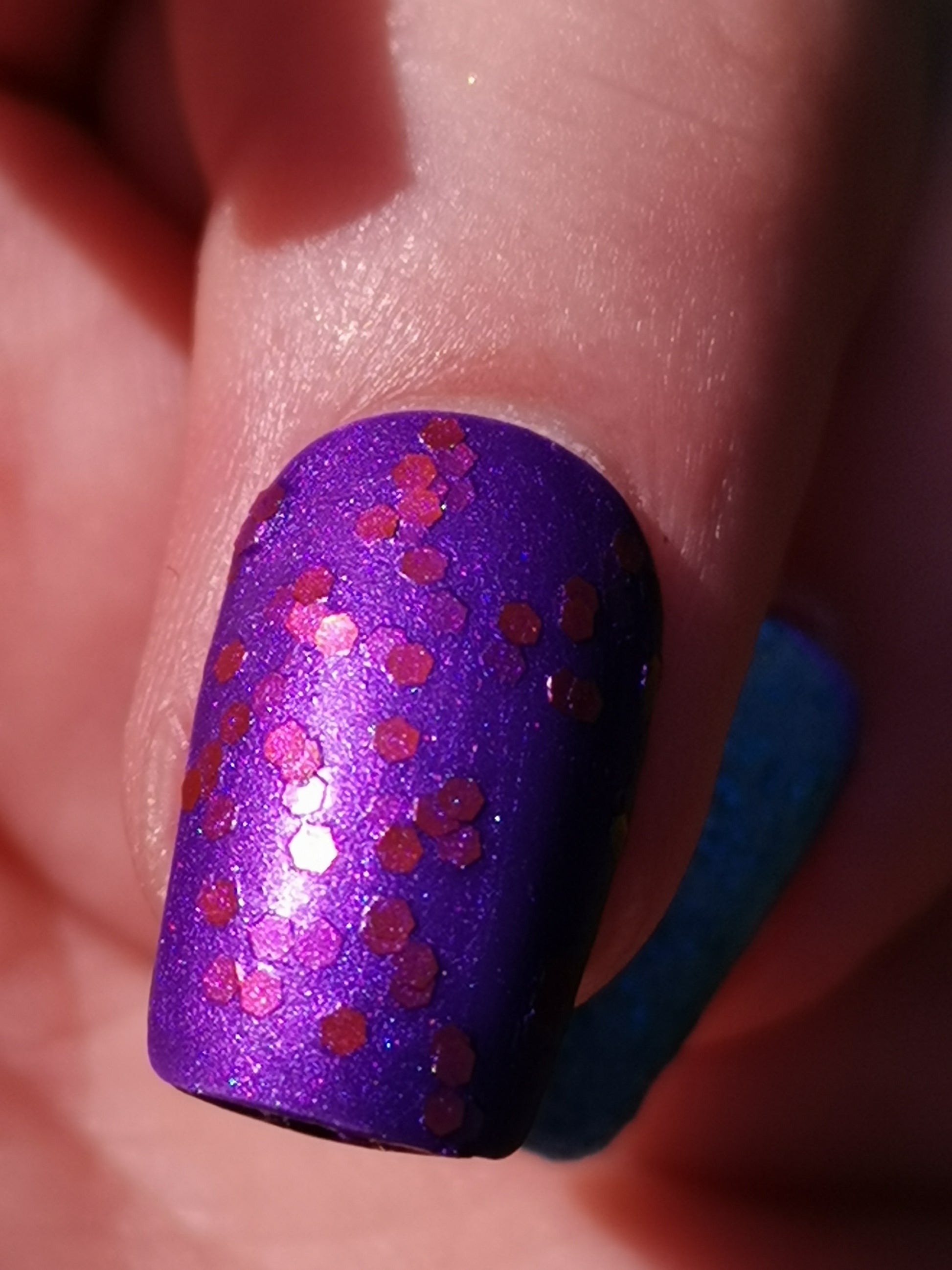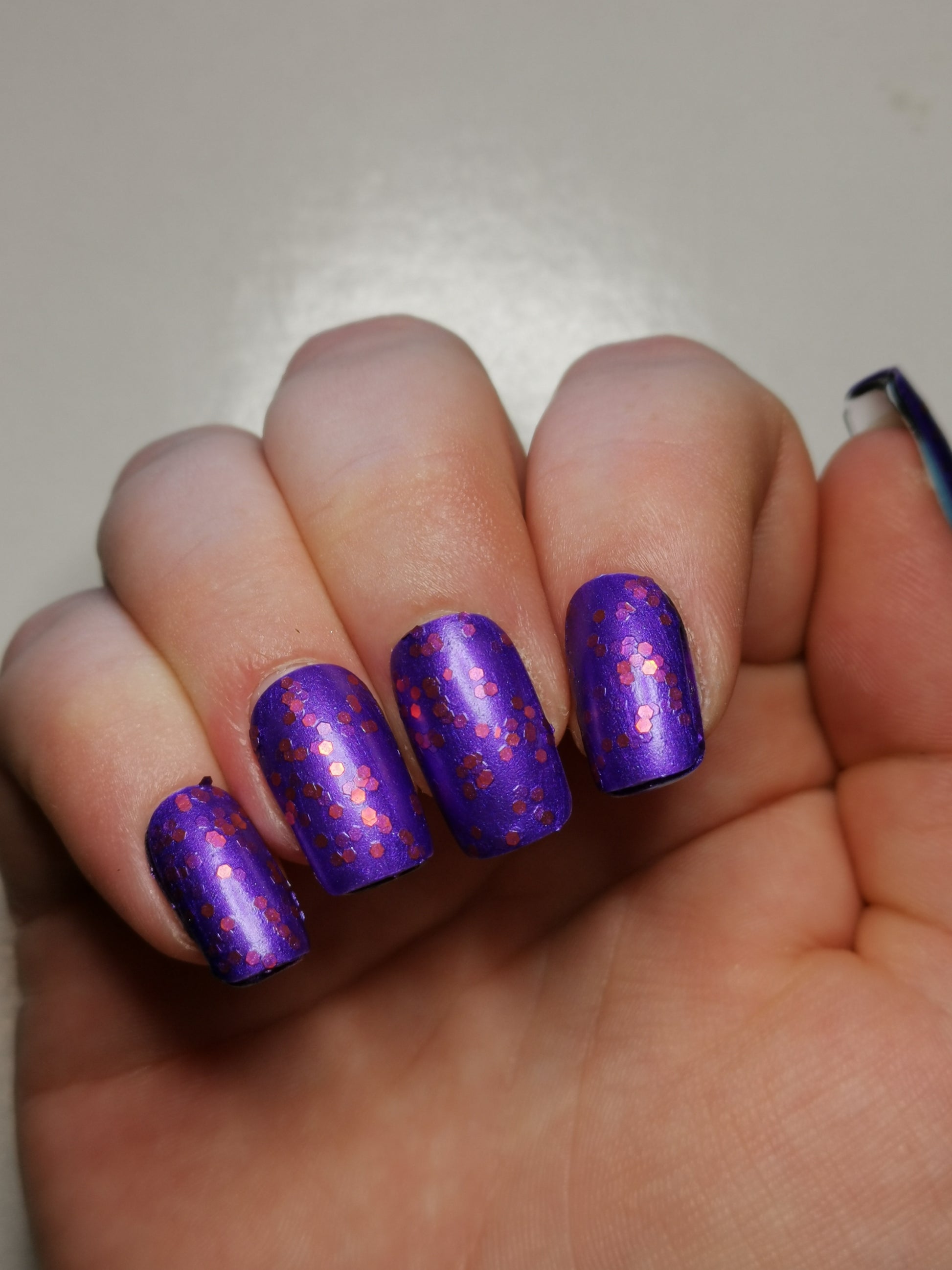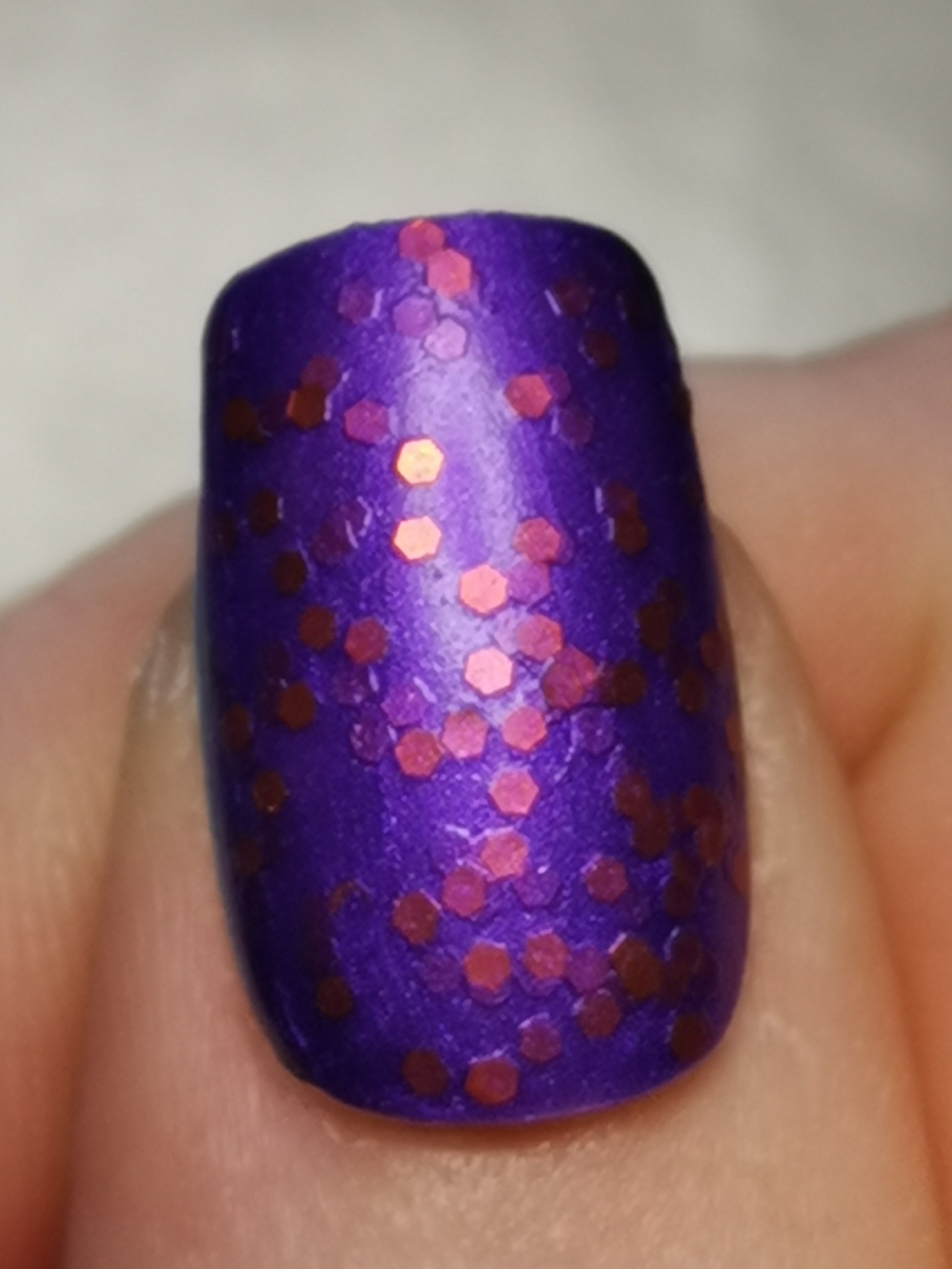 Barbara Bat is inspired by Batgirl and is a satiny purple polish filled with shiny orange hex glitter.