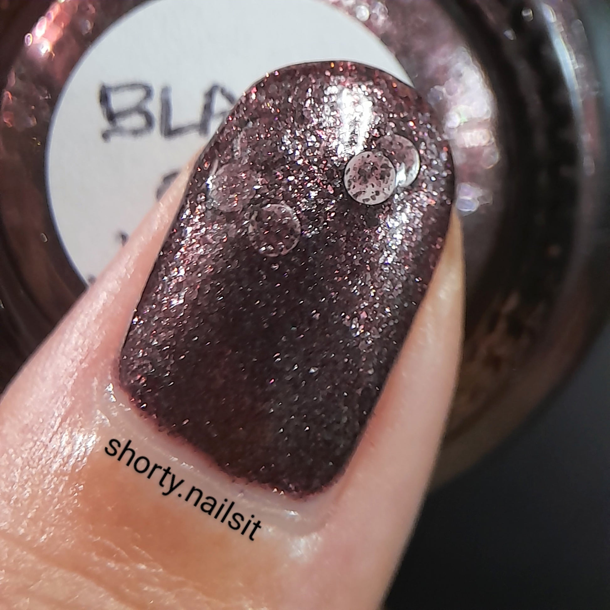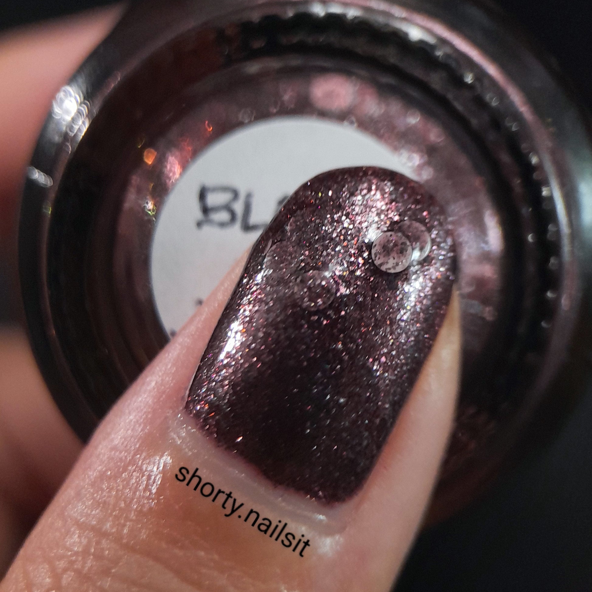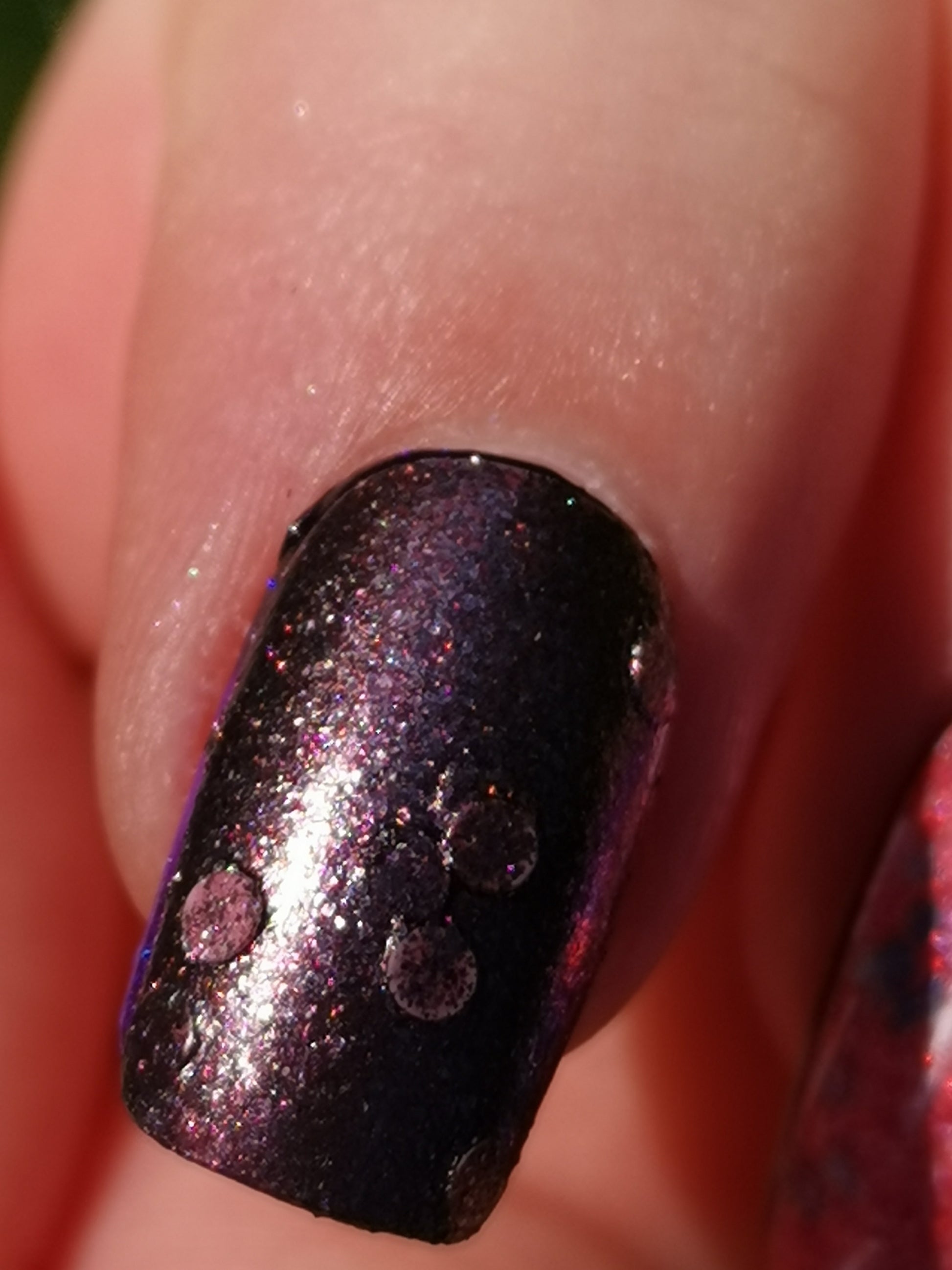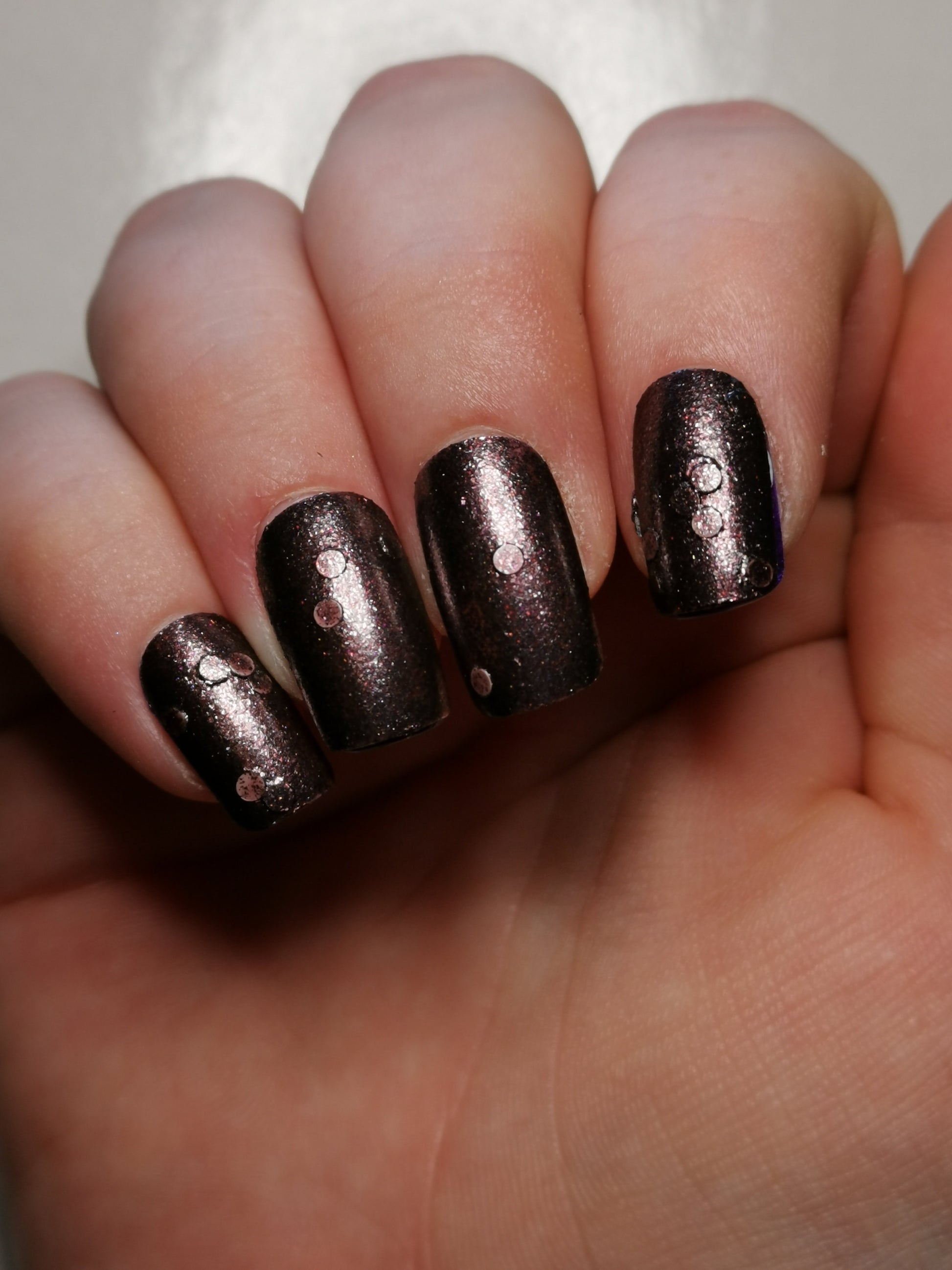 Blade of Justice is inspired by Katana and is a shiny blackened red polish filled with matte grey round glitter.