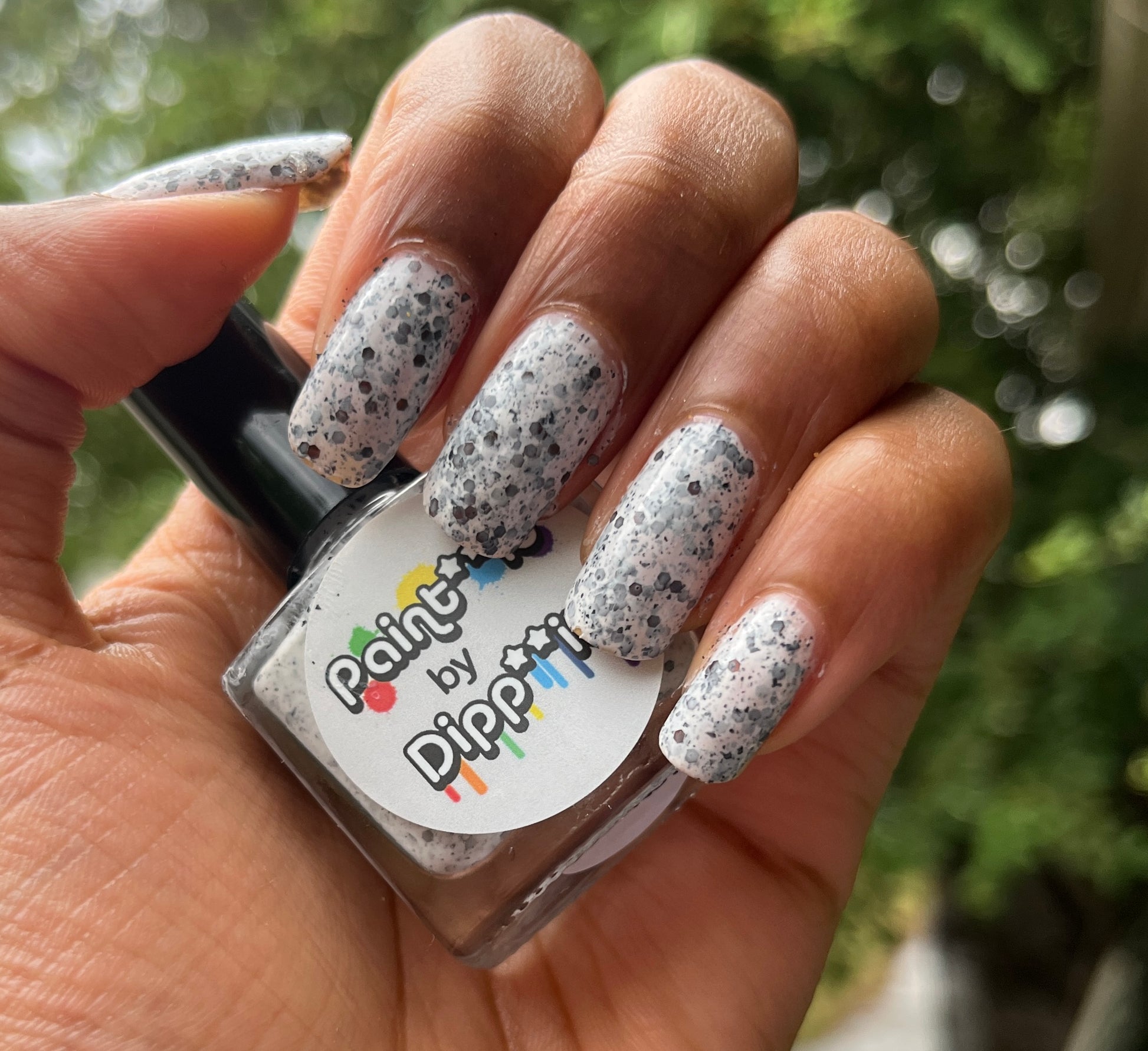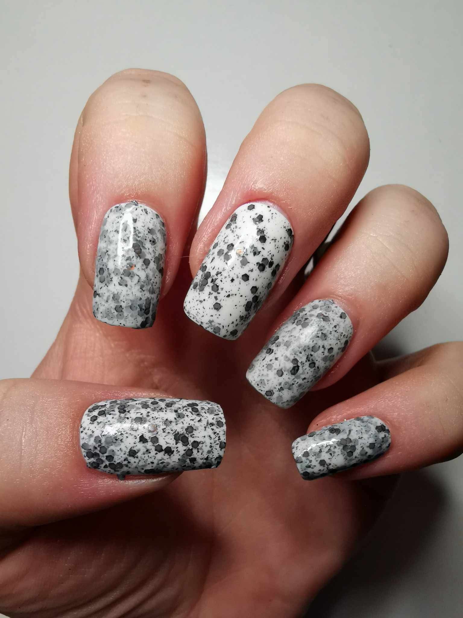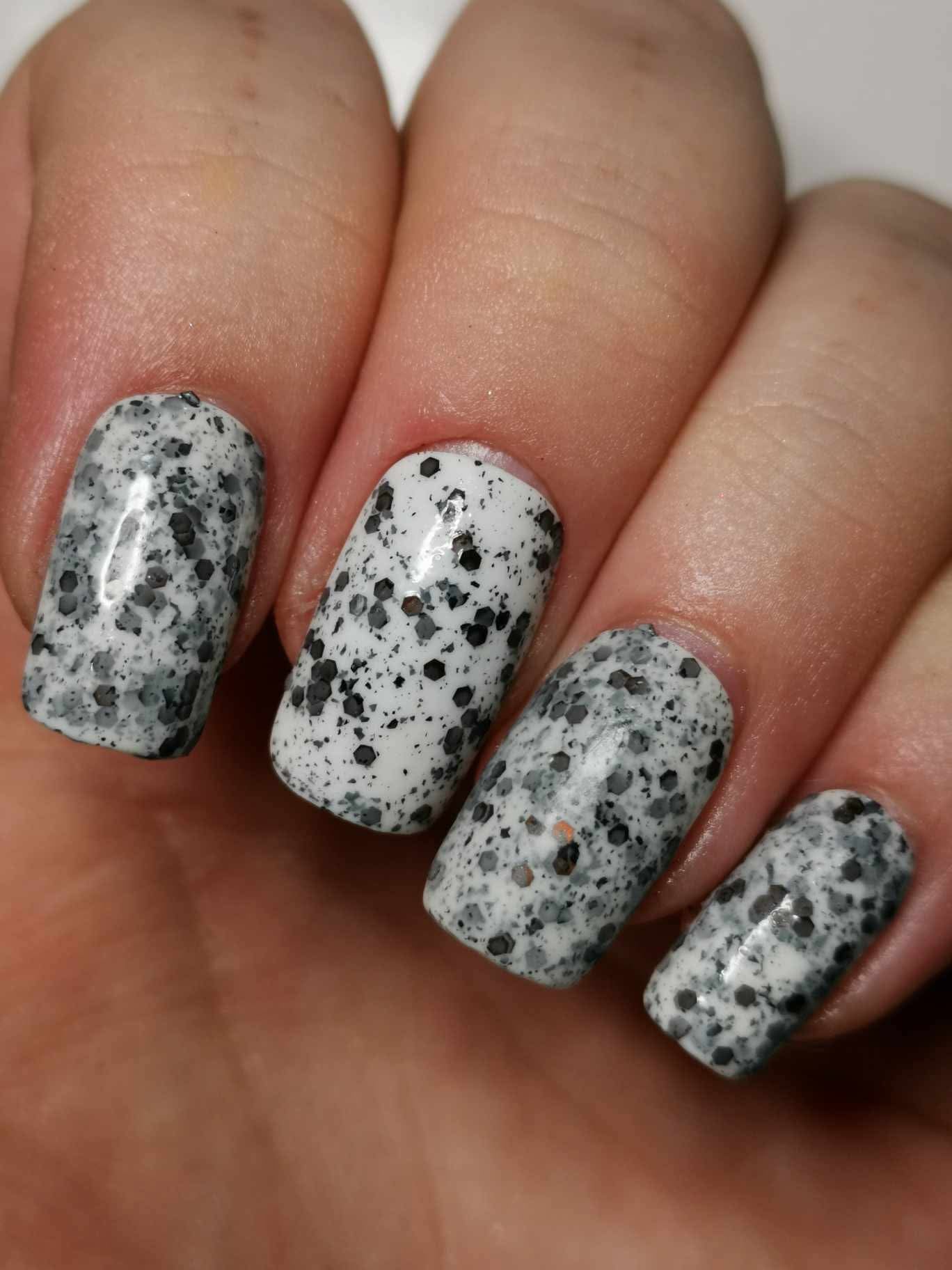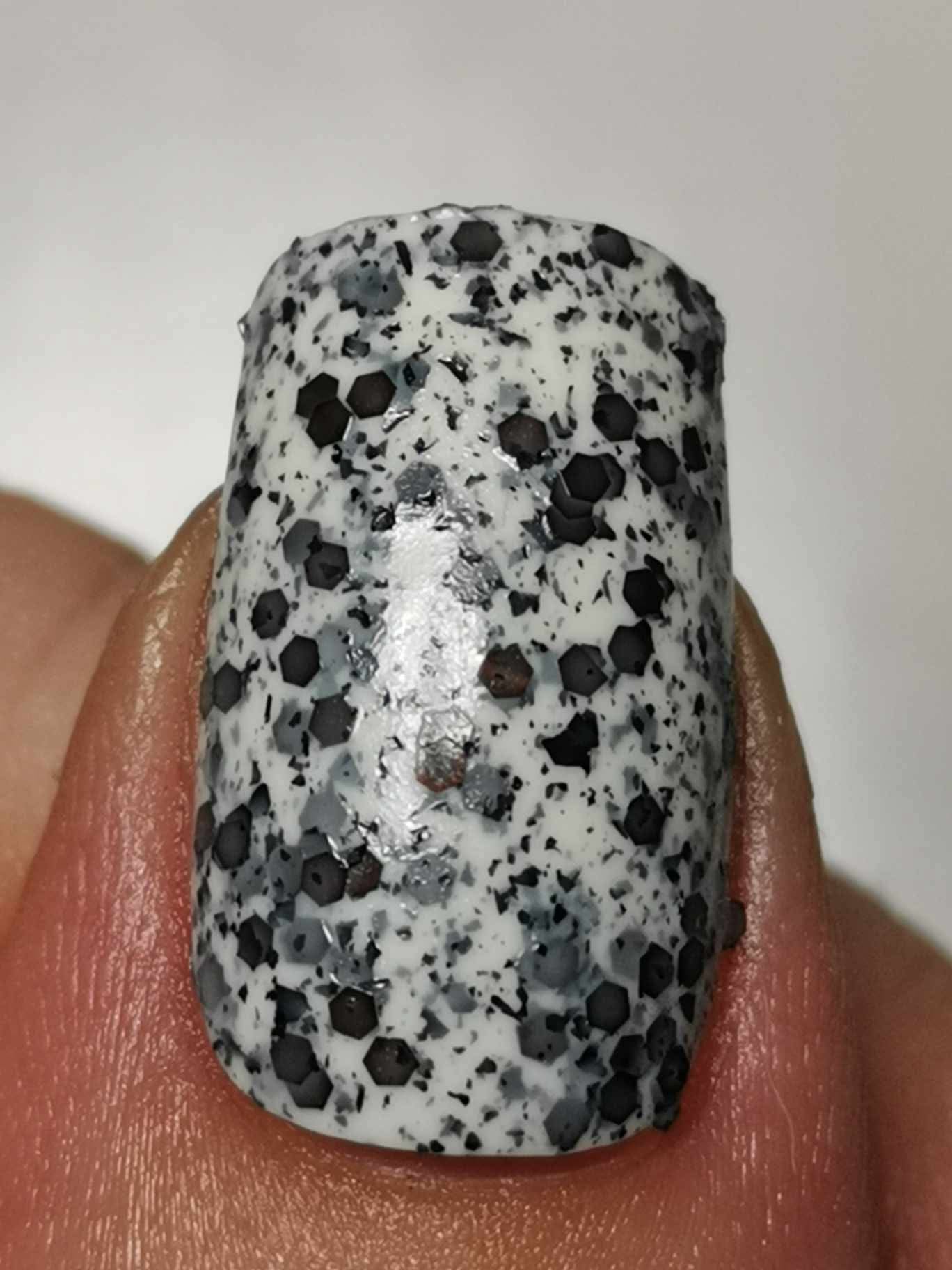 Coconut is a white crelly polish filled with shiny brown hex glitter and black micro flakes. It can be worn in one or two coats.