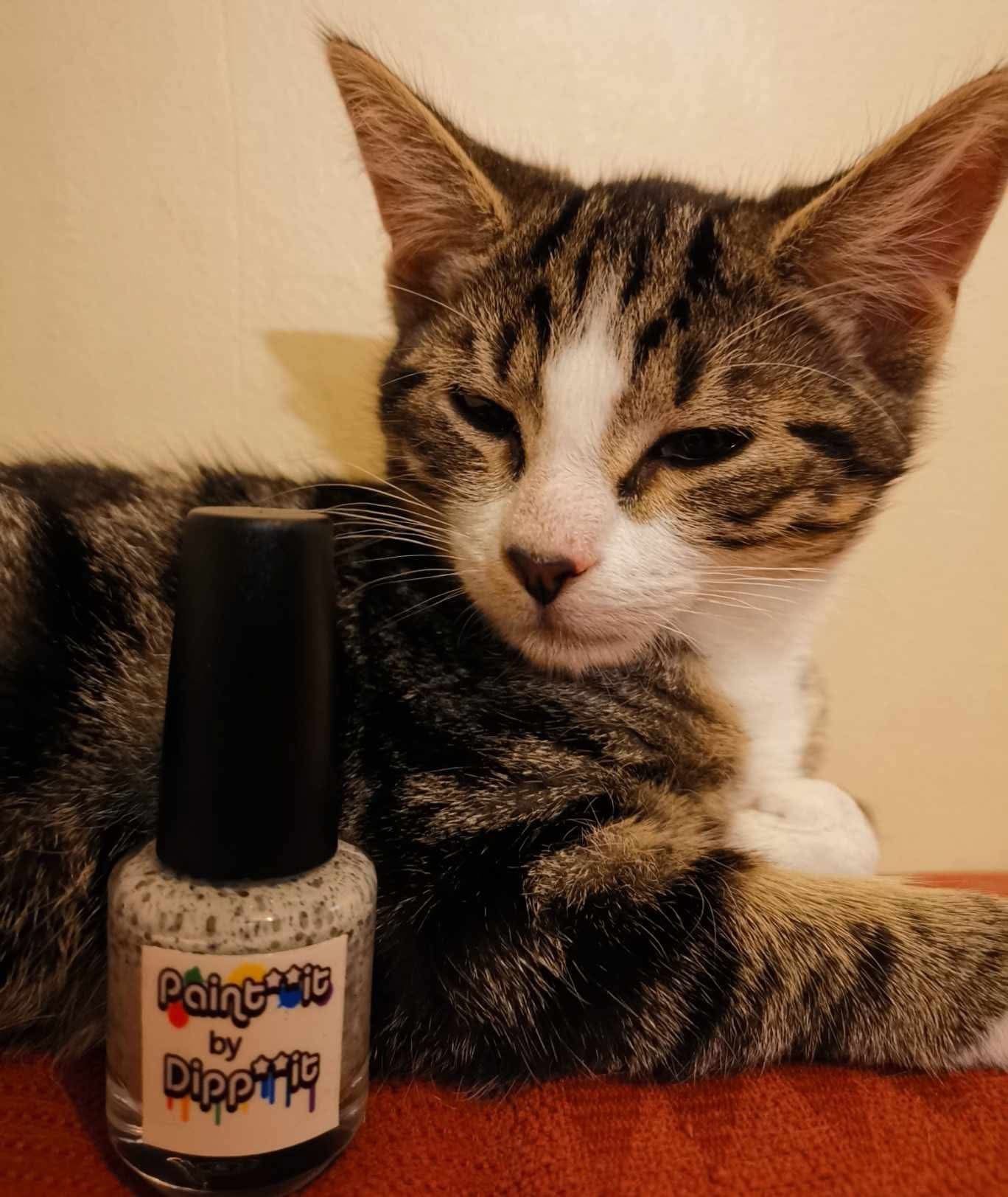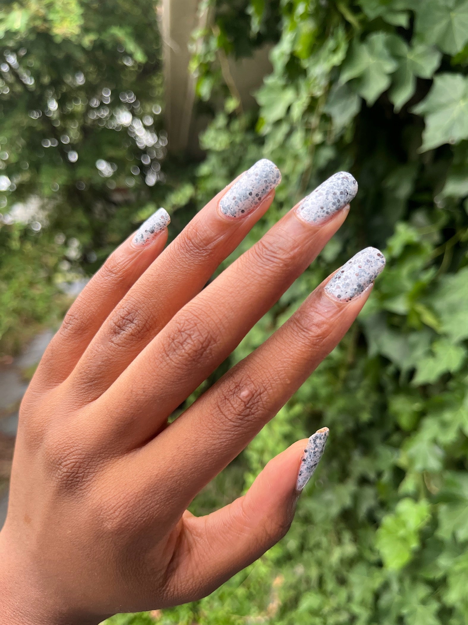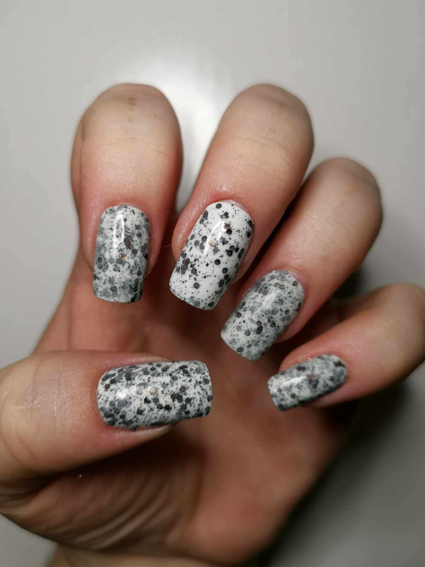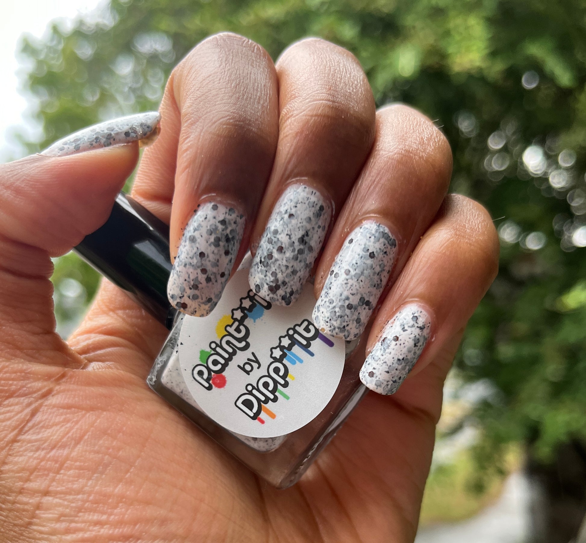 Coconut is a white crelly polish filled with shiny brown hex glitter and black micro flakes. It can be worn in one or two coats.