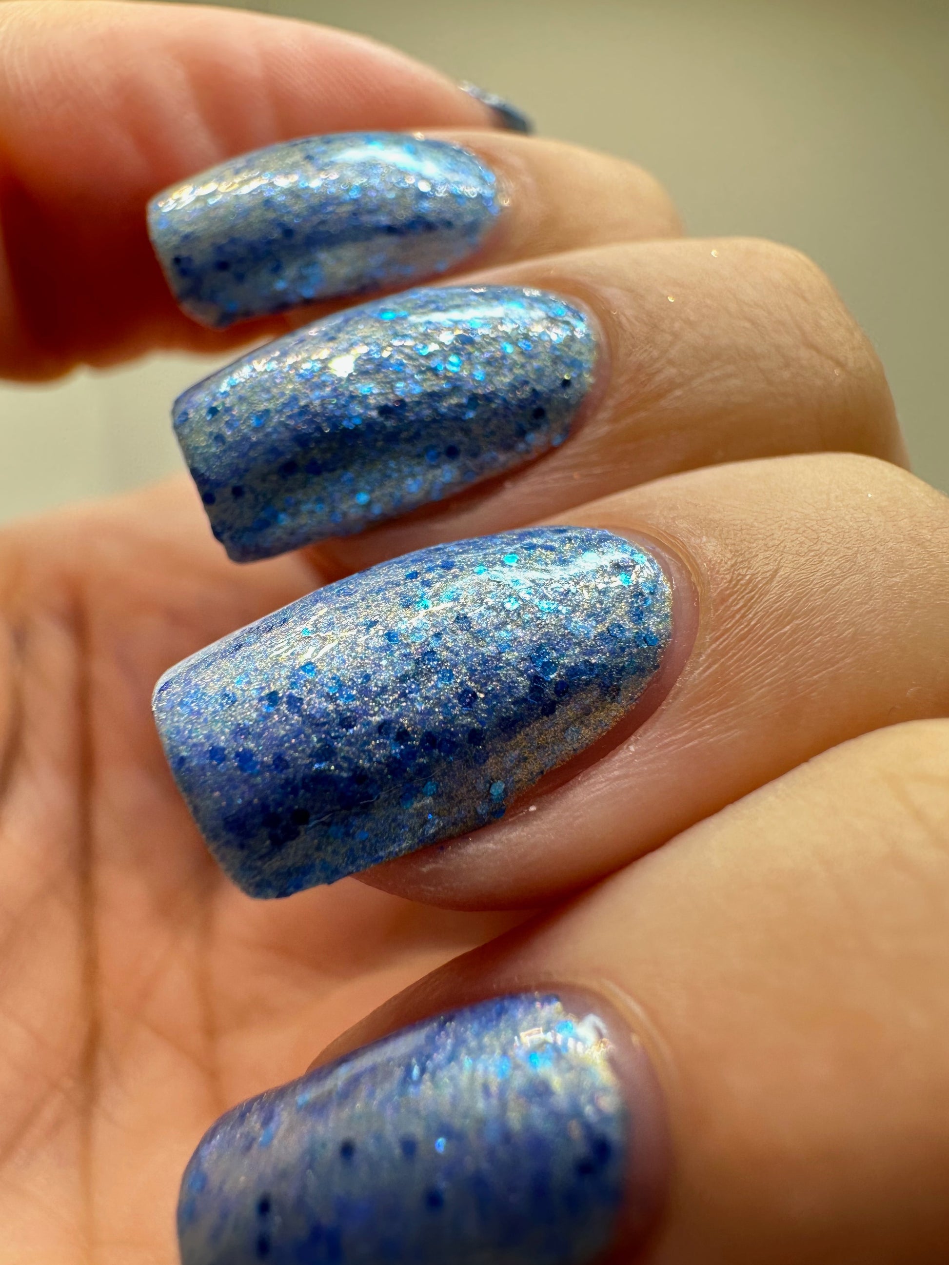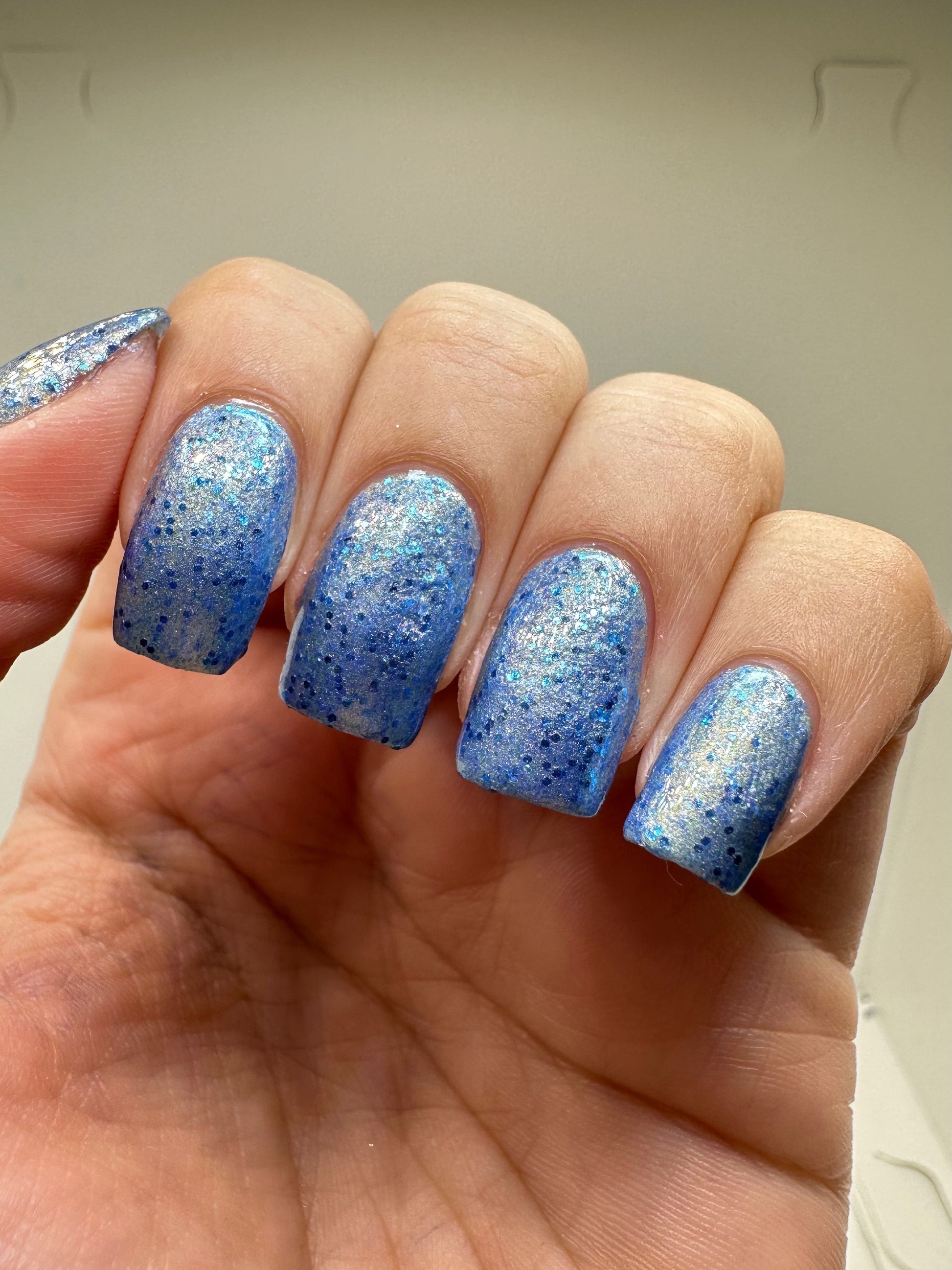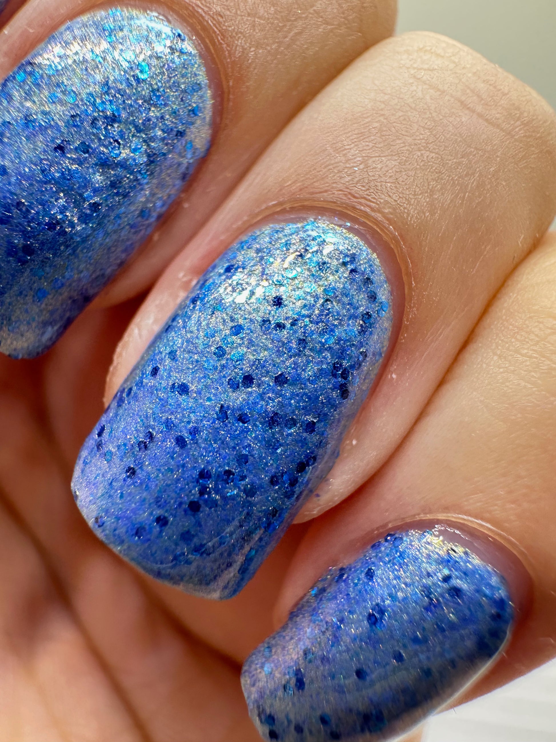 Cool Chemist is inspired by Frost and is a shimmery pale blue polish filled with shiny, dark blue glitter.