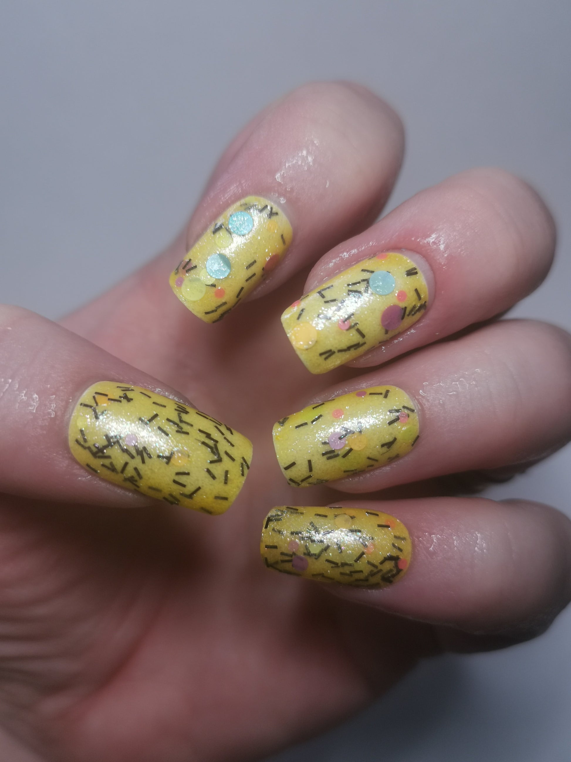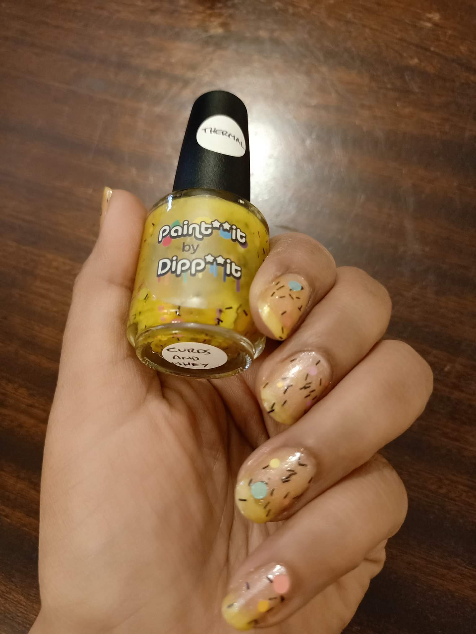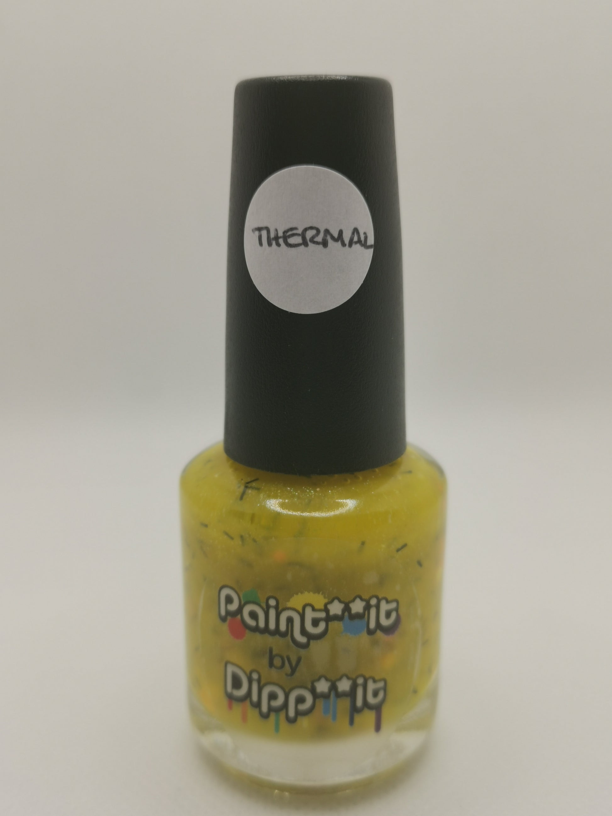 Inspired by Little Miss Muffet, this is a yellow to pale yellow thermal* filled with rainbow confetti glitter and black slices.