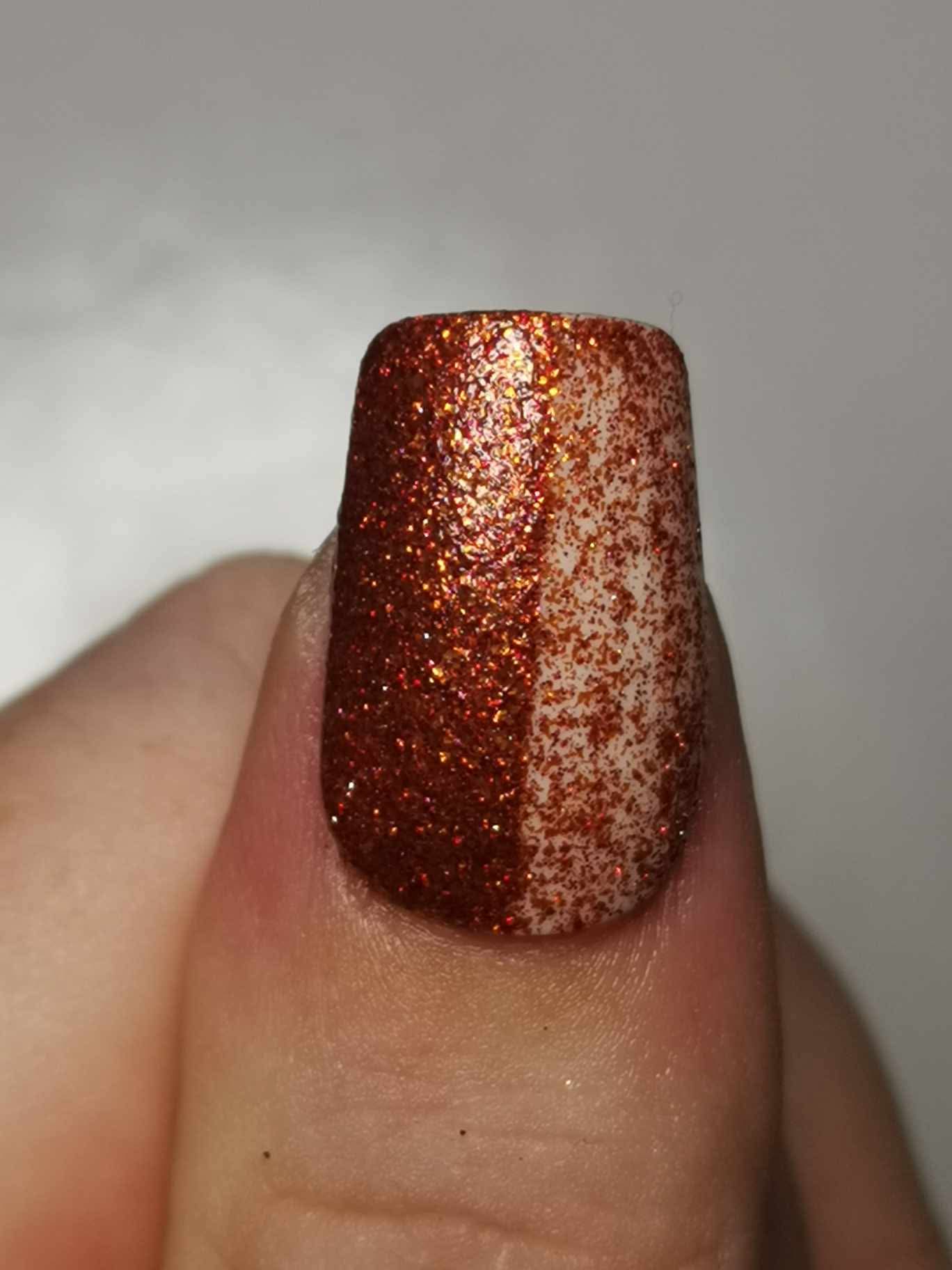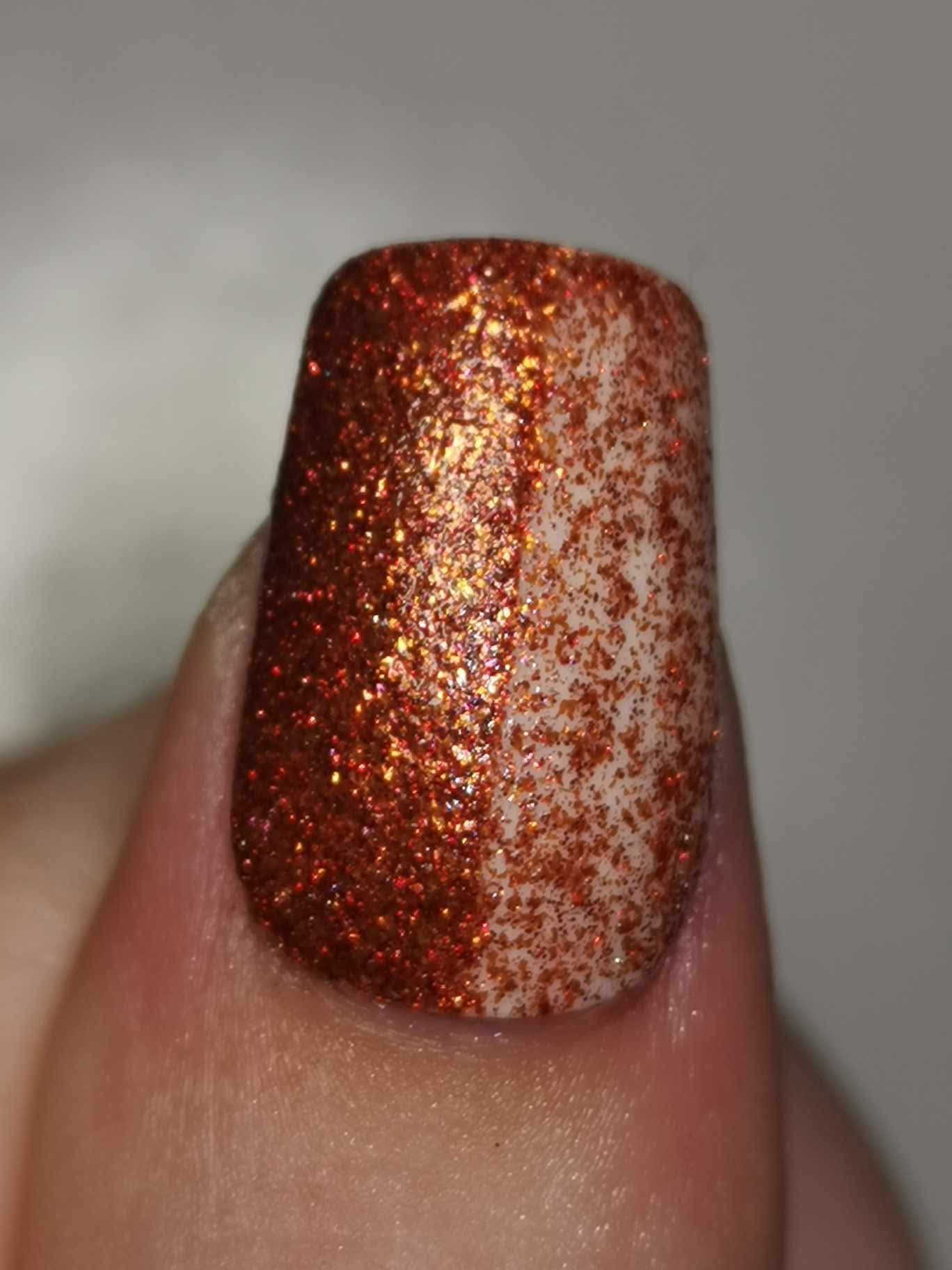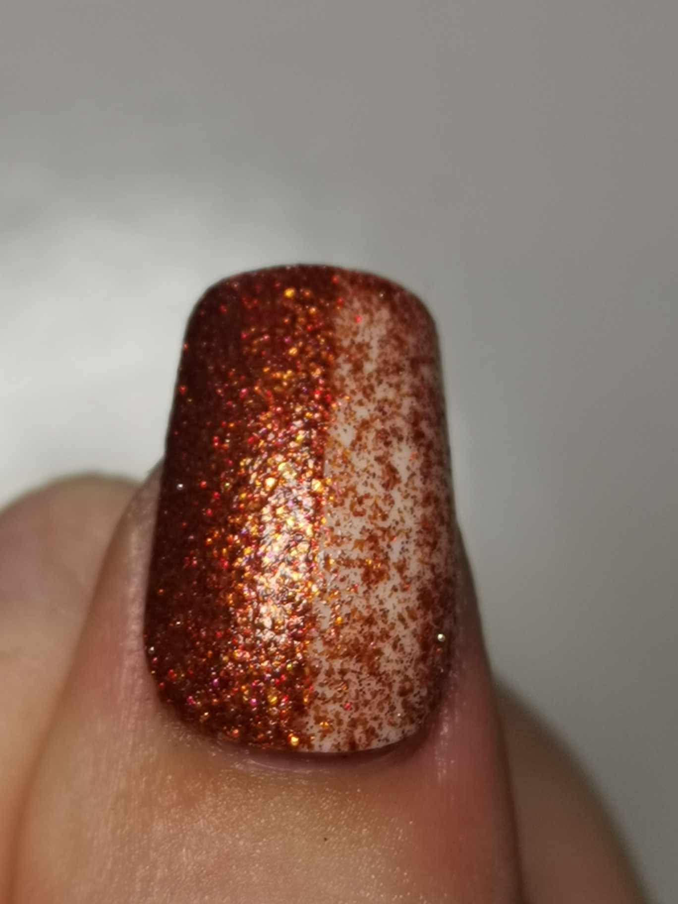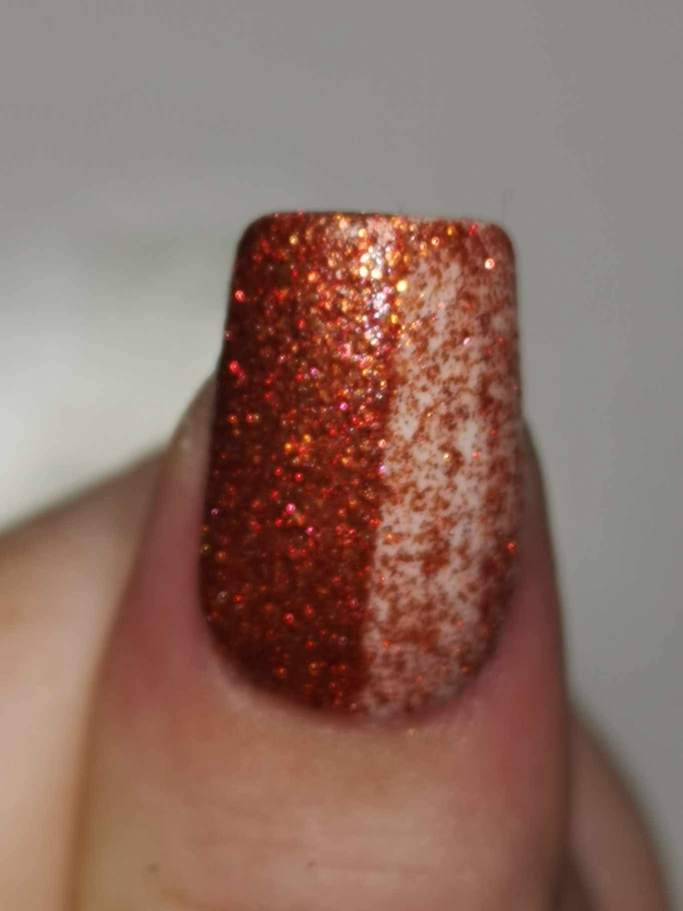 is a rust micro flake polish filled with fine ruby red holographic glitter, and red reflective glitter.
