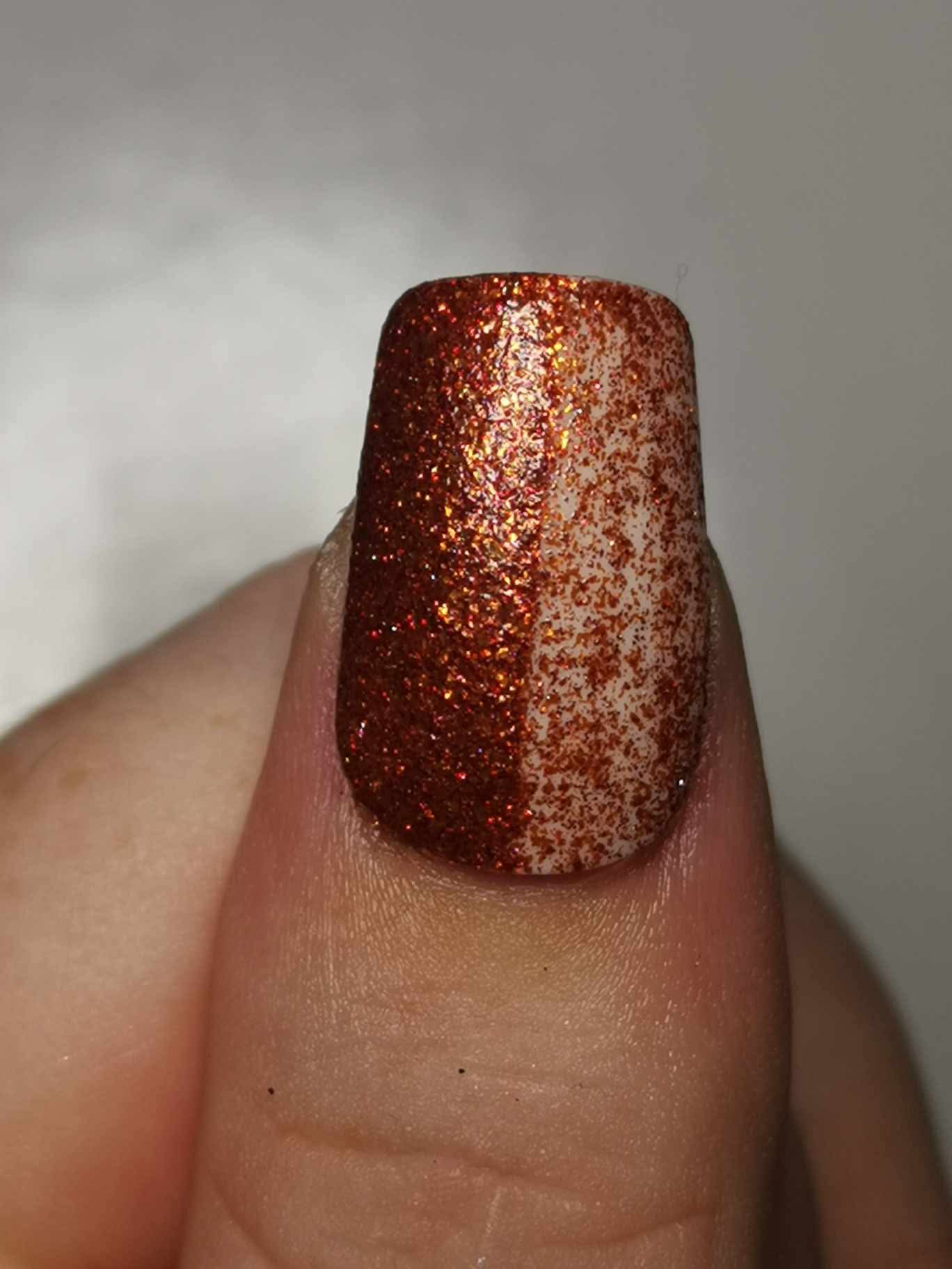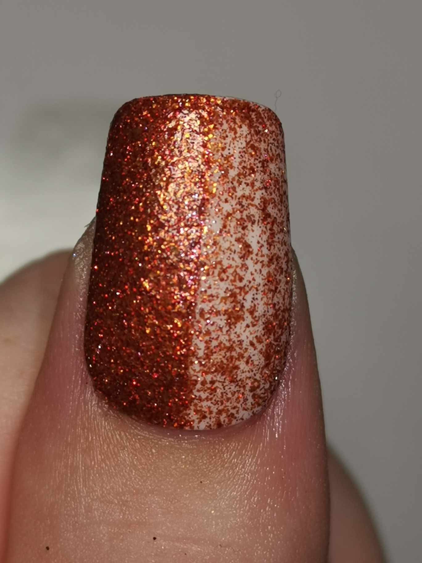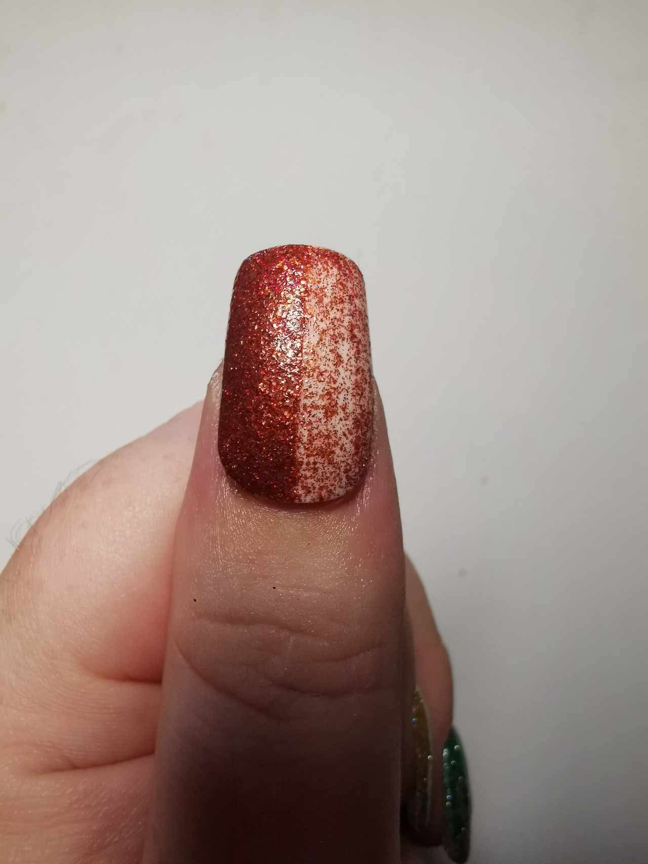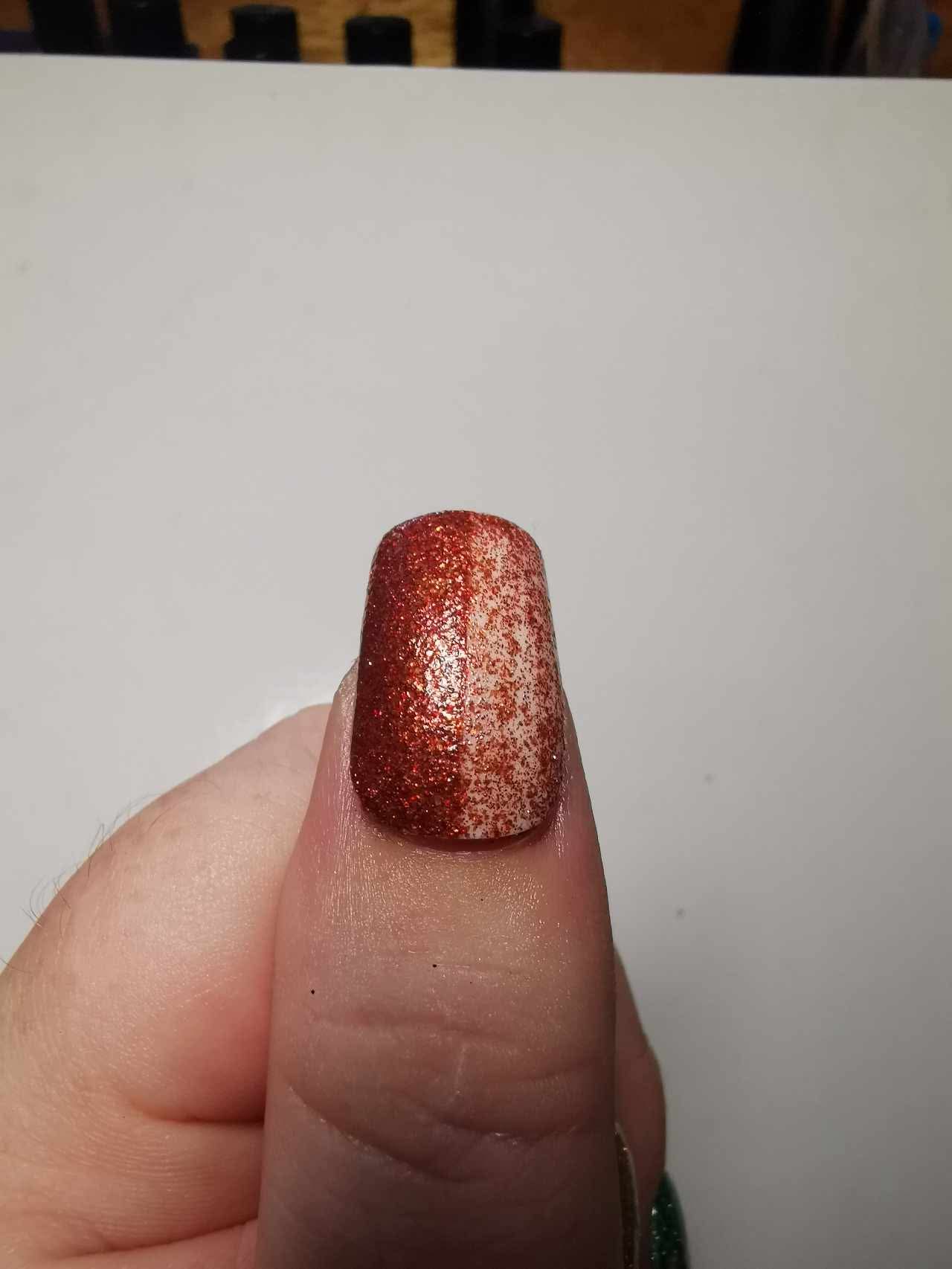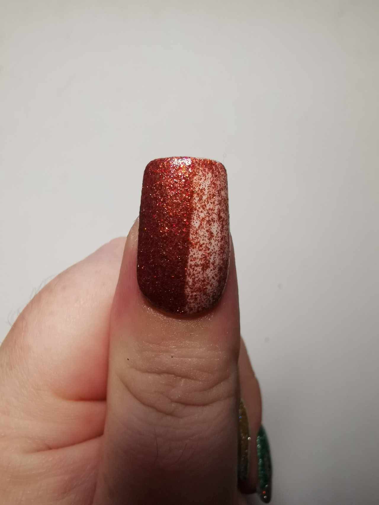 is a rust micro flake polish filled with fine ruby red holographic glitter, and red reflective glitter.