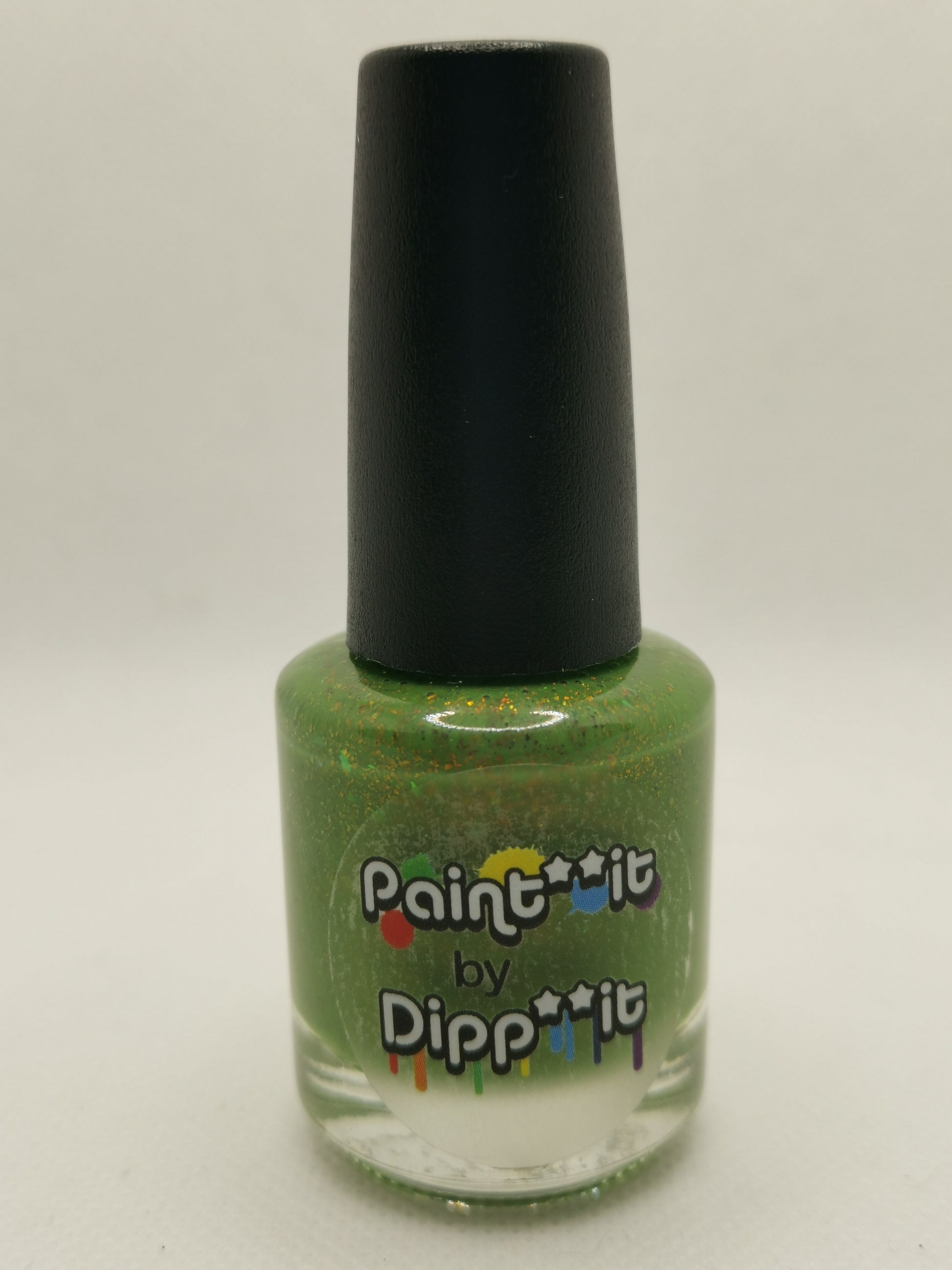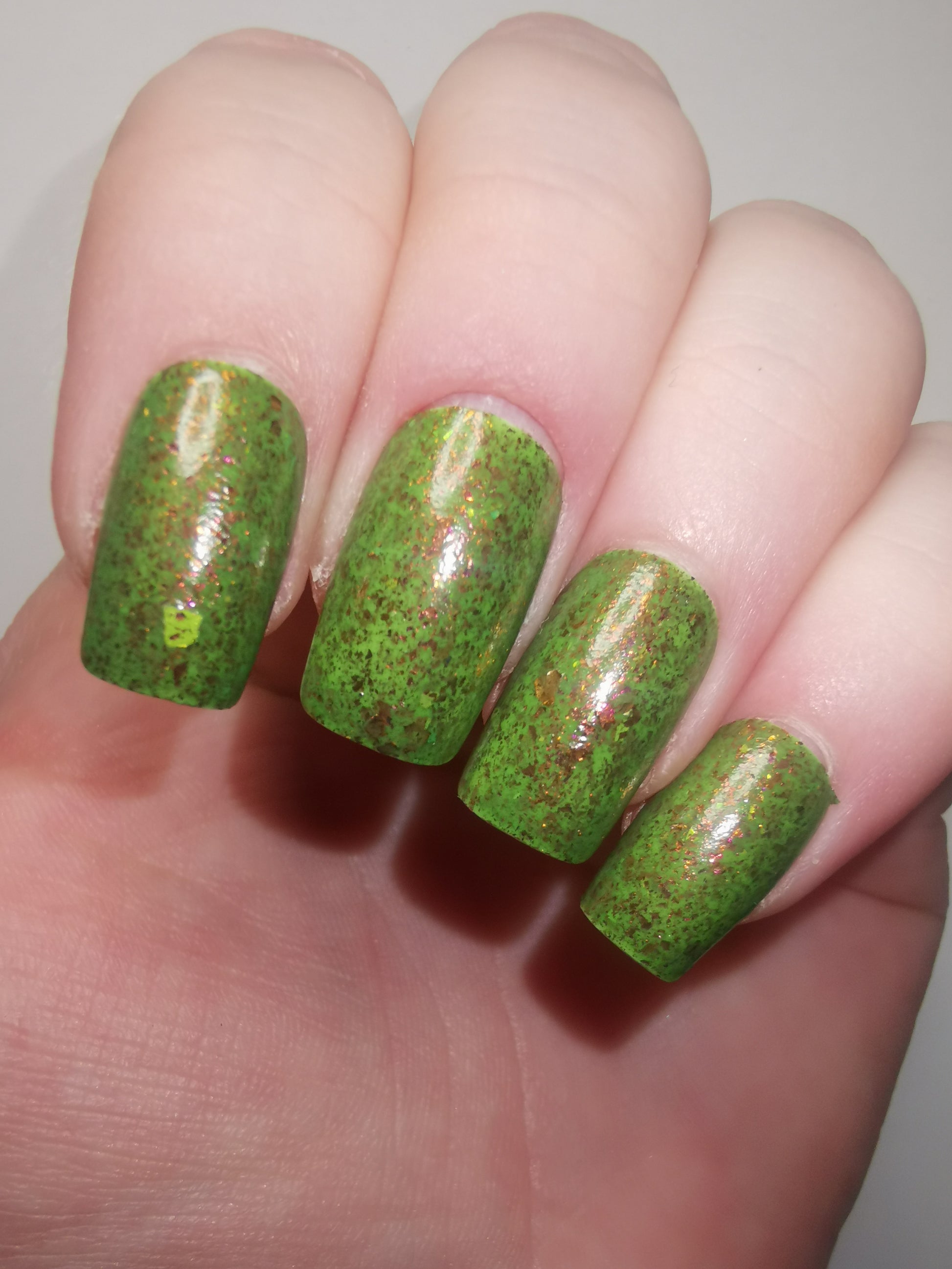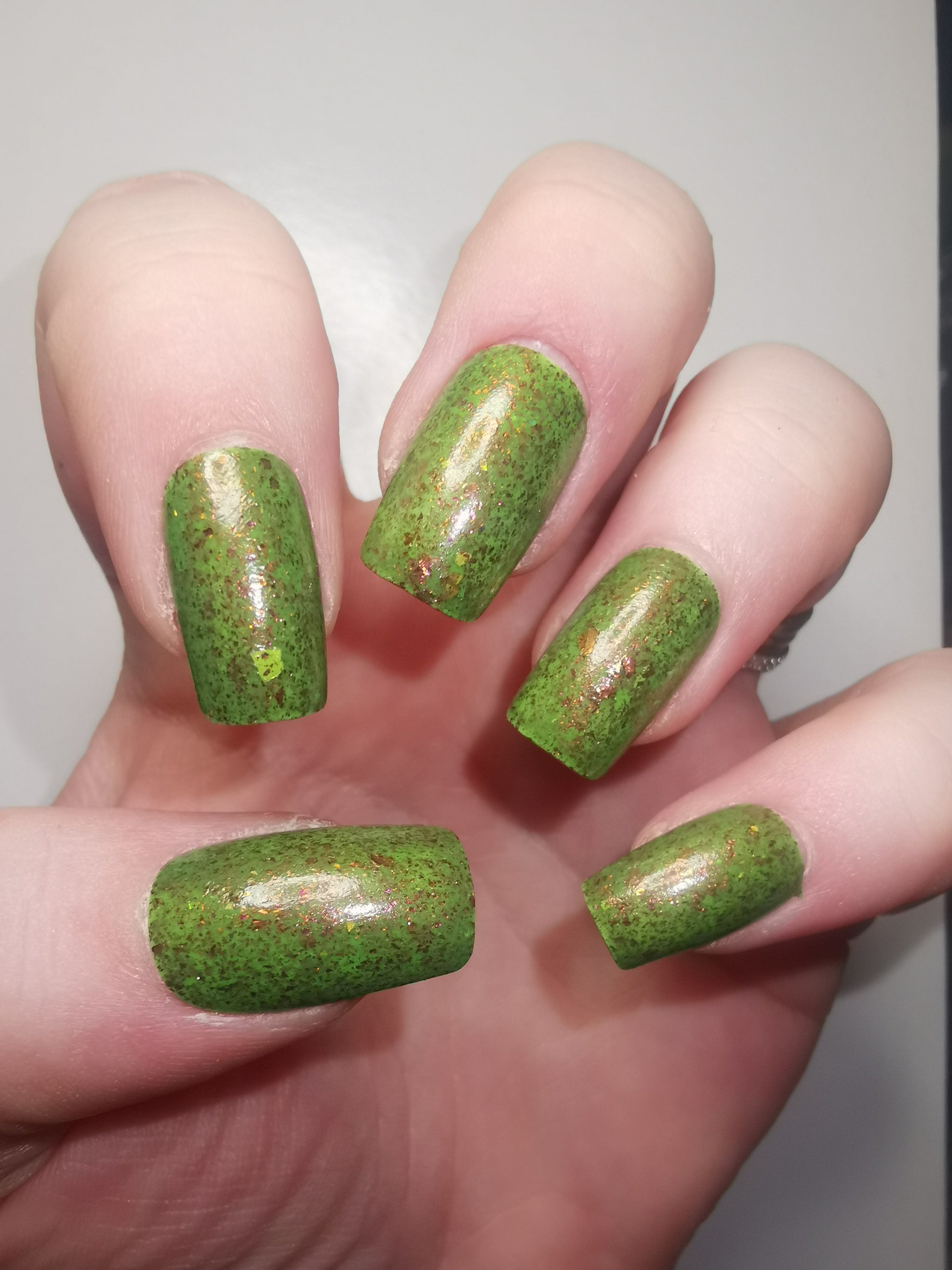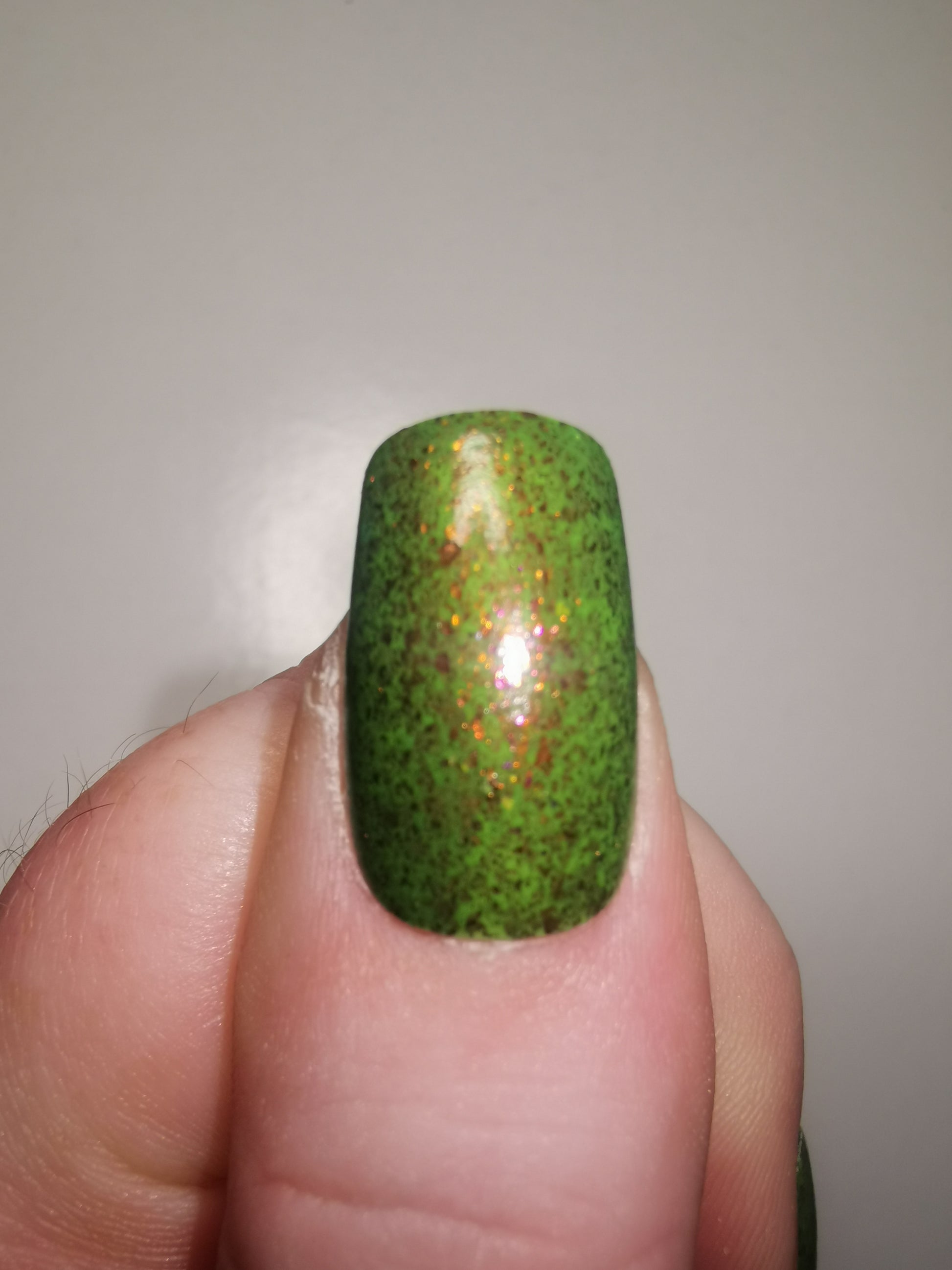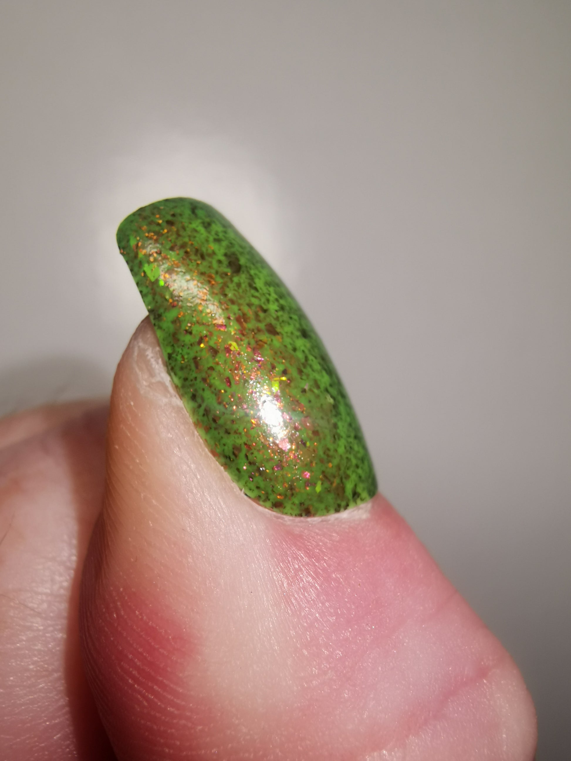 A green crelly base filled with bronze/gold/red colour shifting flakes and pink/green/gold iridescent flakes.