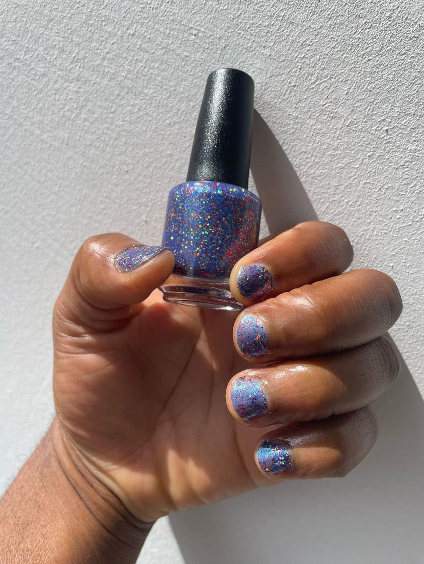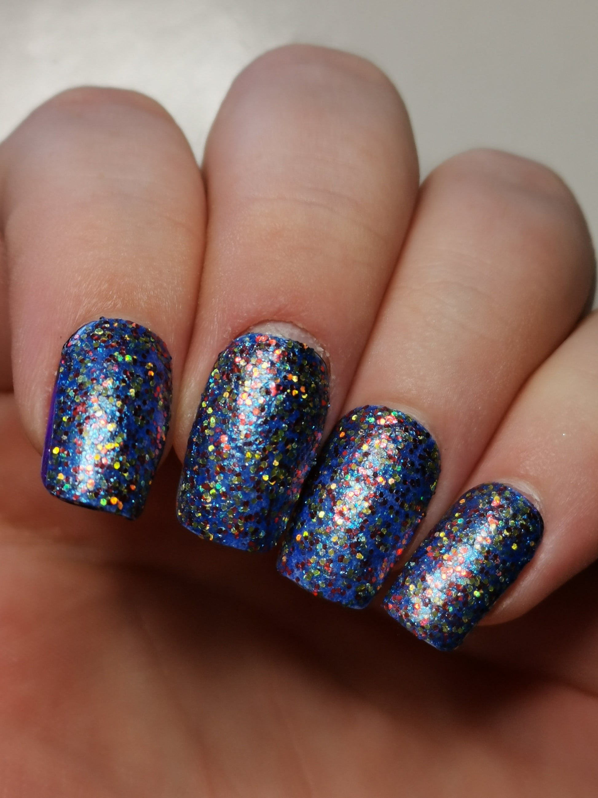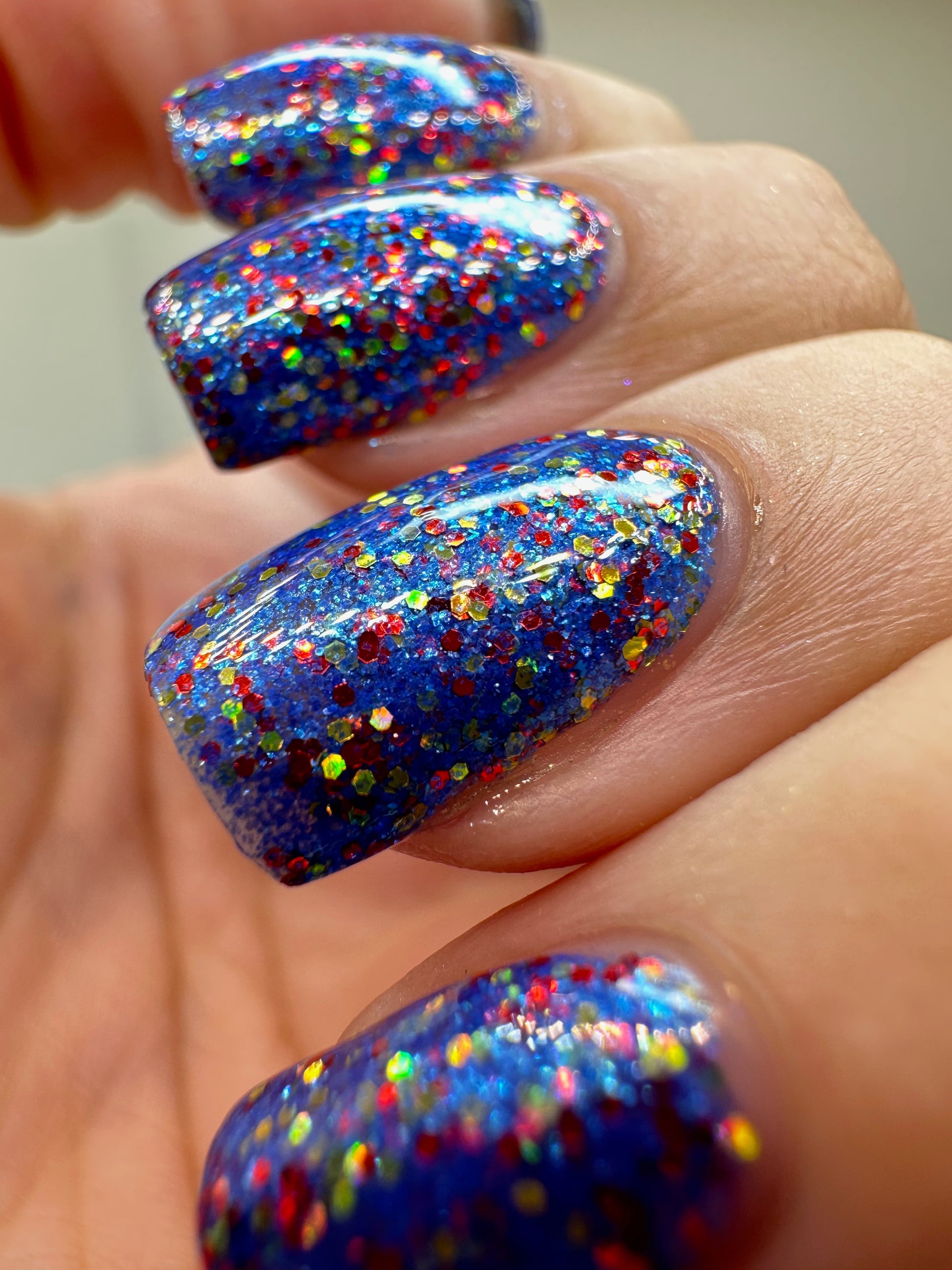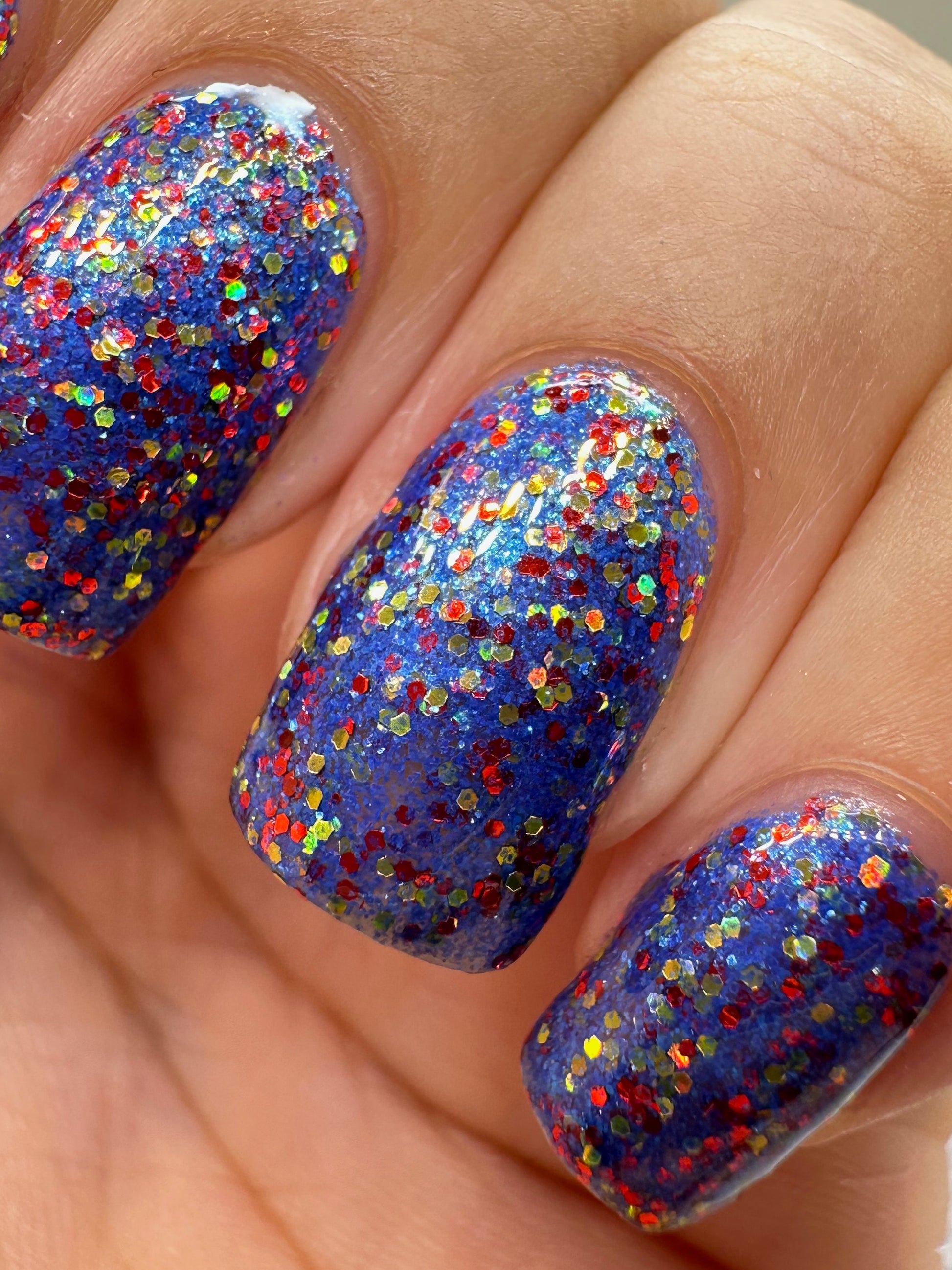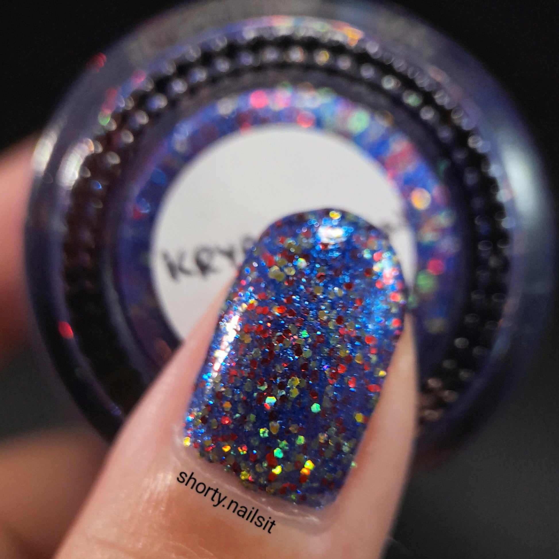 Kryptonian Kara is inspired by Supergirl and a blue microflake polish filled with yellow holographic glitter, and shiny red glitter.