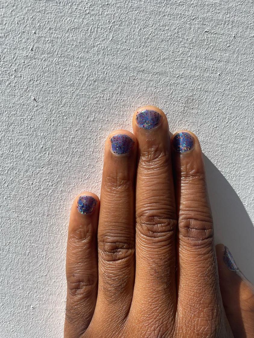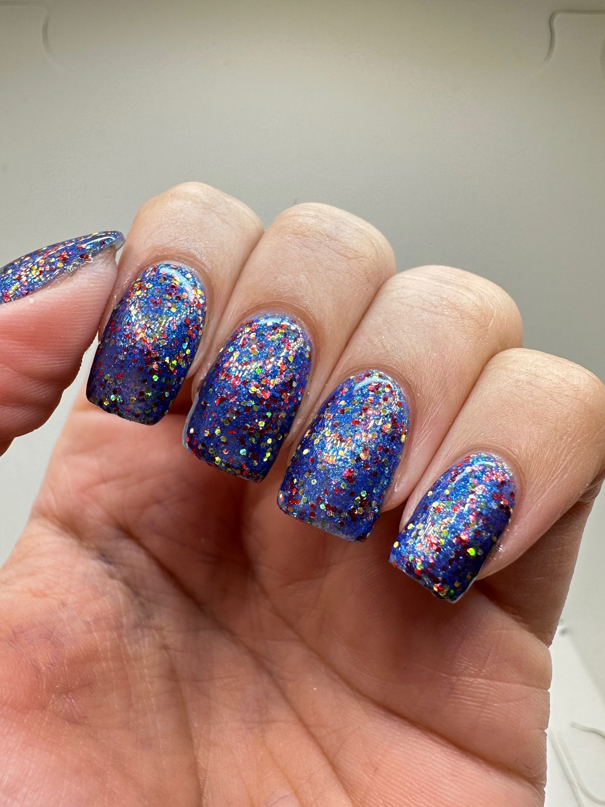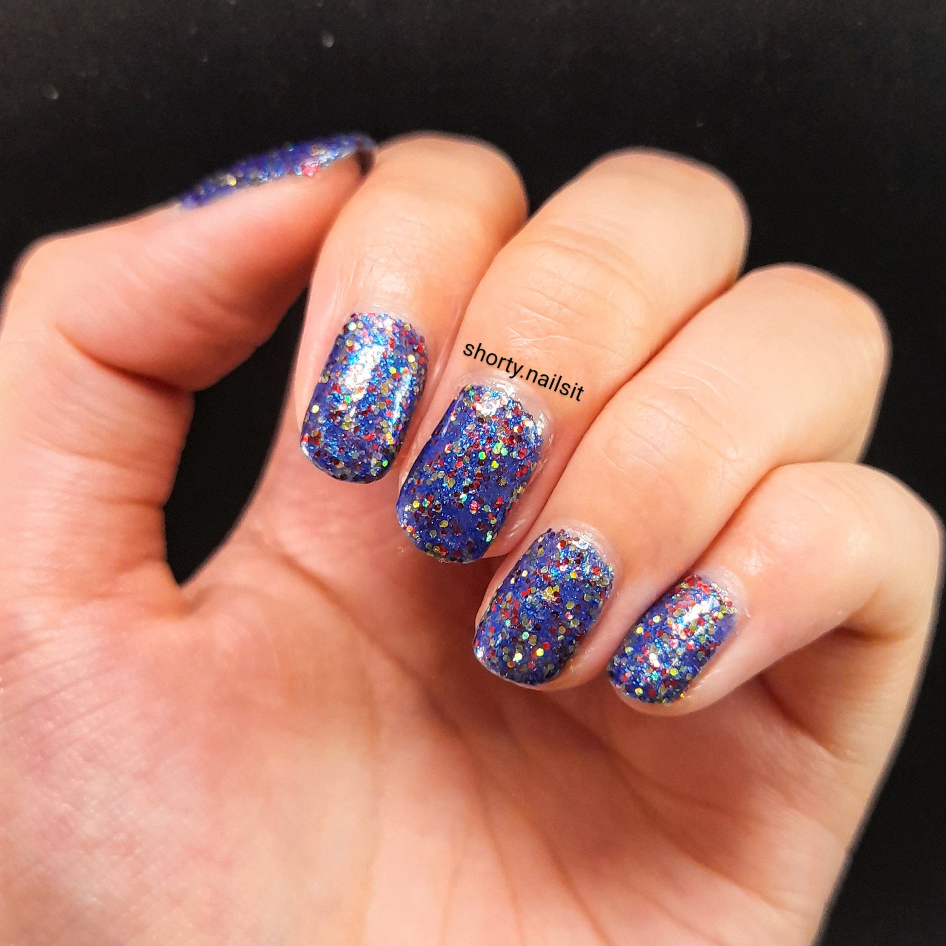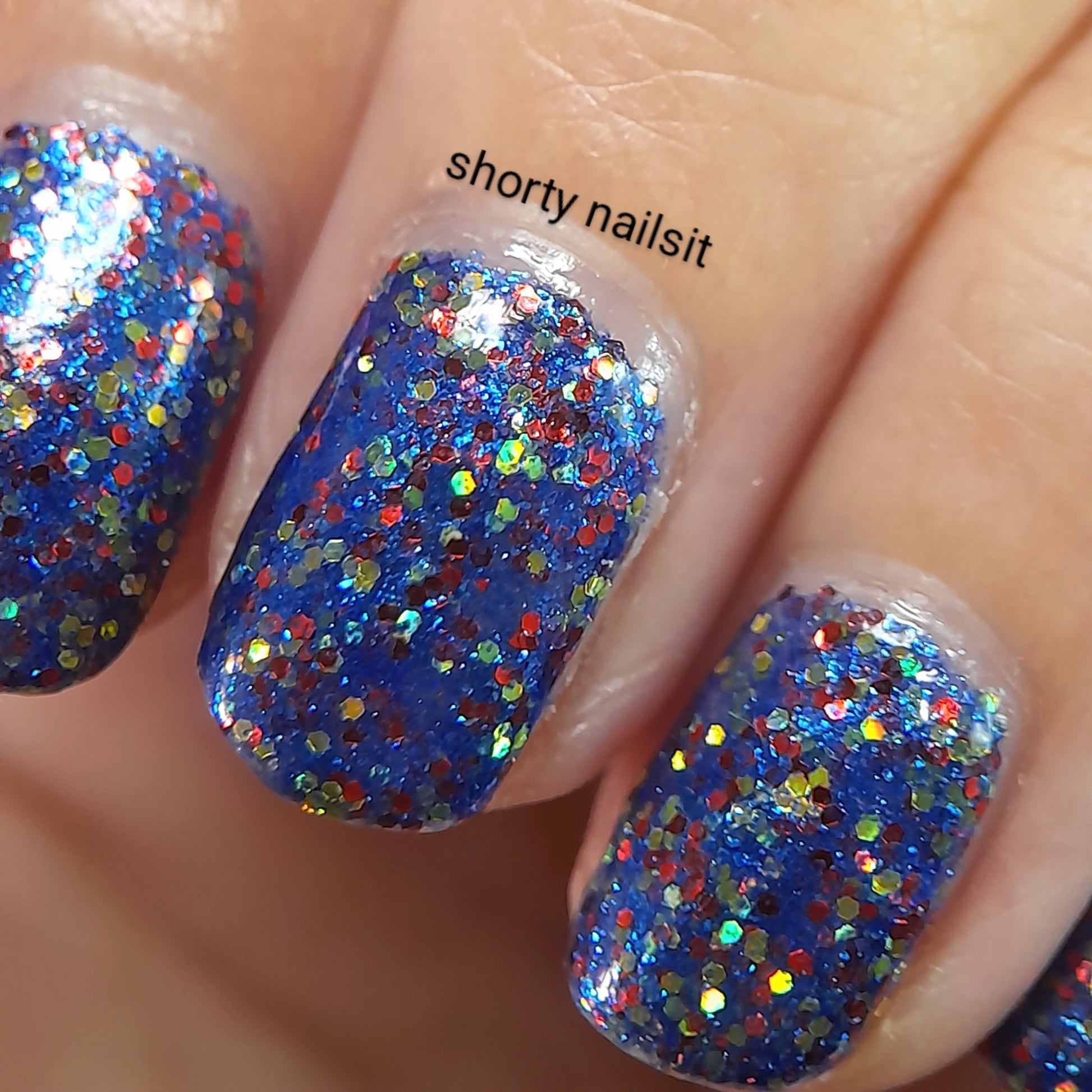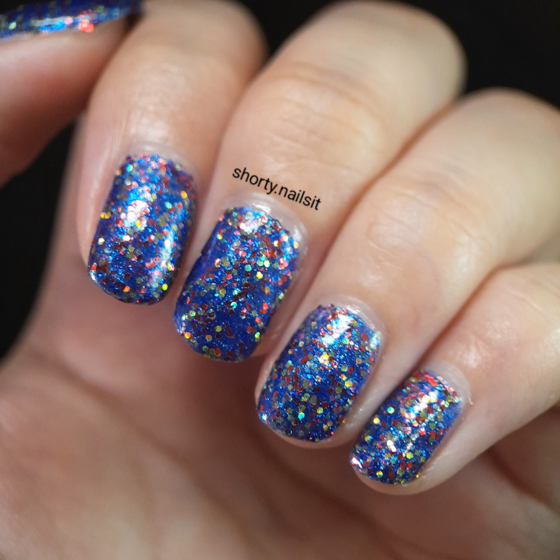 Kryptonian Kara is inspired by Supergirl and a blue microflake polish filled with yellow holographic glitter, and shiny red glitter.