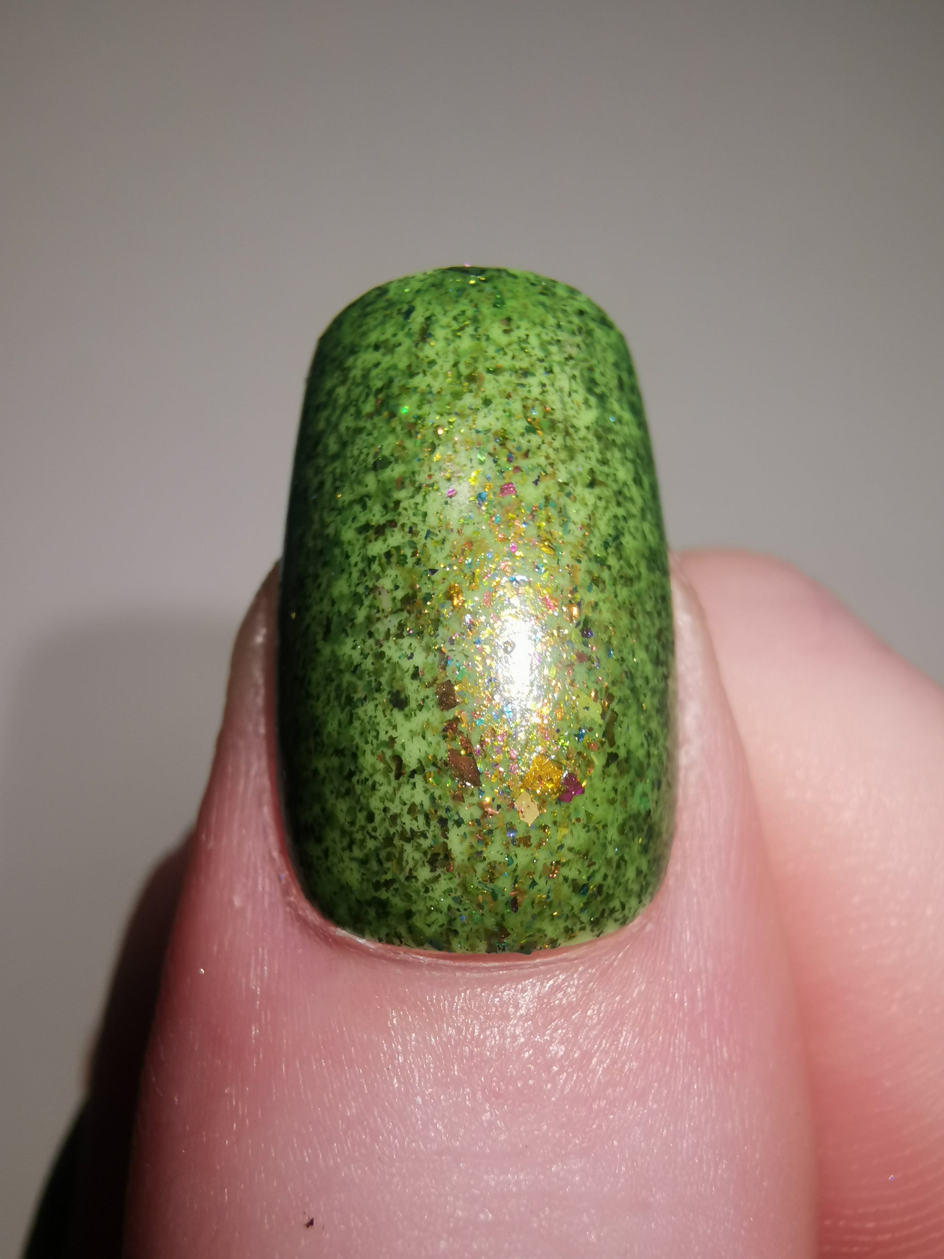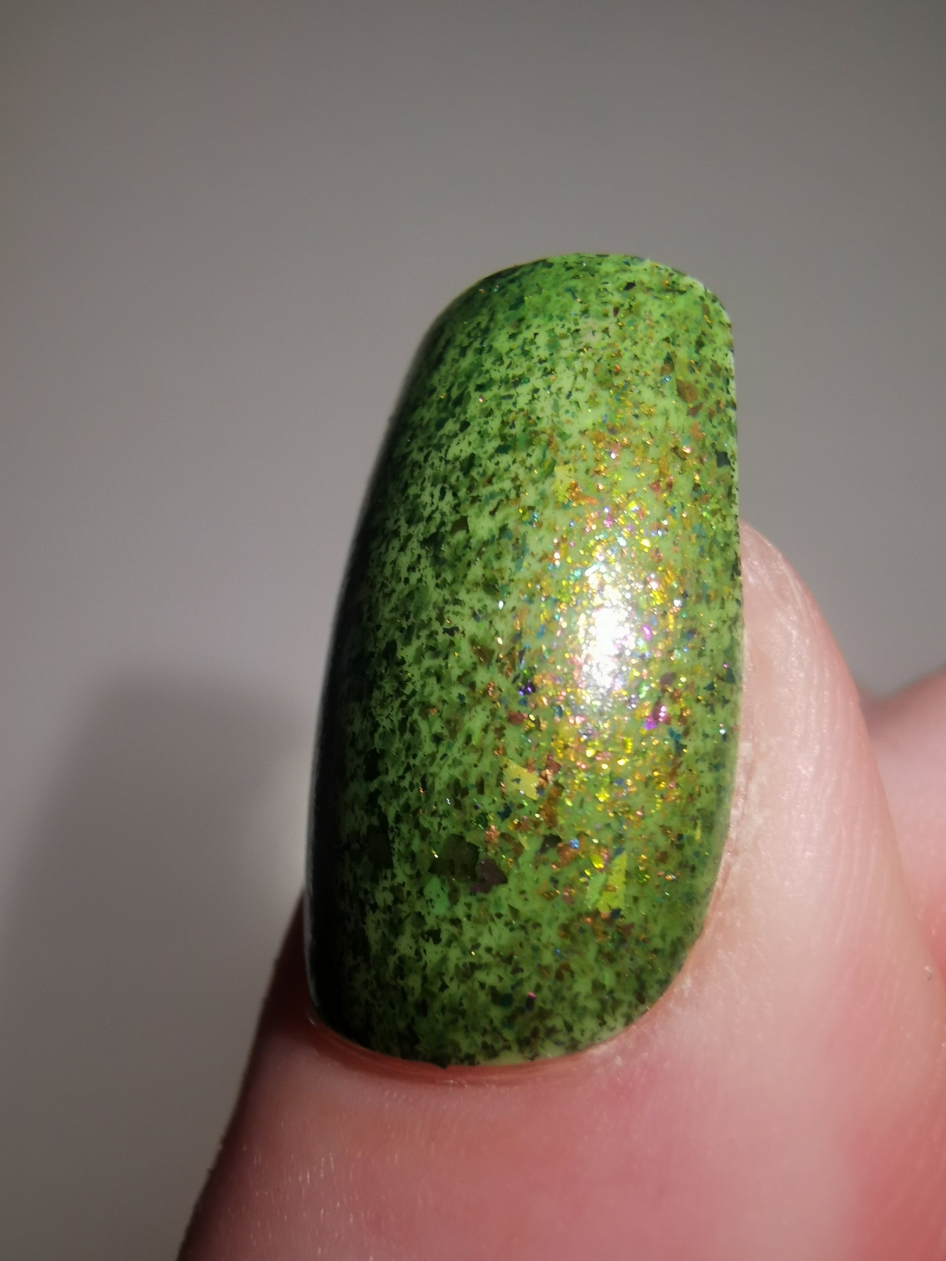 A green crelly base filled with pink/green colour shifting flakes and pink/green/gold iridescent flakes.