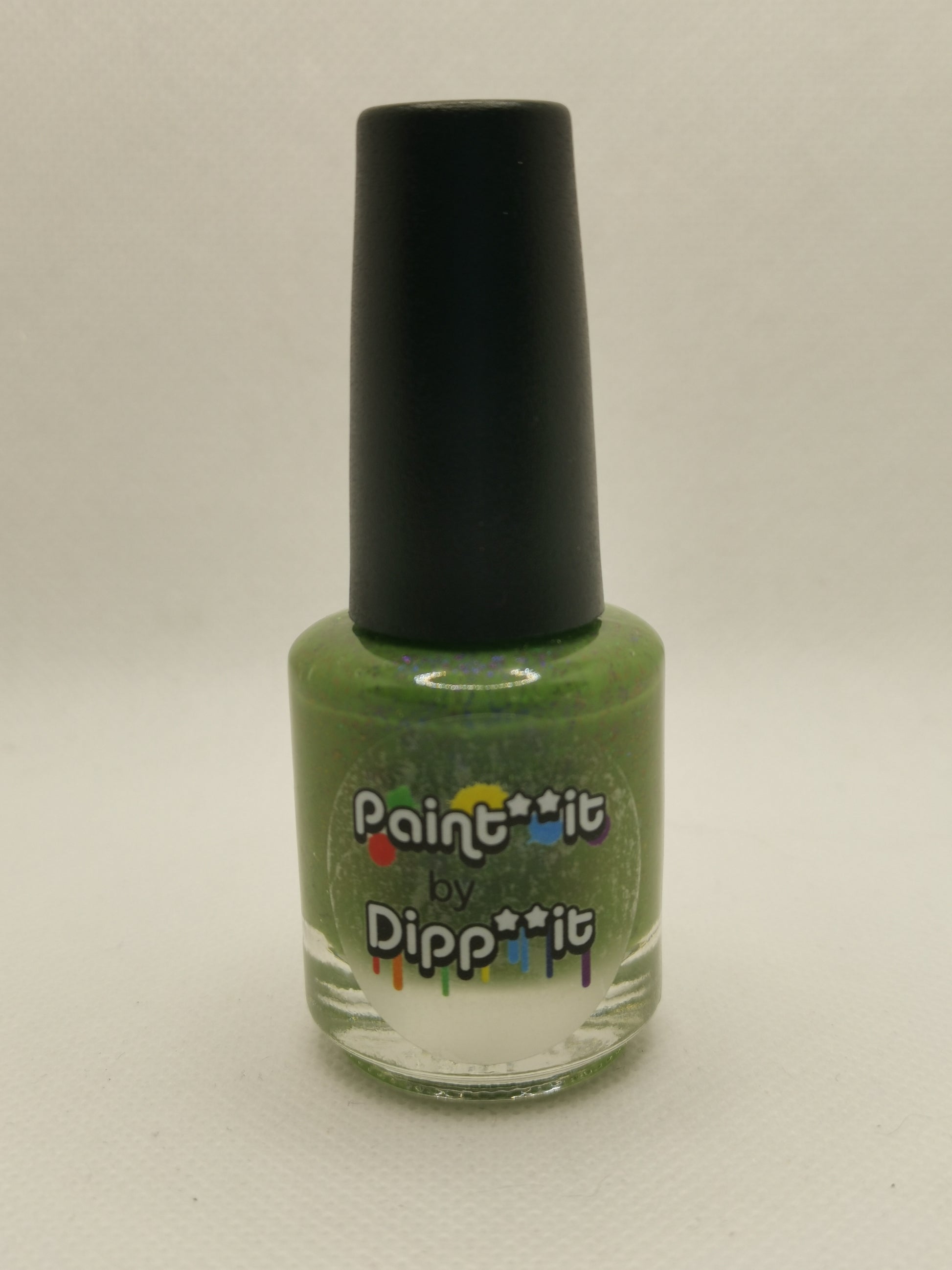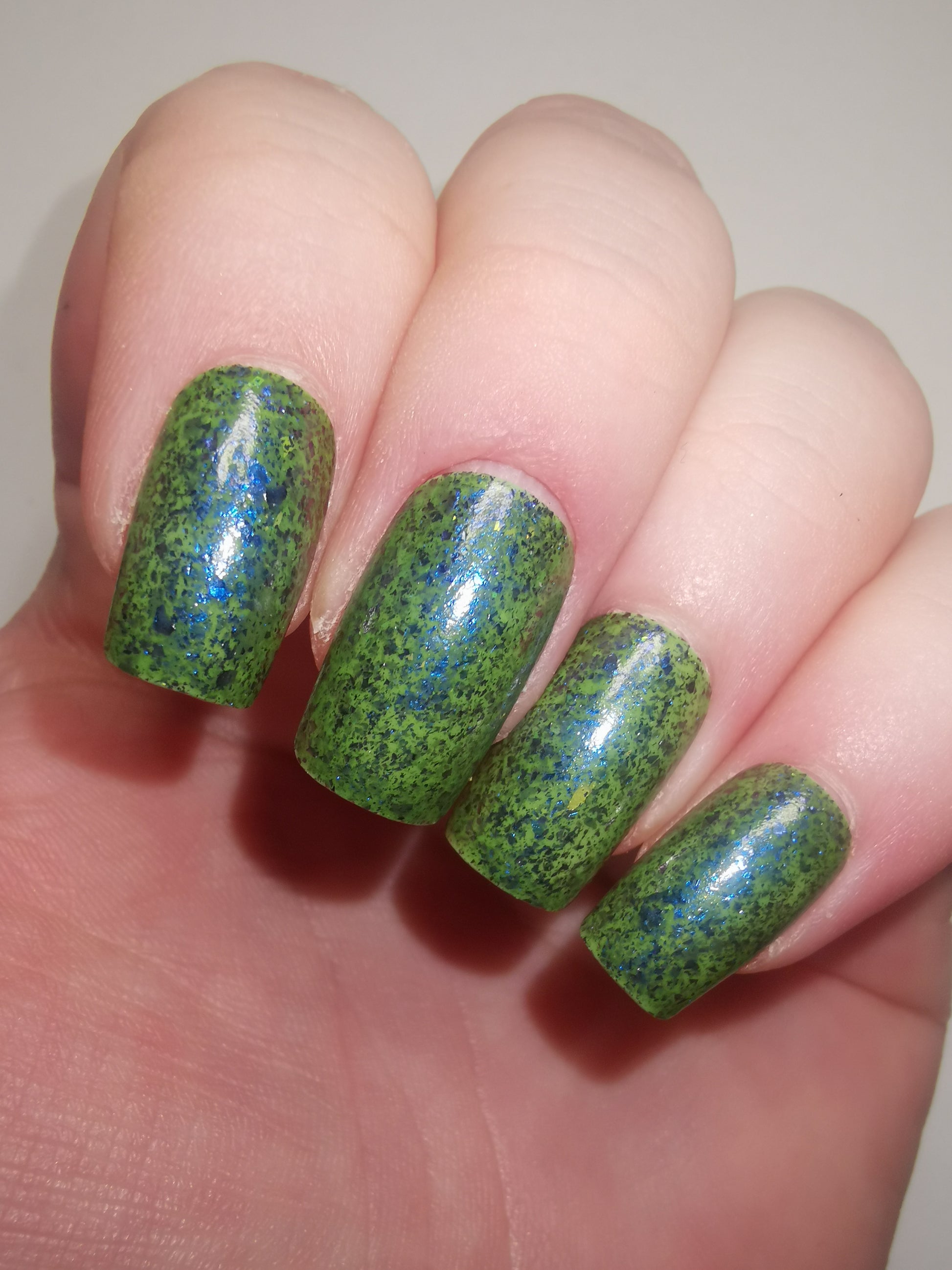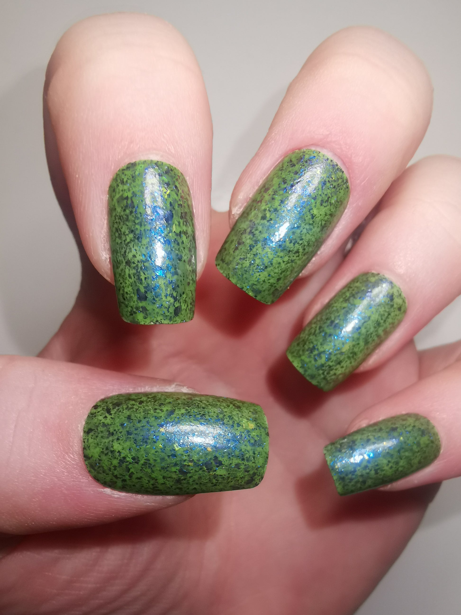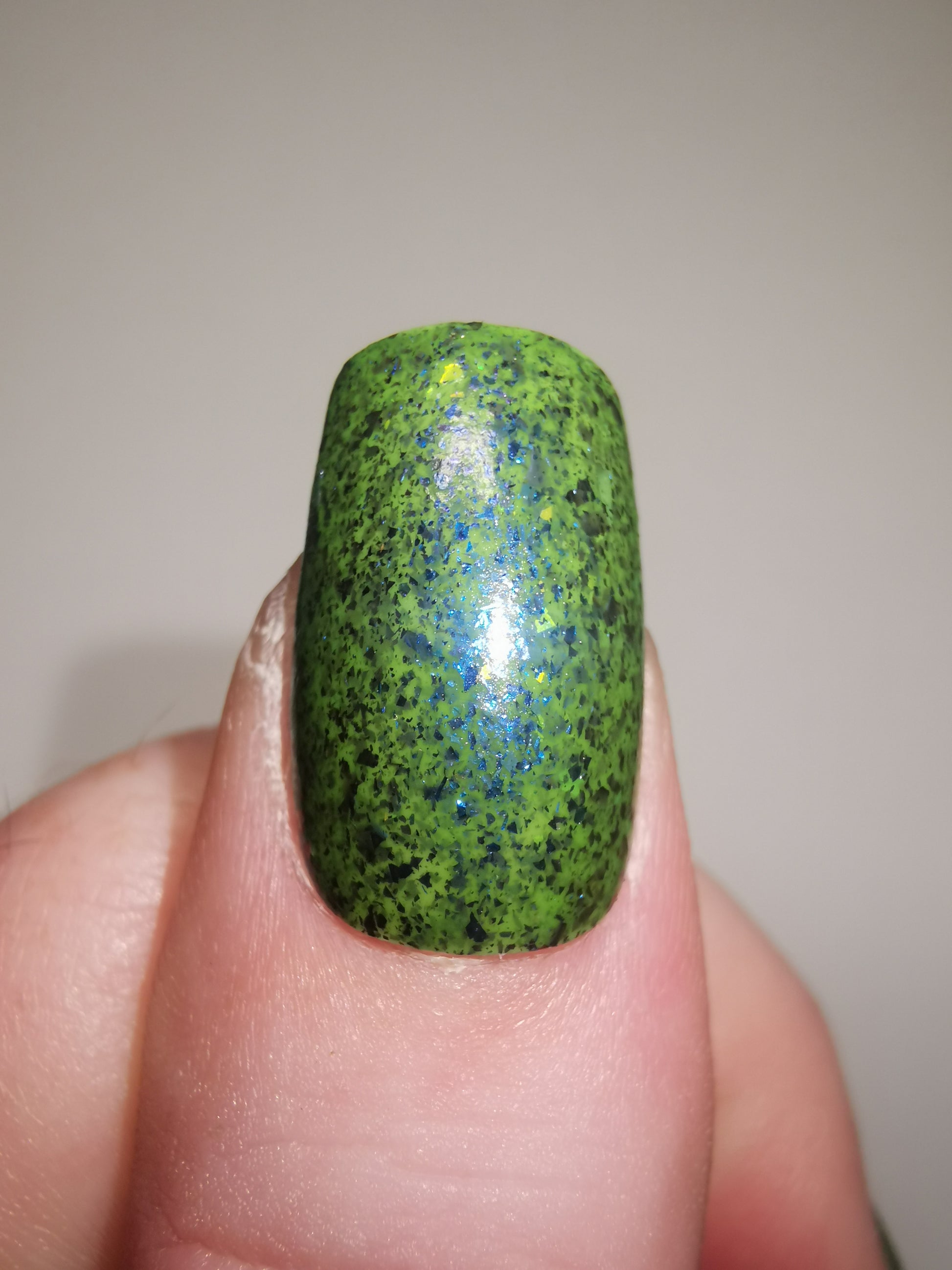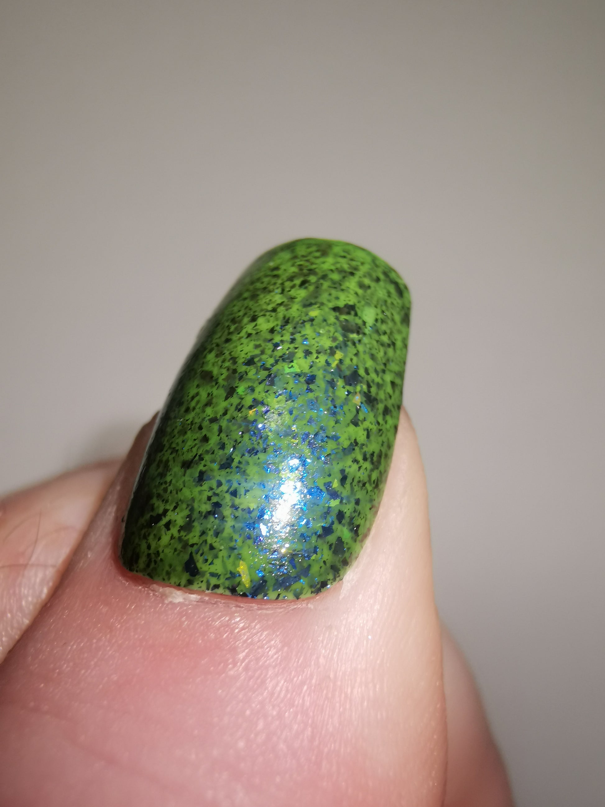 A green crelly base filled with purpe/blue/red colour shifting flakes and pink/green/gold iridescent flakes.