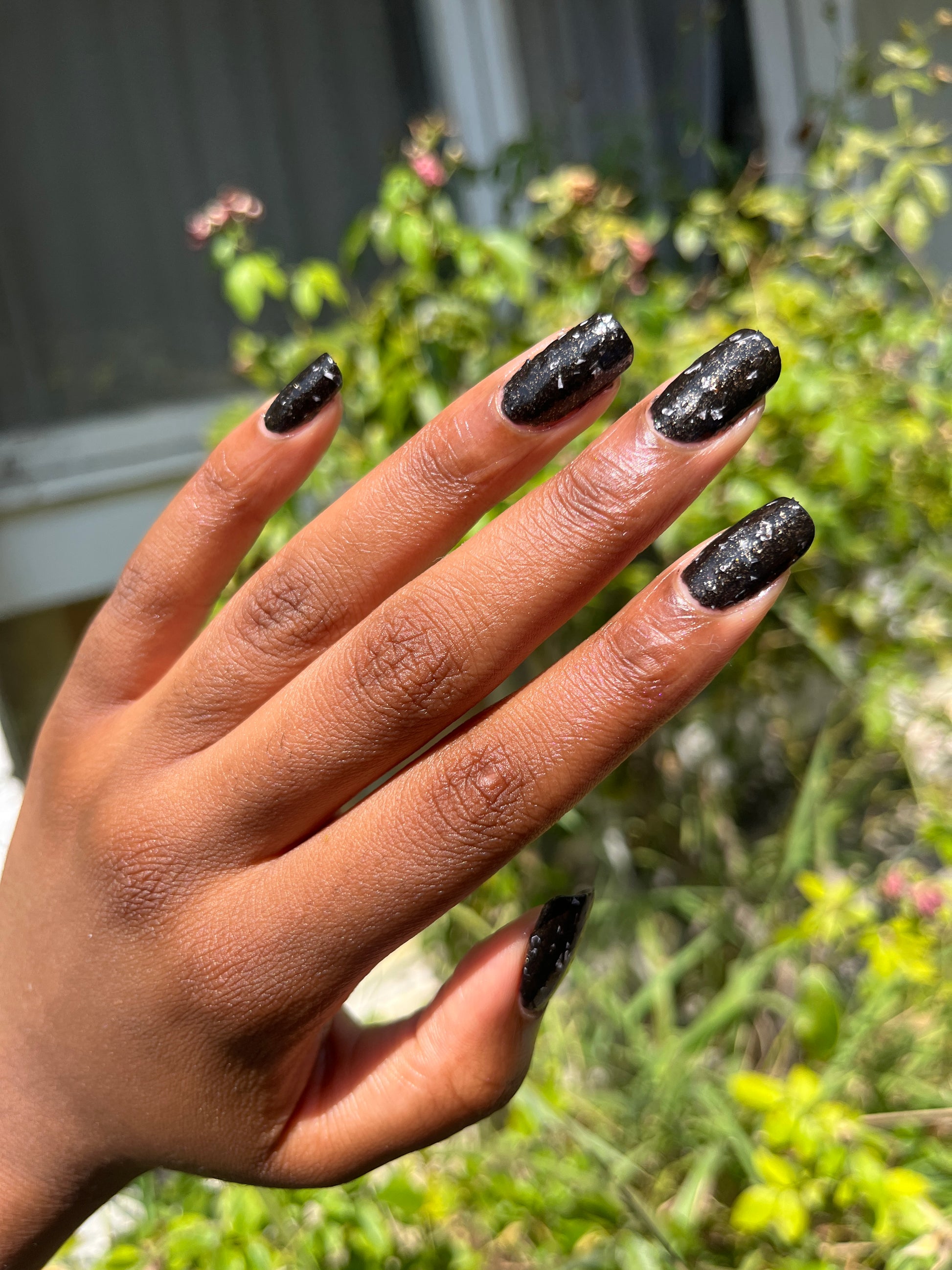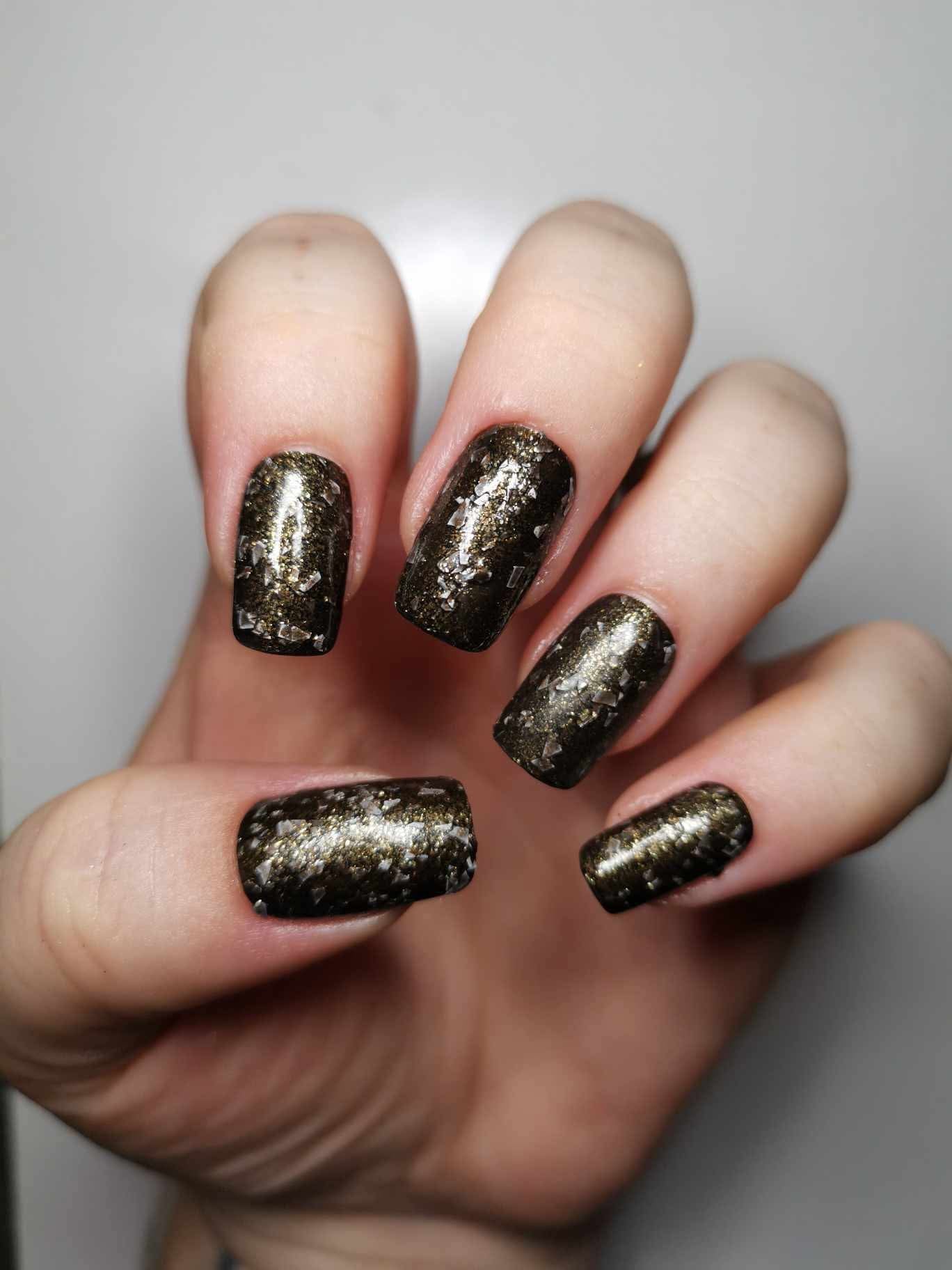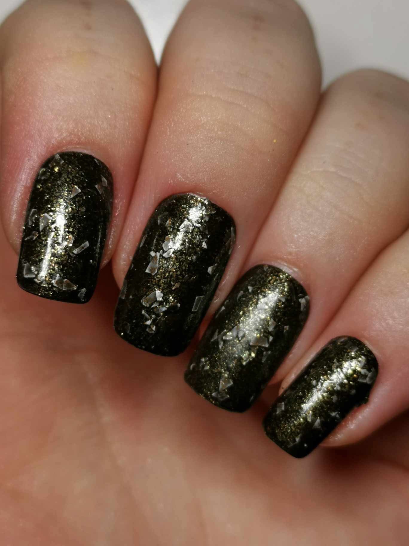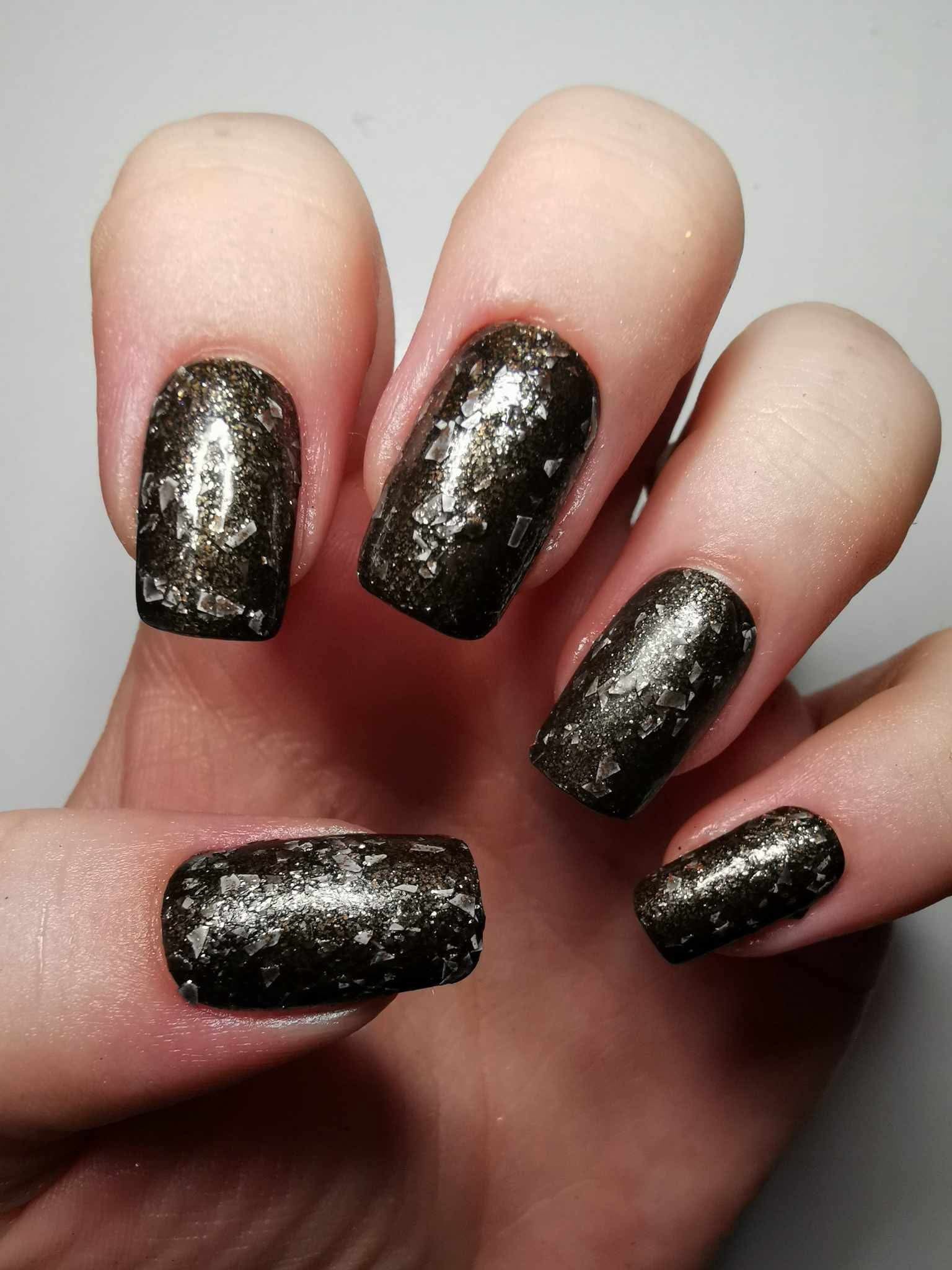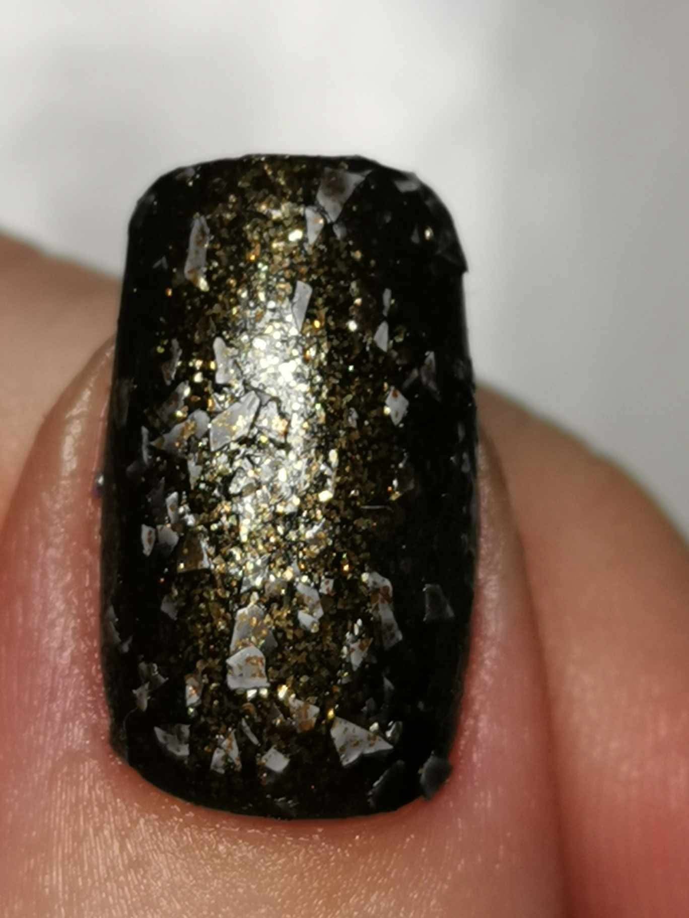 Peppa is a black polish filled with copper micro flakes and white shreds. It is opaque in two coats depending on nail length and application.
