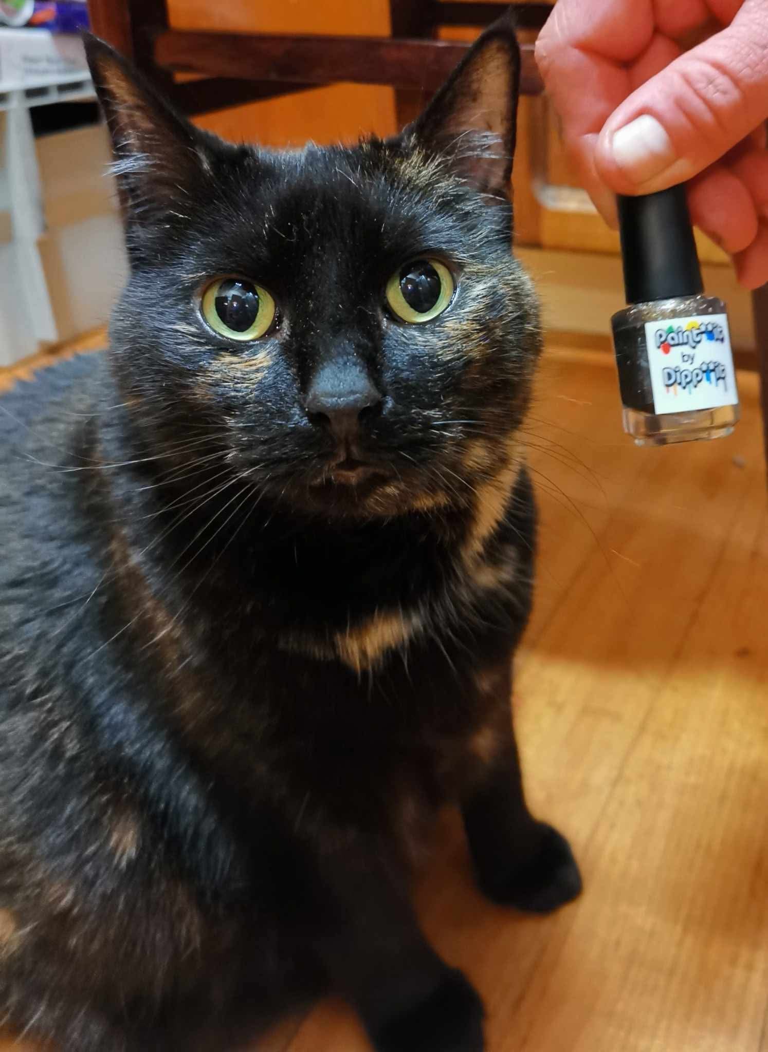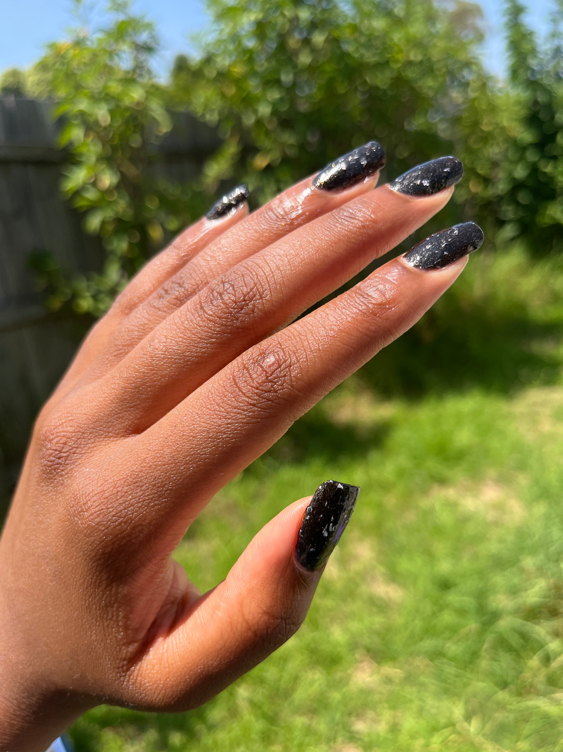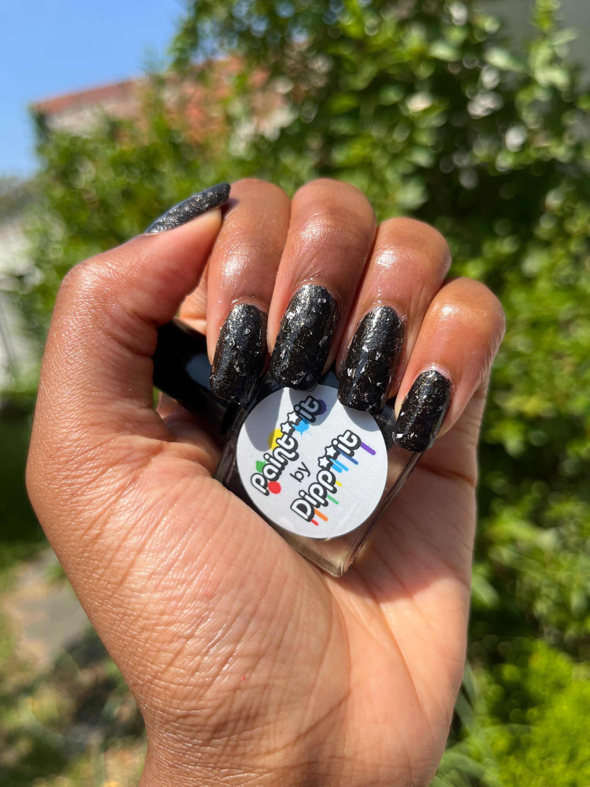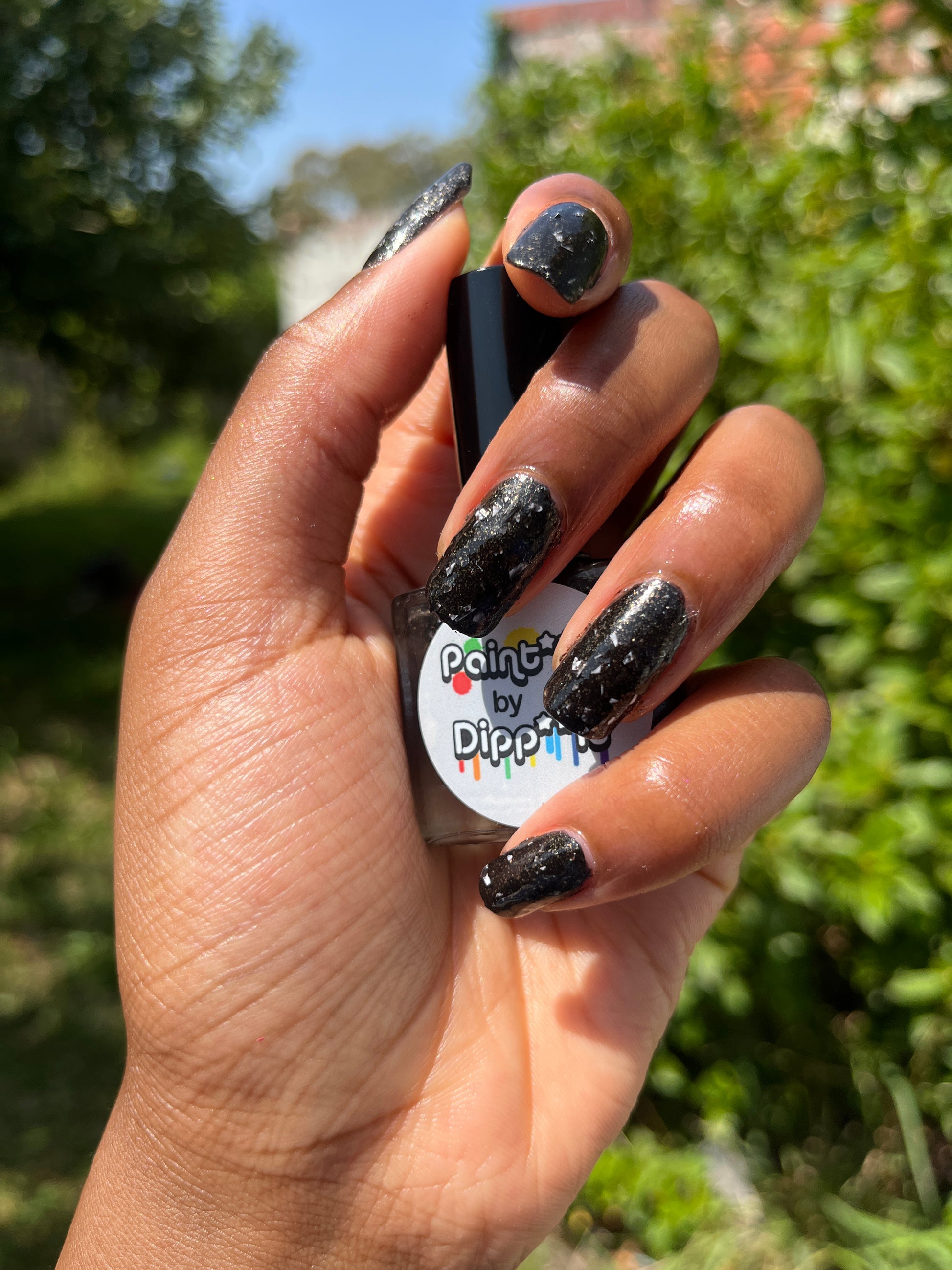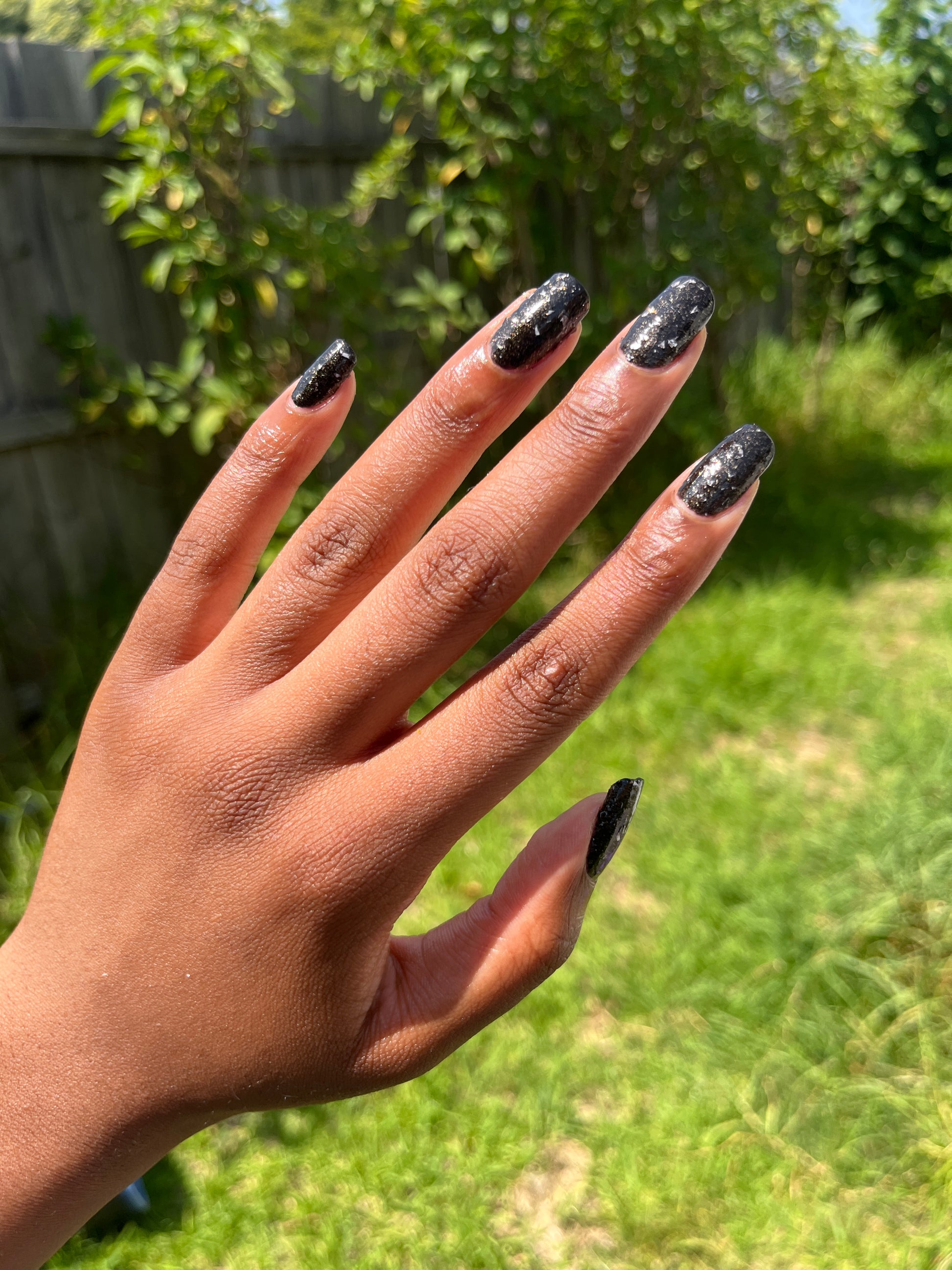 Peppa is a black polish filled with copper micro flakes and white shreds. It is opaque in two coats depending on nail length and application.