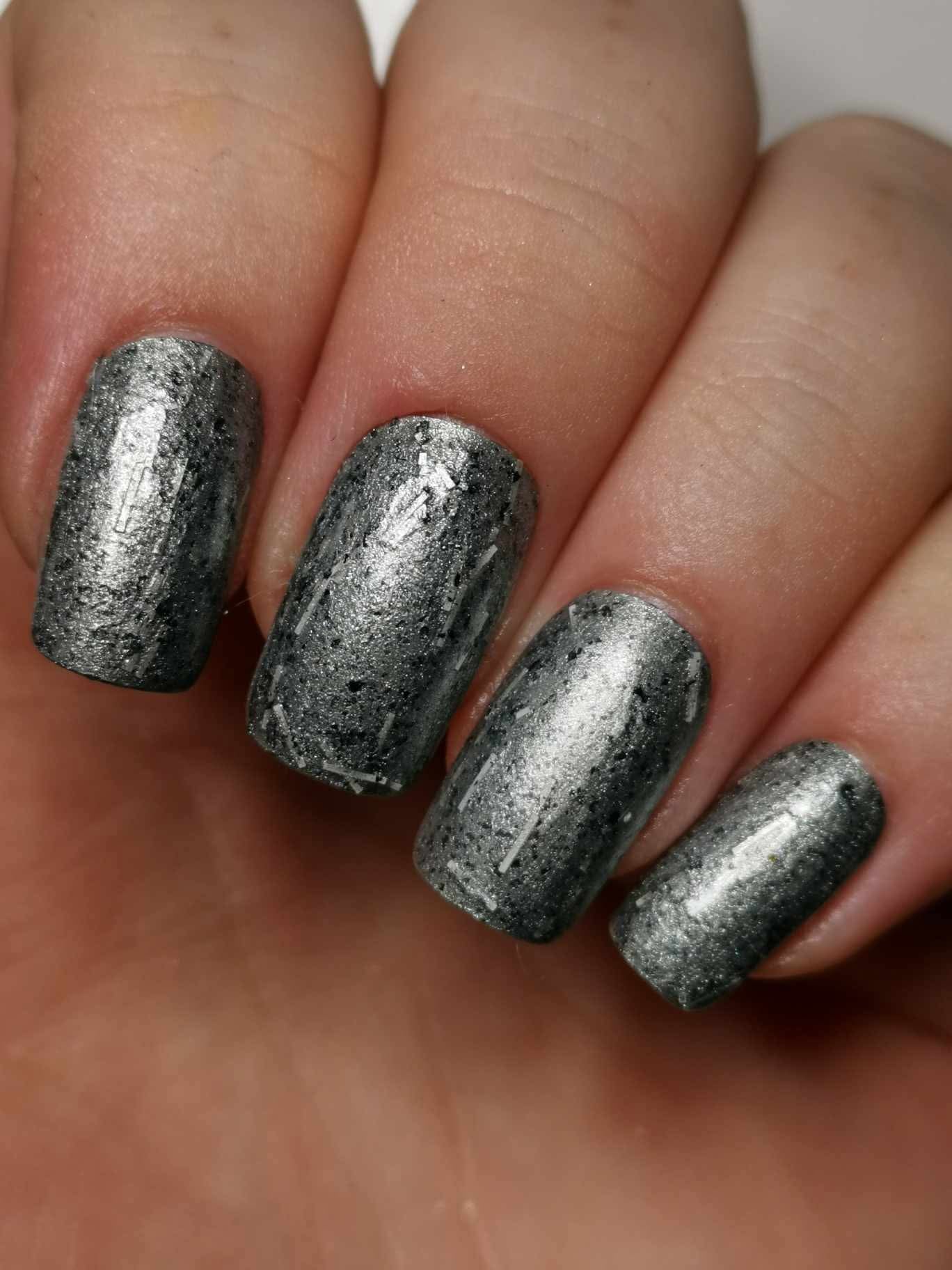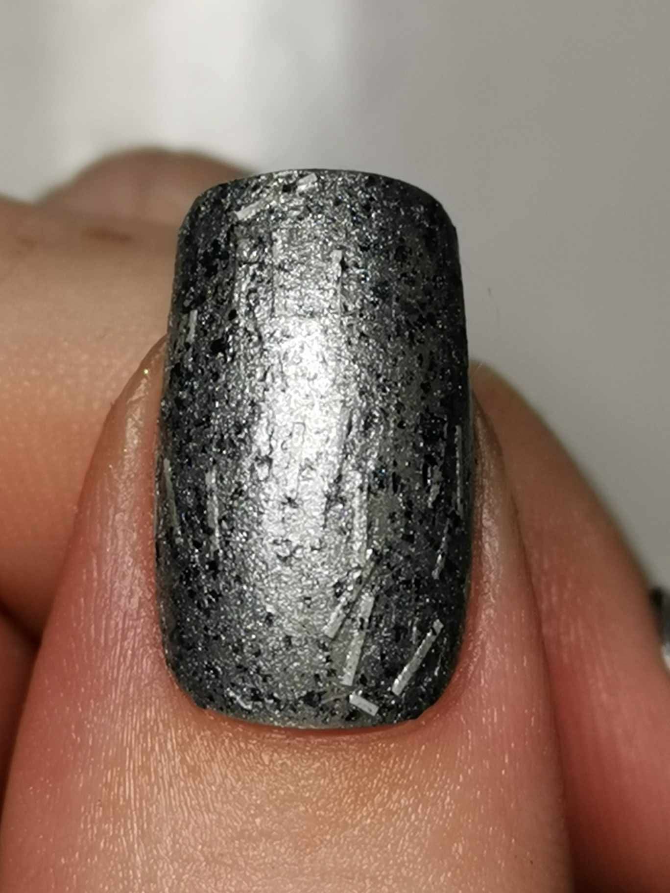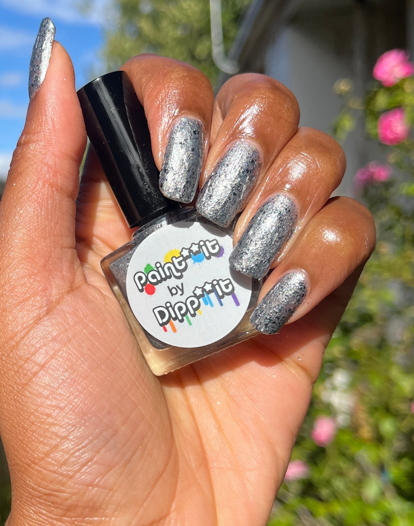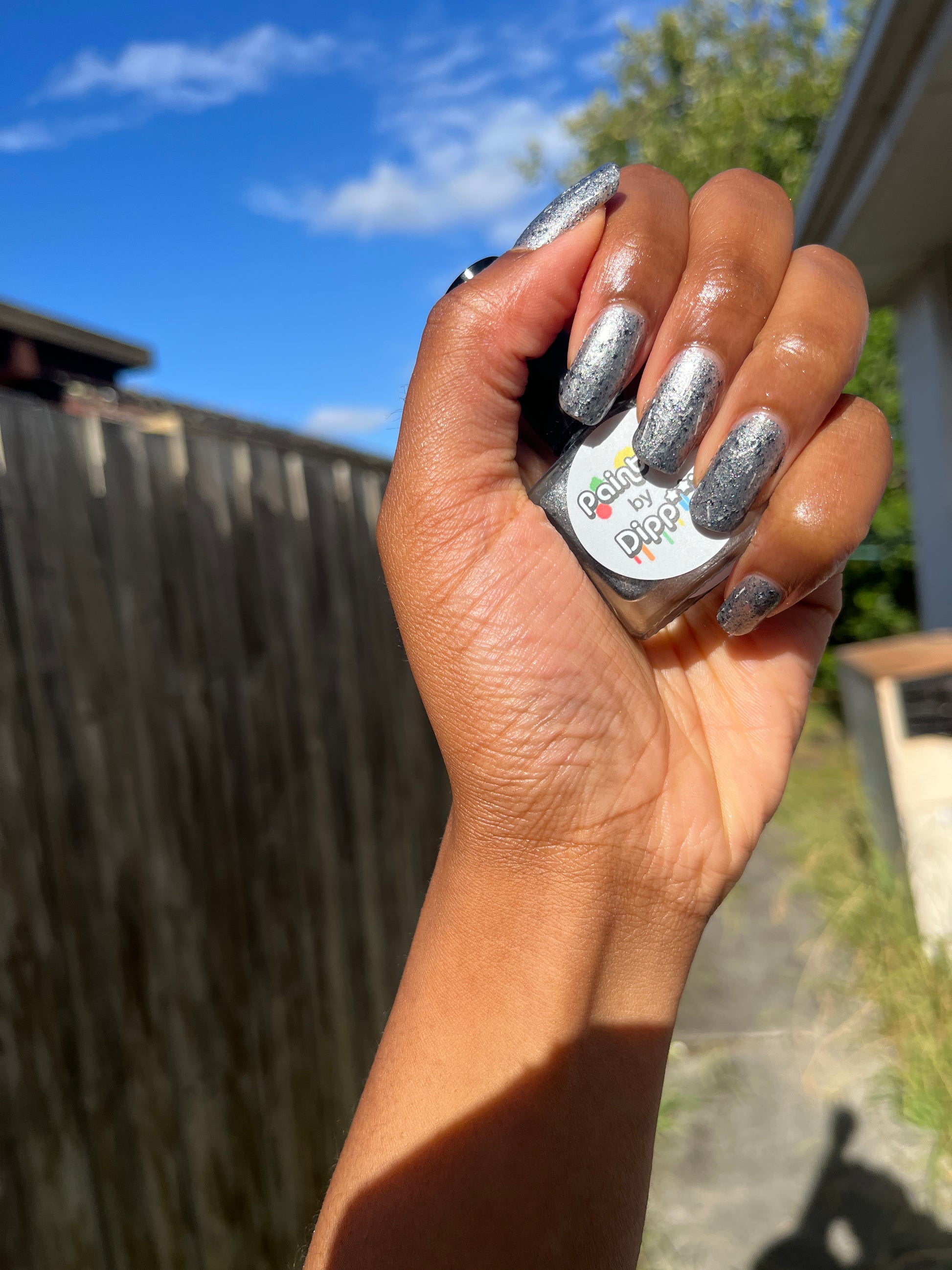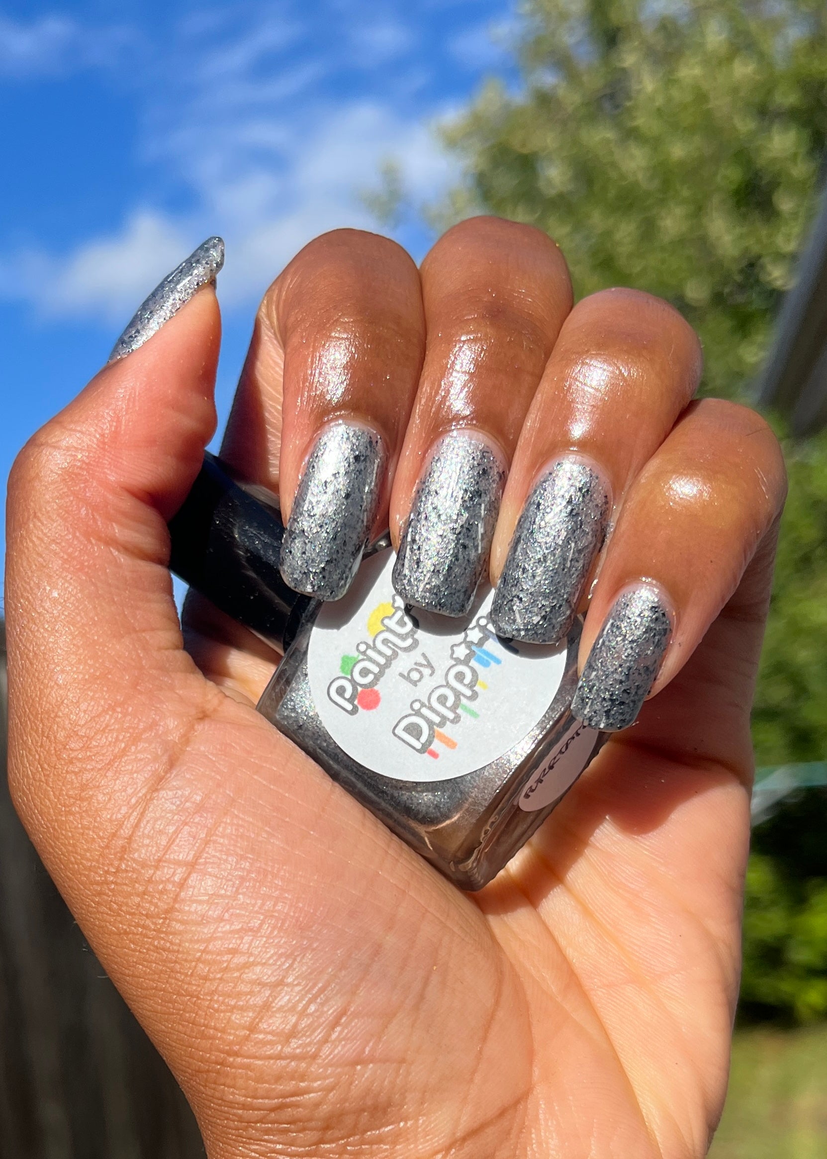 Purrtato is a shimmery grey polish filled with black micro flakes and white slice glitter. It is opaque in 2 - 3 coats depending on nail length and application.