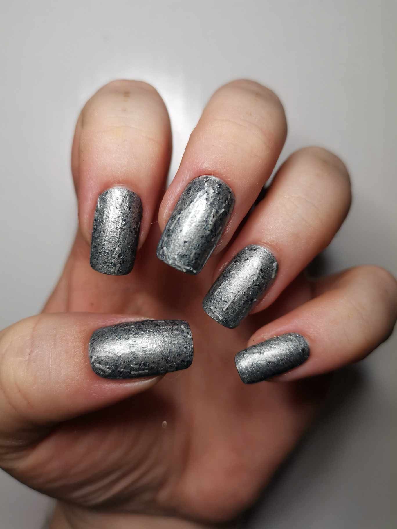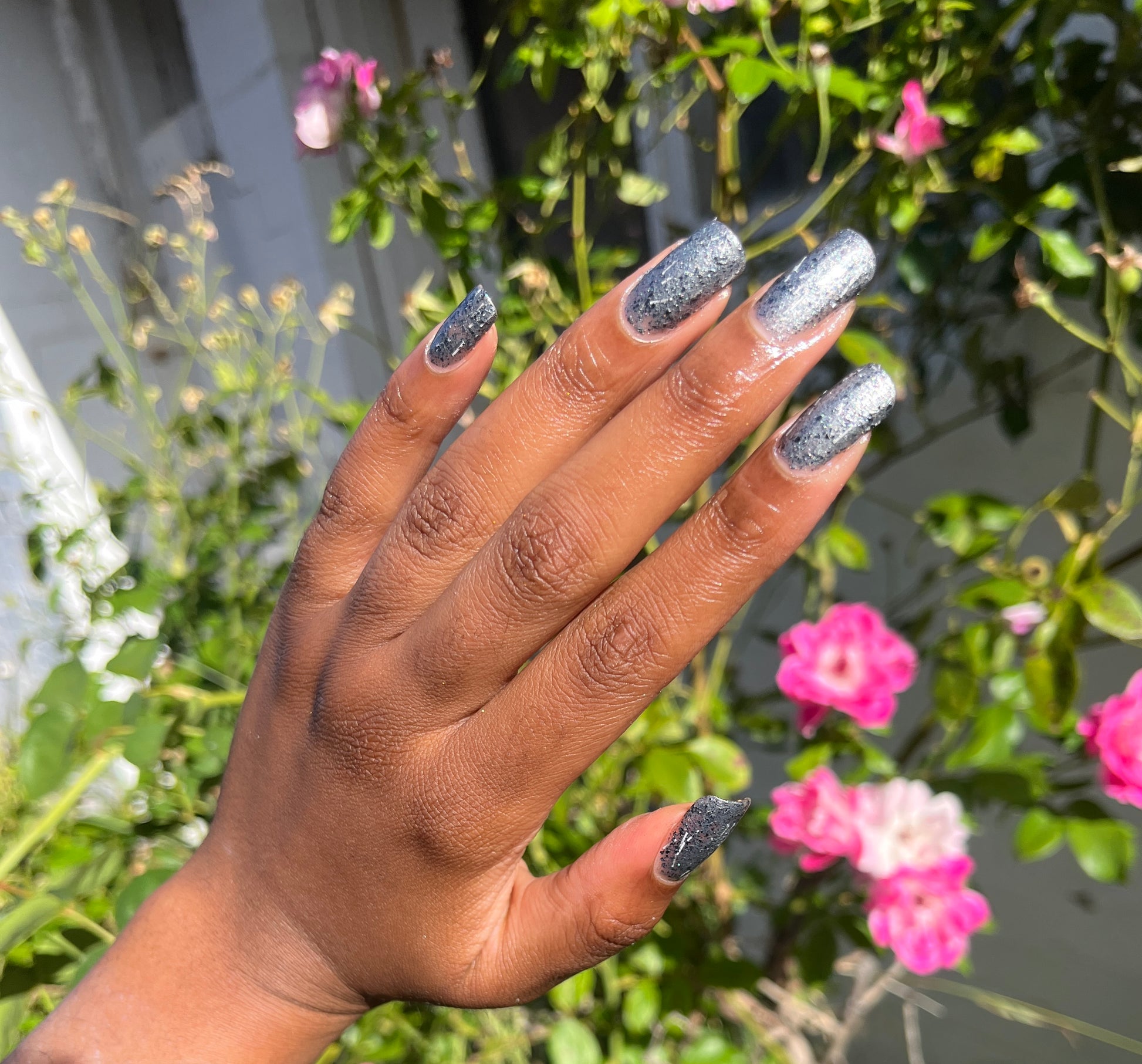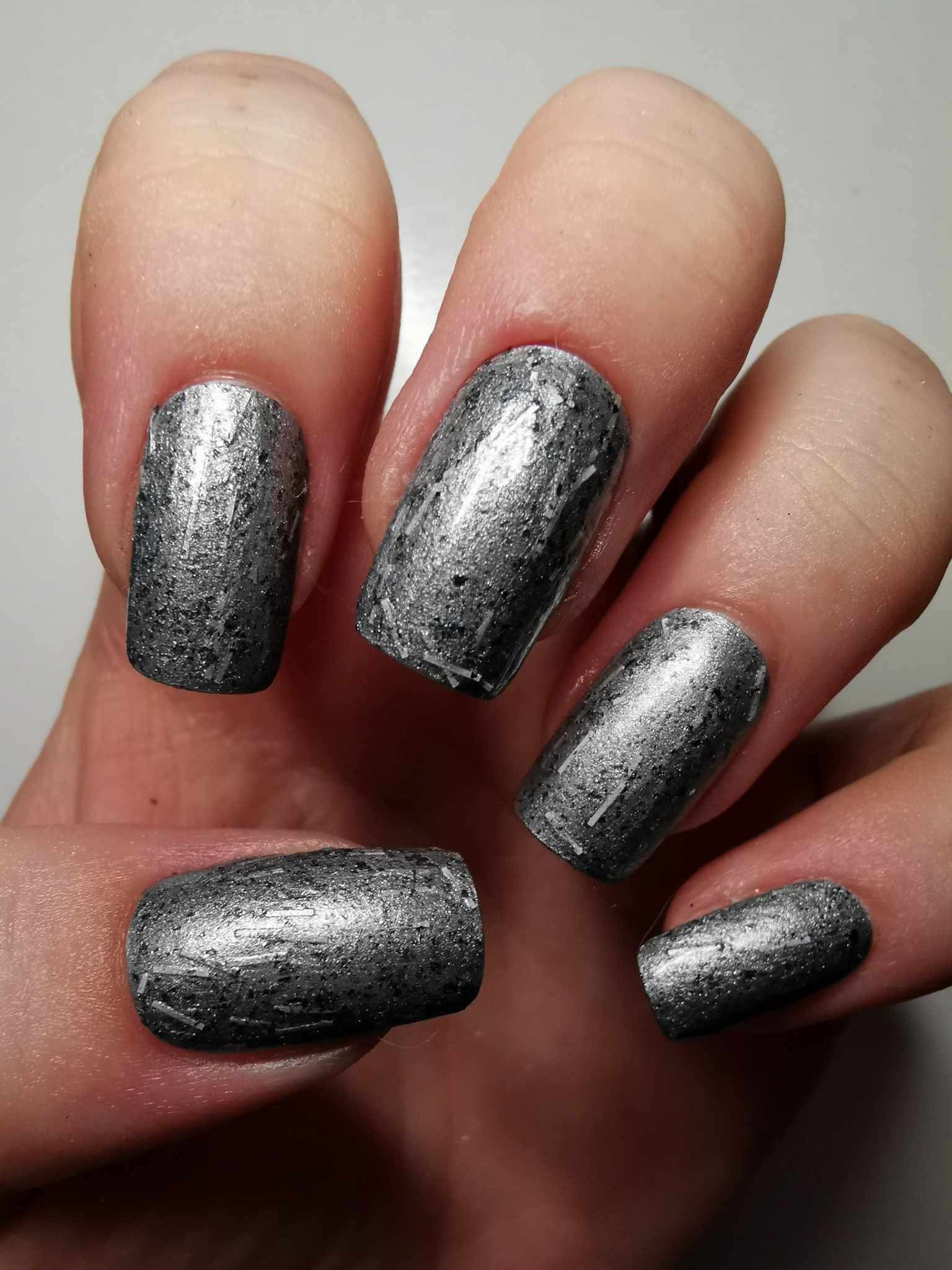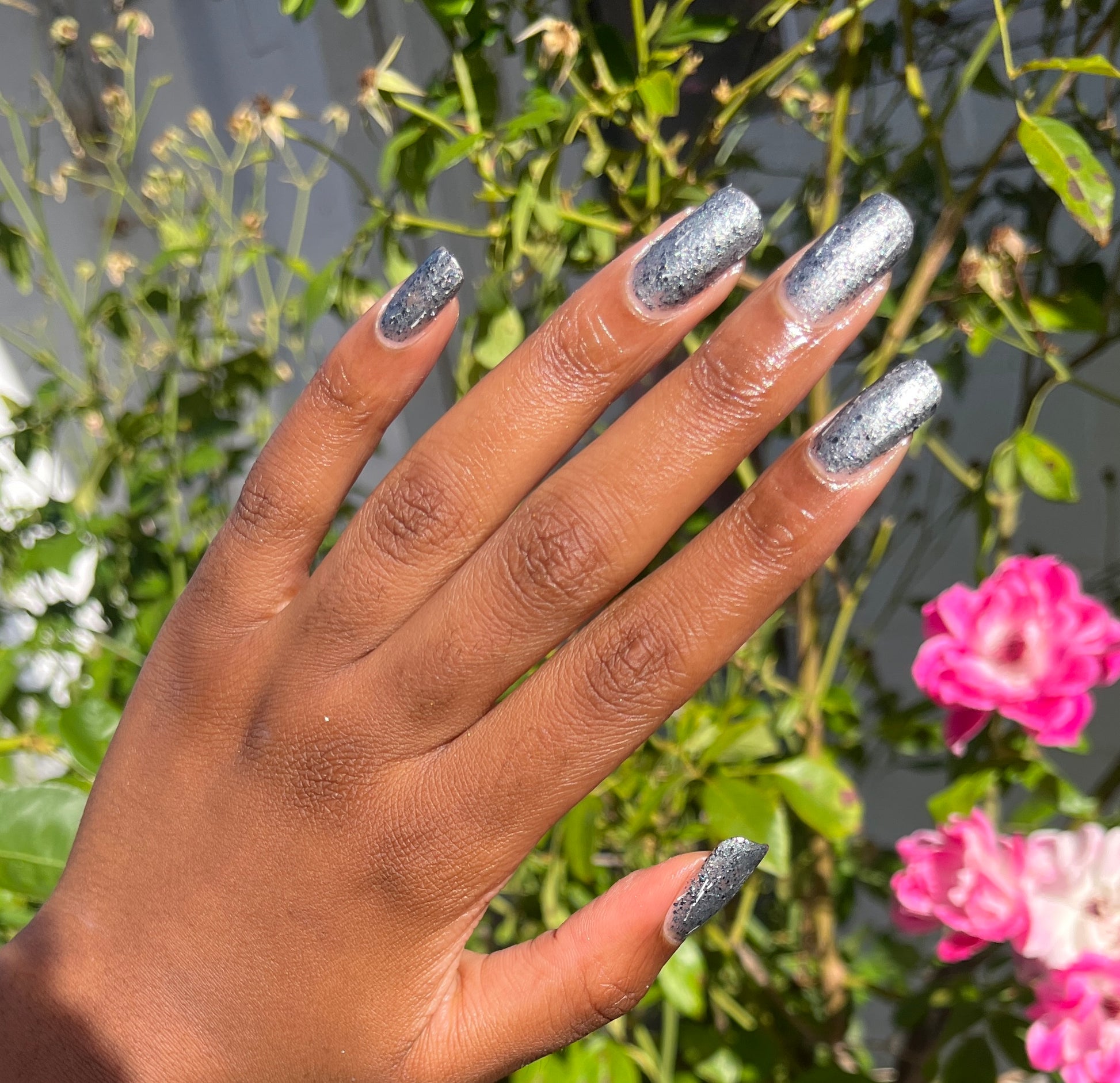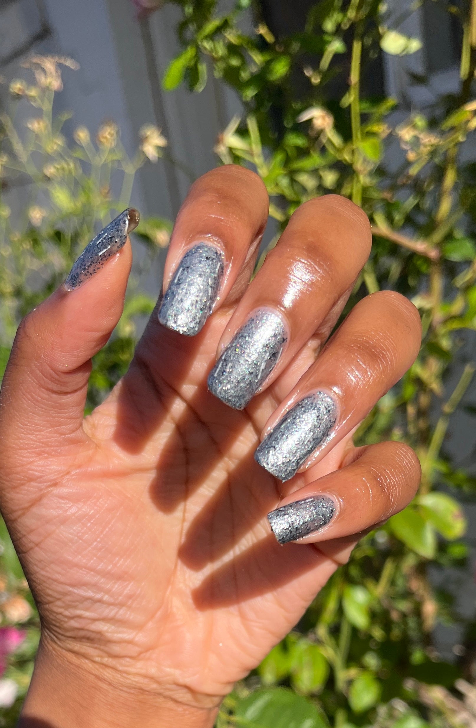 Purrtato is a shimmery grey polish filled with black micro flakes and white slice glitter. It is opaque in 2 - 3 coats depending on nail length and application.