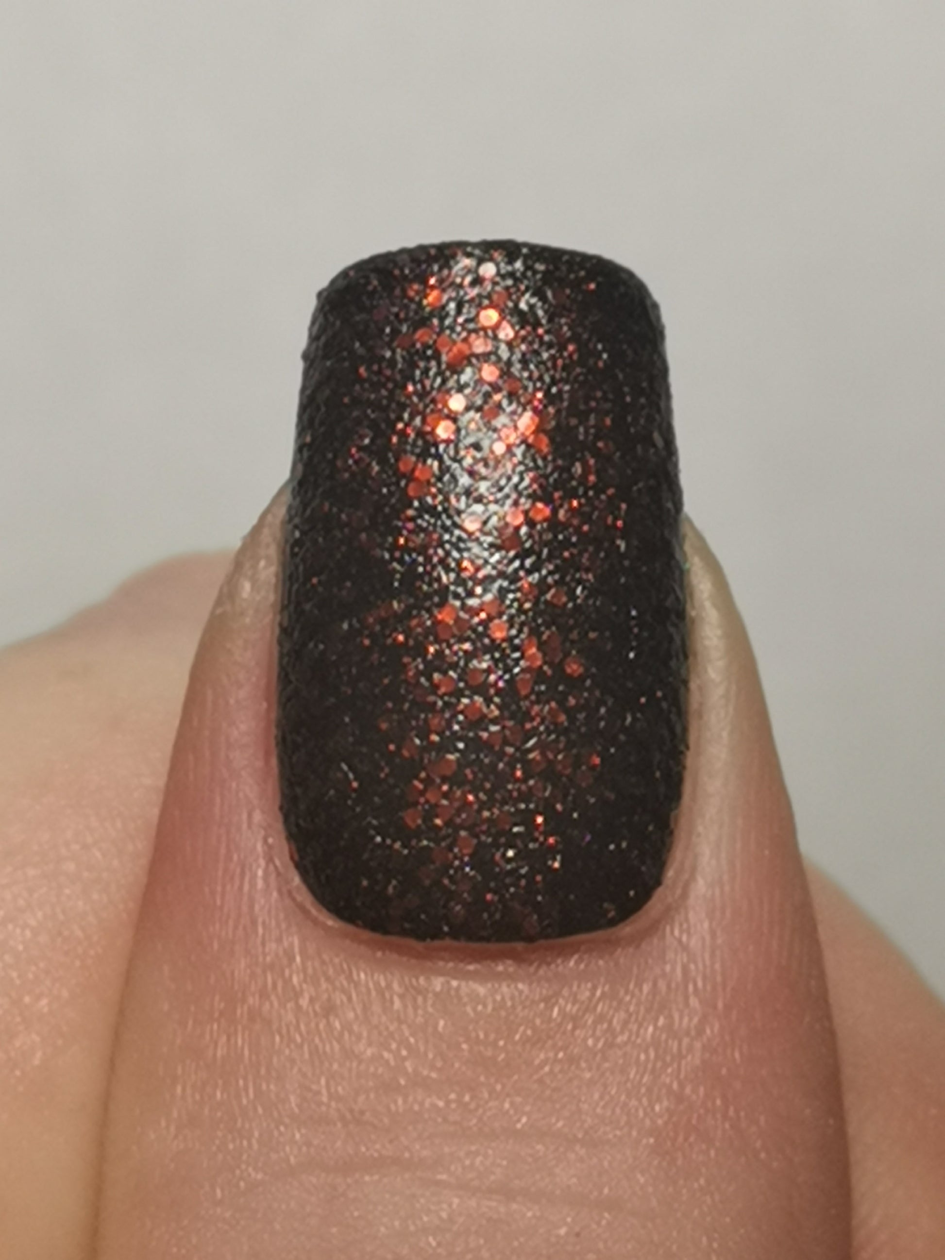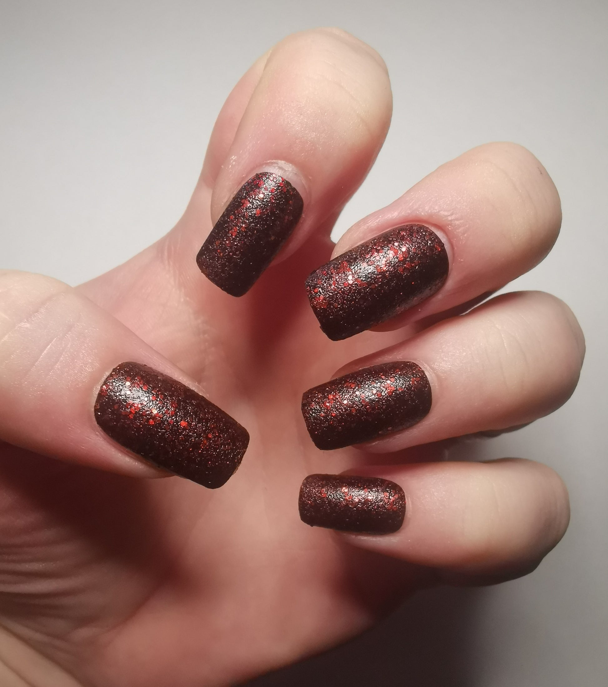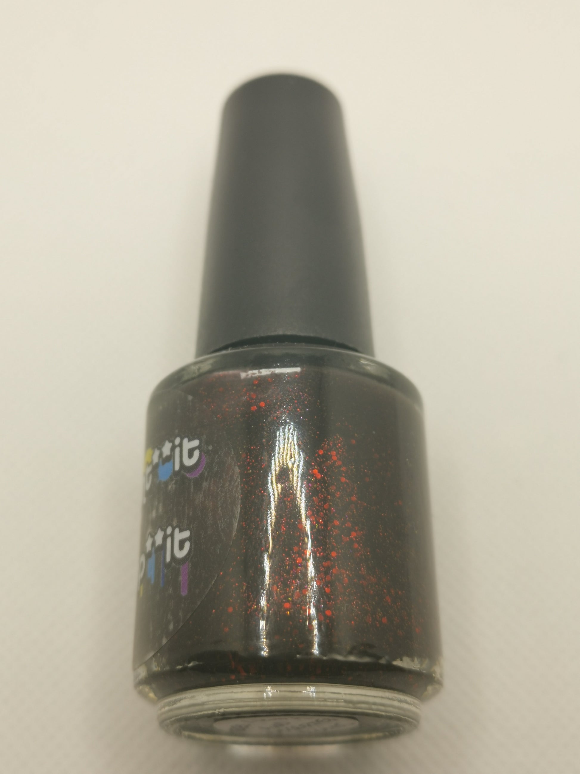 A black based polish with glittering red tinter and two sizes of shiny red glitter. The name comes from the idea of driving to work in the middle of the night with no one else on the road and getting stuck at all the red lights.