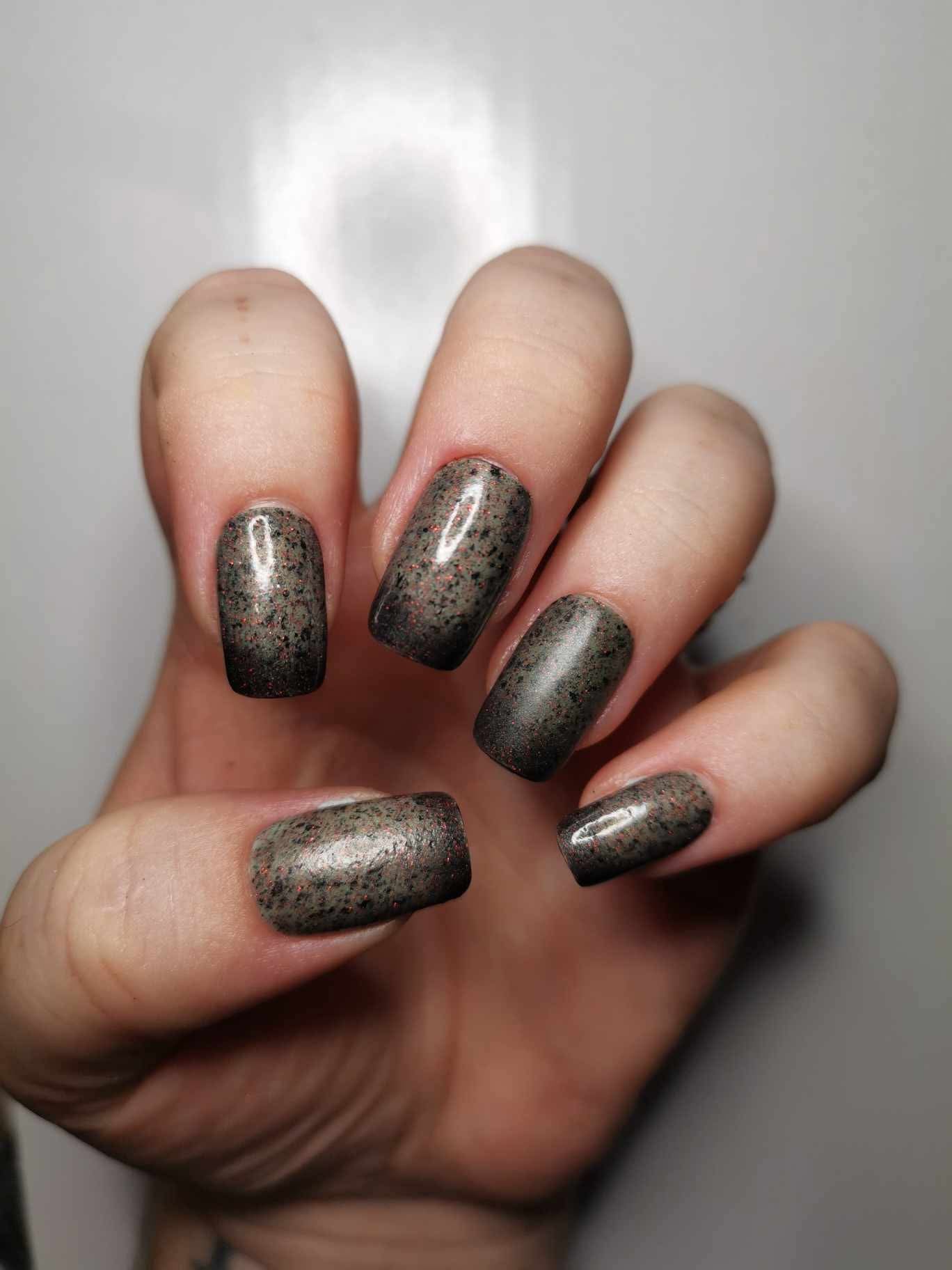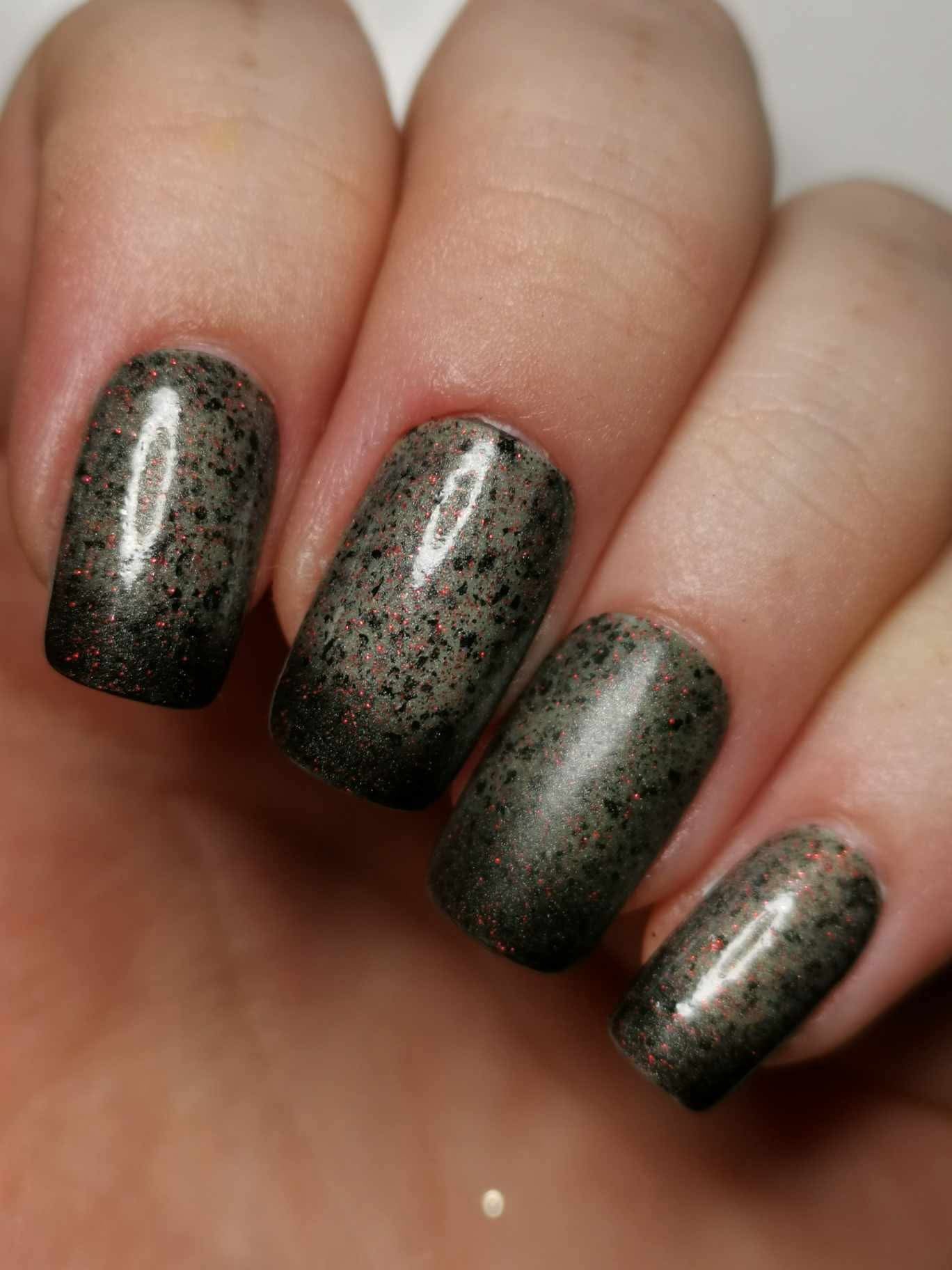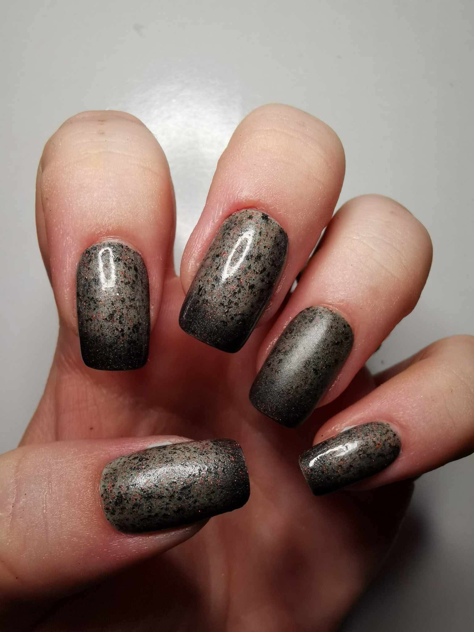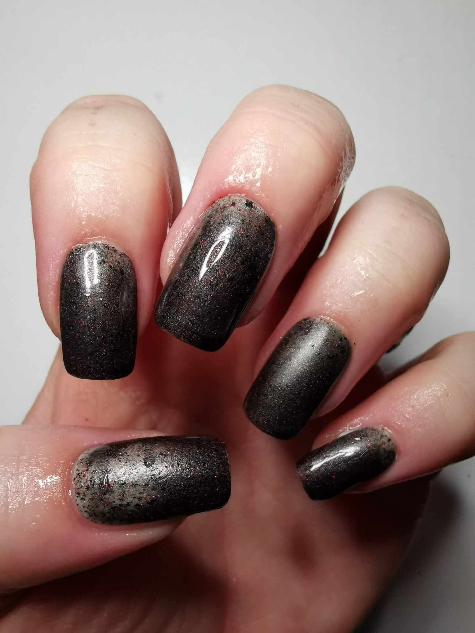 Rfa is a black to grey thermal polish filled with black micro flakes and fine red glitter. It is opaque in two coats depending on nail length and application.