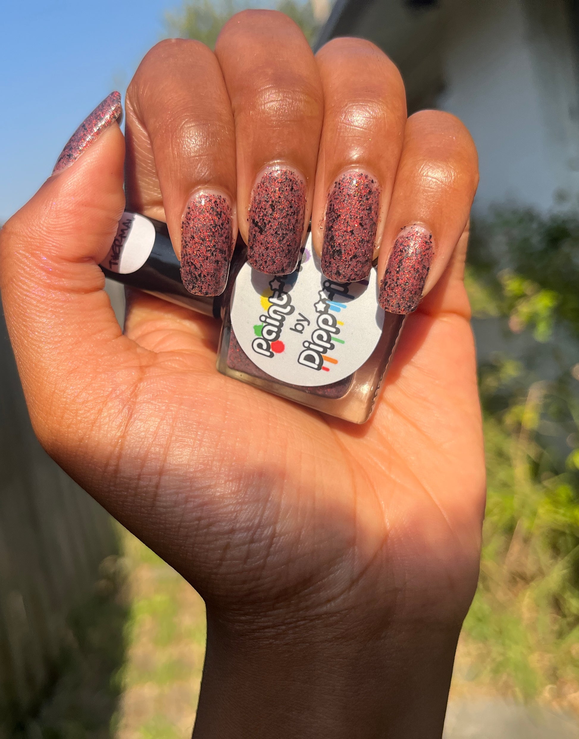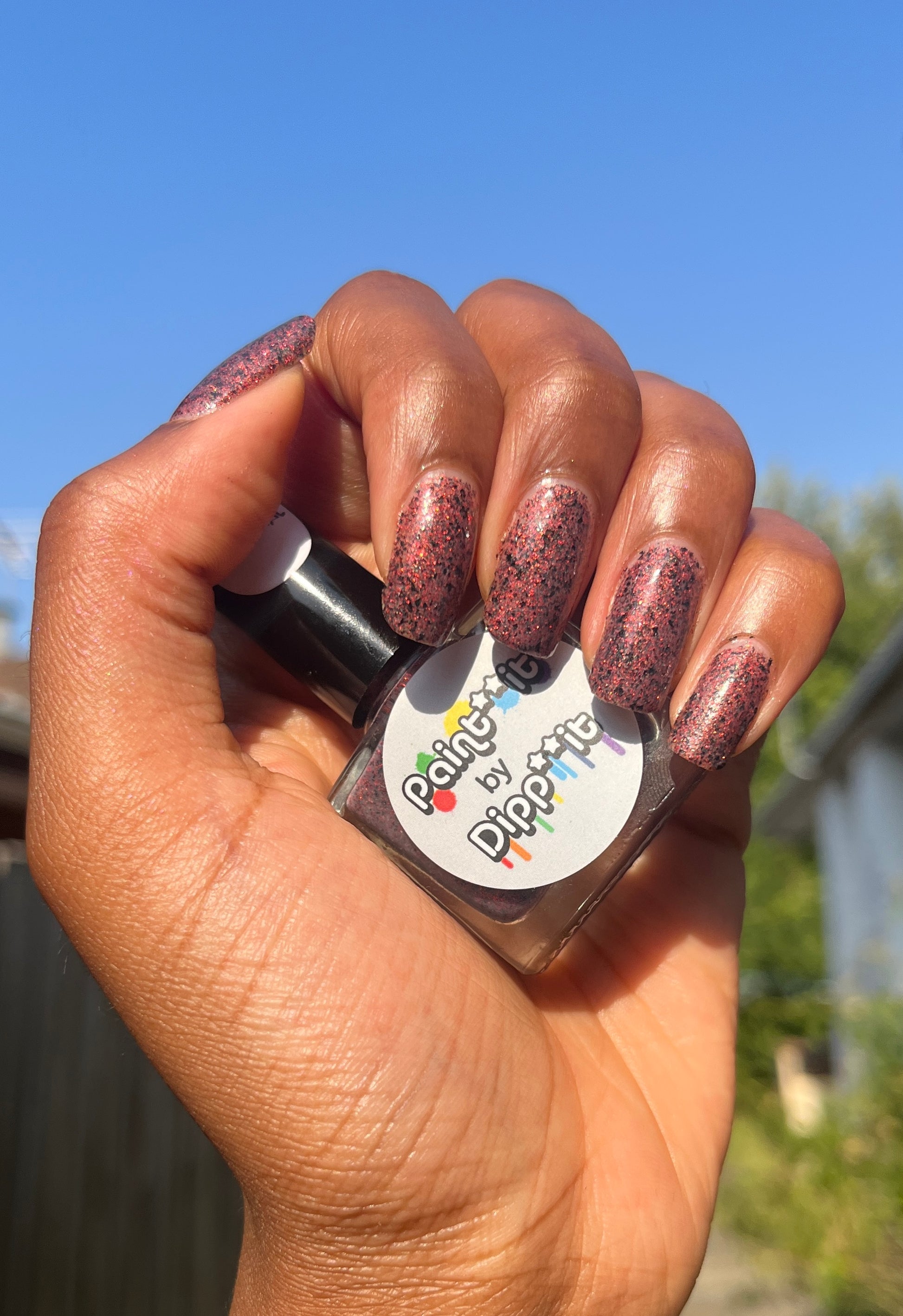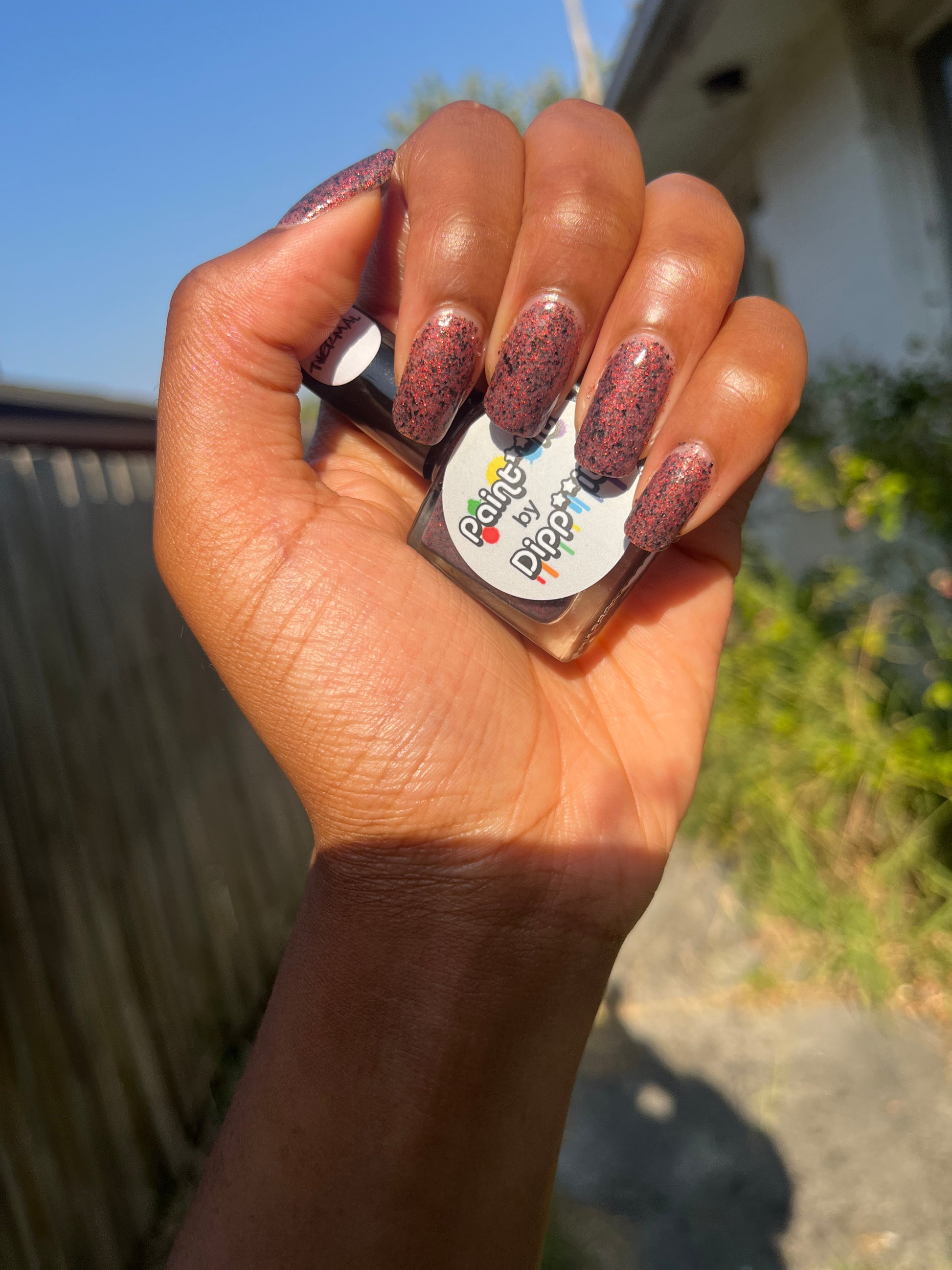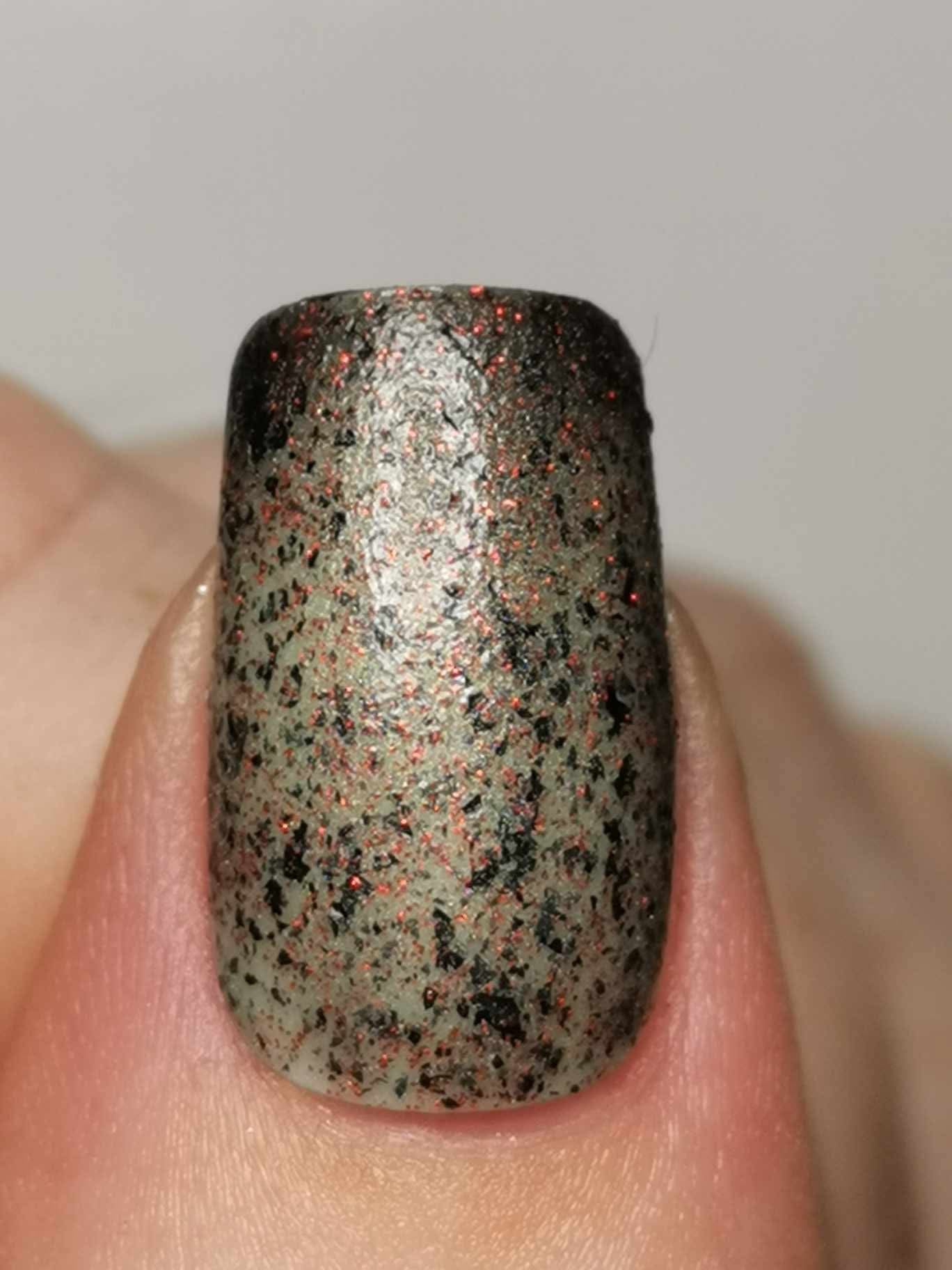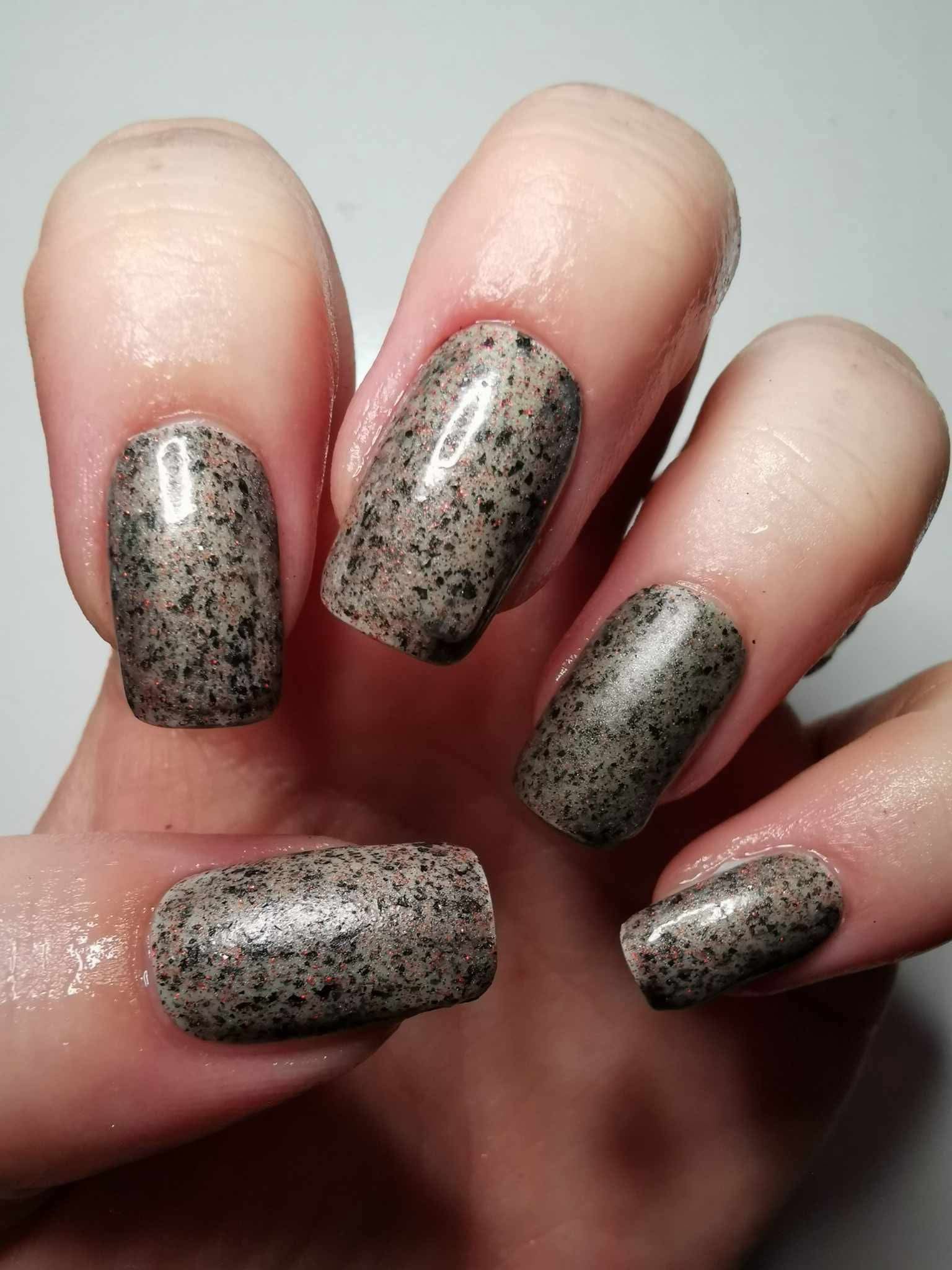 Rfa is a black to grey thermal polish filled with black micro flakes and fine red glitter. It is opaque in two coats depending on nail length and application.