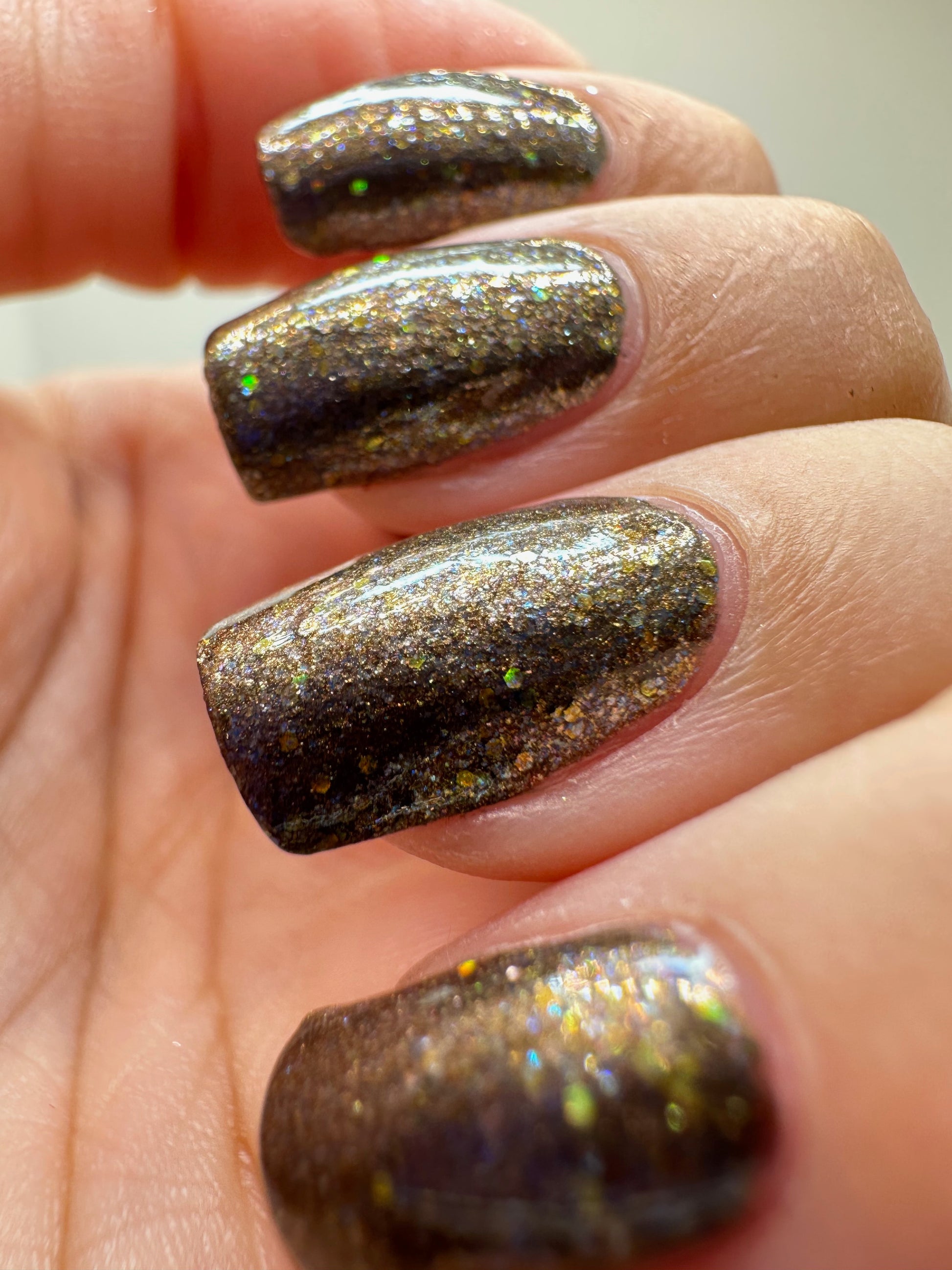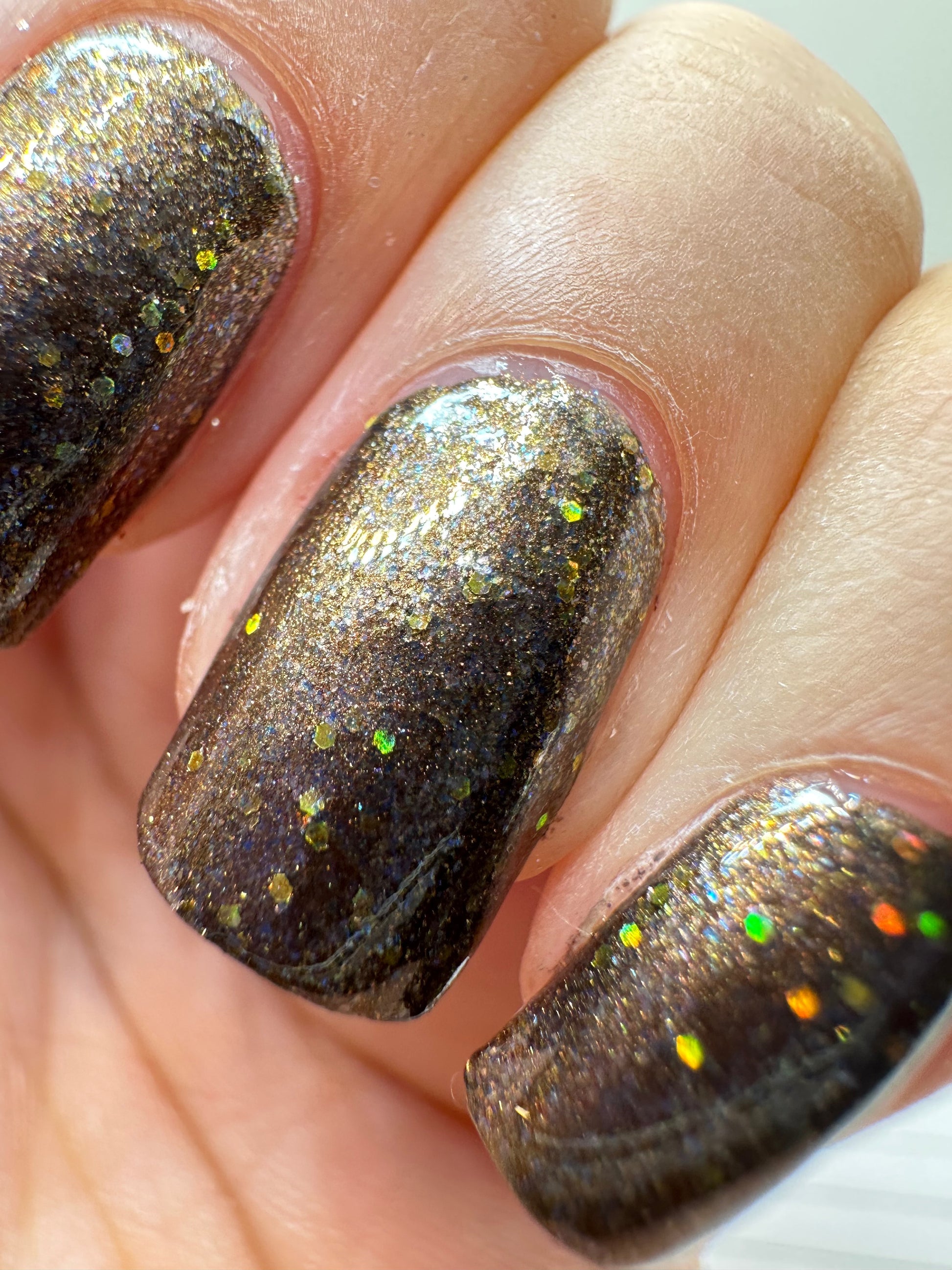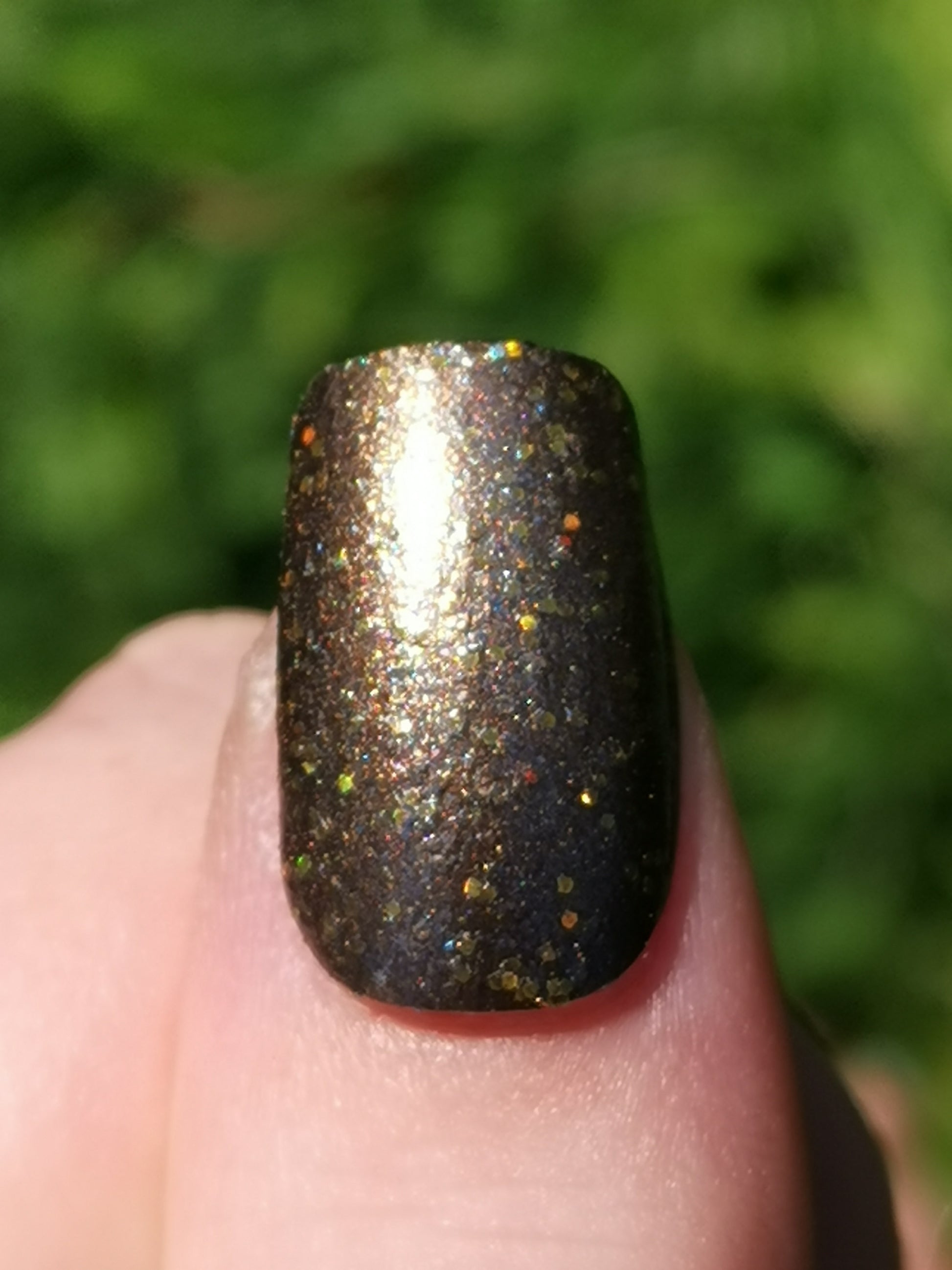 Sonic Buzz is inspired by Bublebee and is a shiny brown polish filled with blue microflakes and yellow holographic glitter.