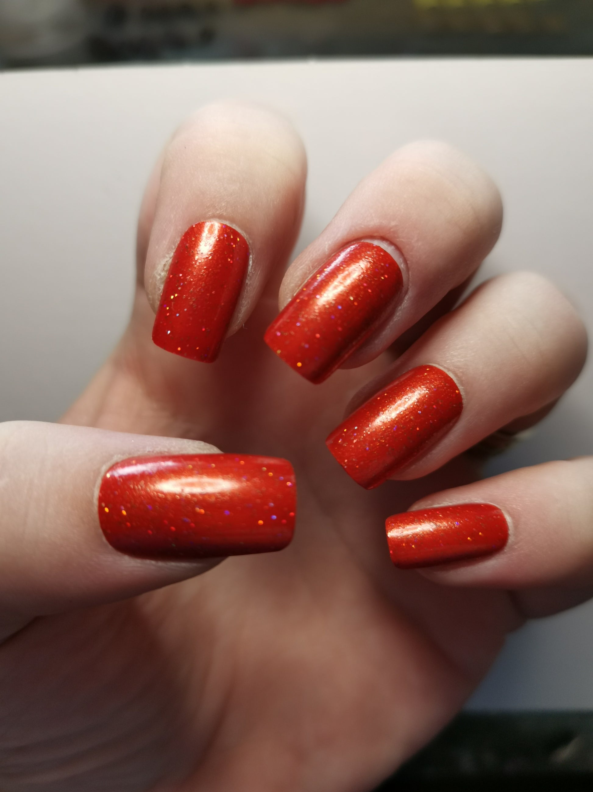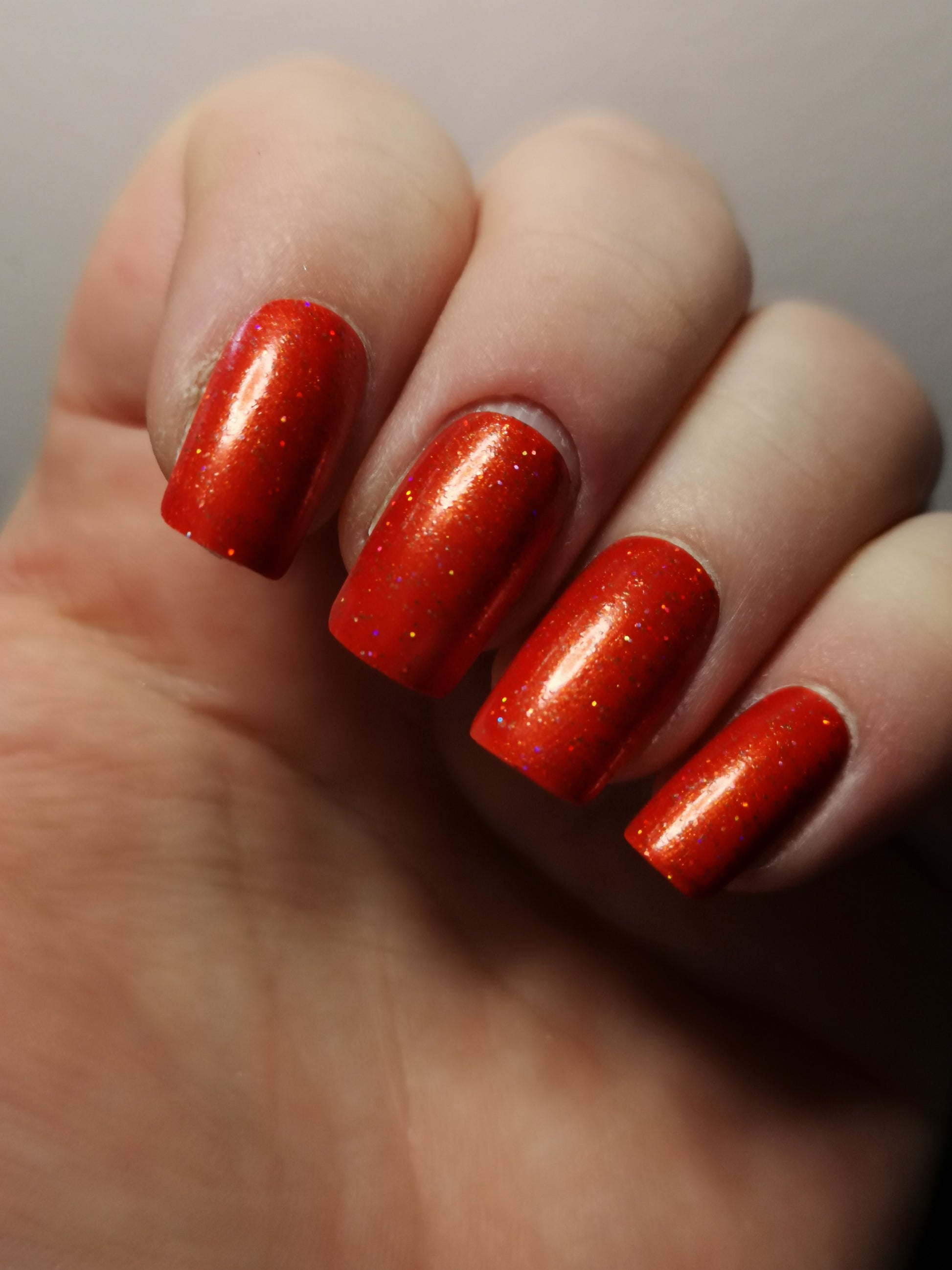 They Looked at Me! Rose is a shimmery and subtly sparkly reddish orange creme polish based on the colour of sparkling rose. This polish is opaque in two coats depending on your nail length and application.
