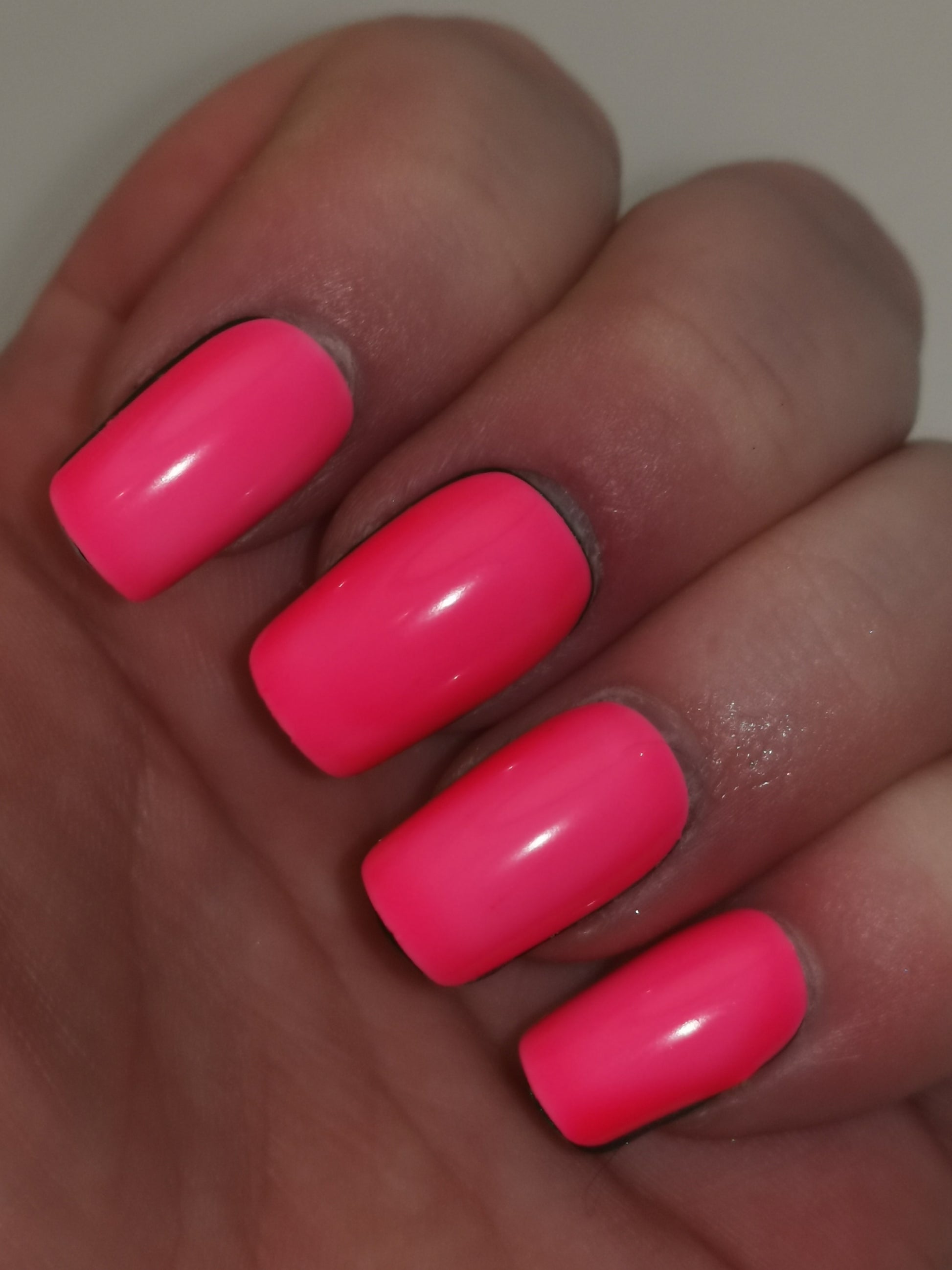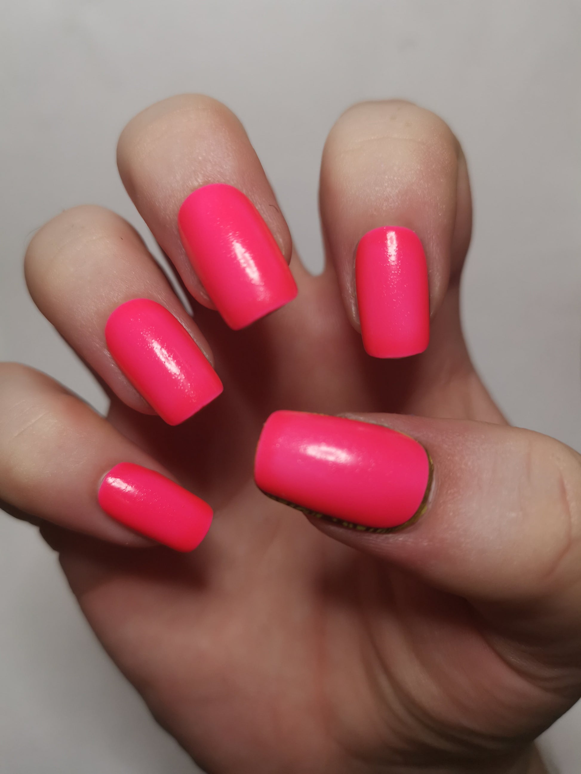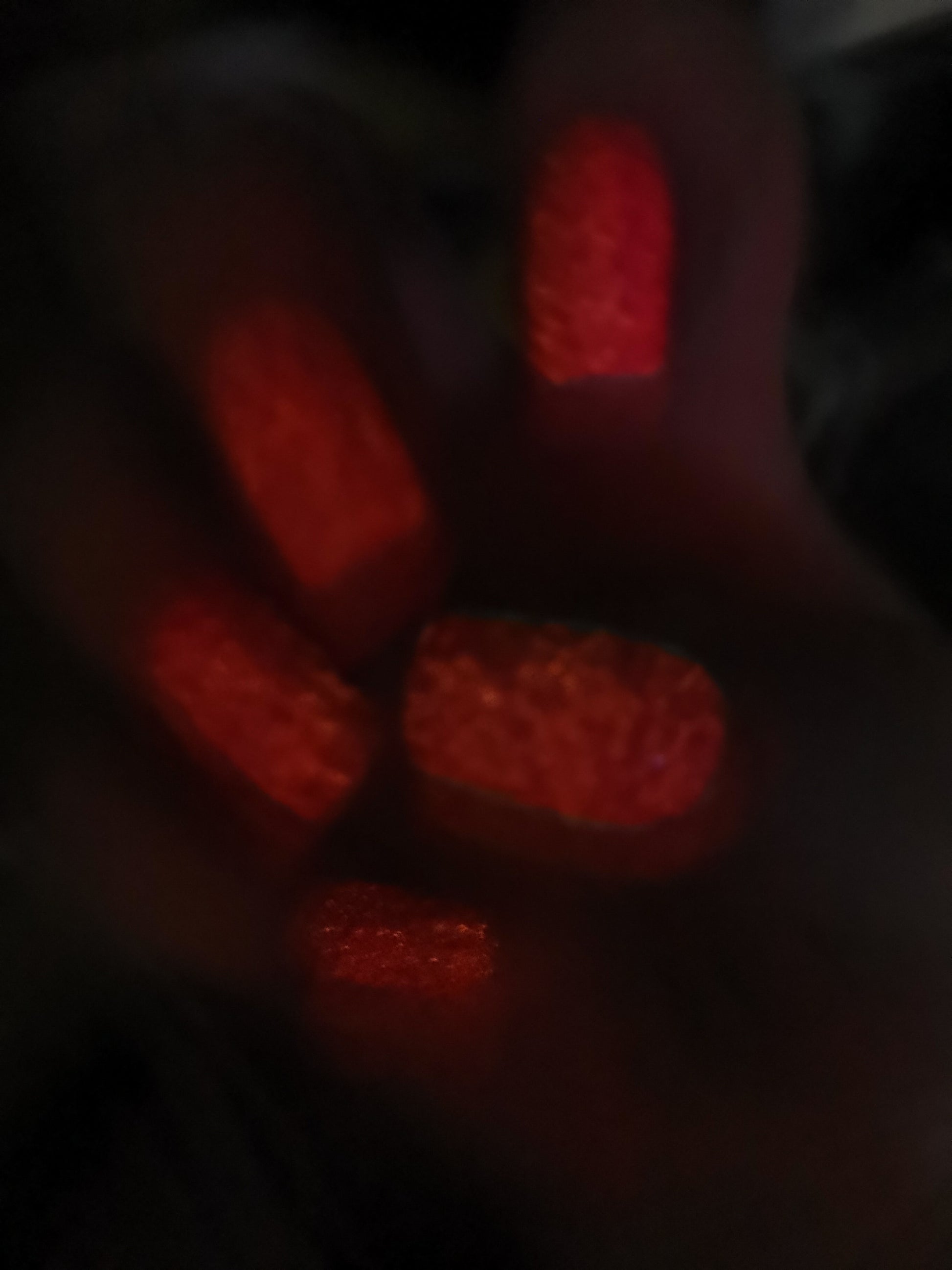 A neon orangey pink jelly polish that glows orangey pink in the dark.