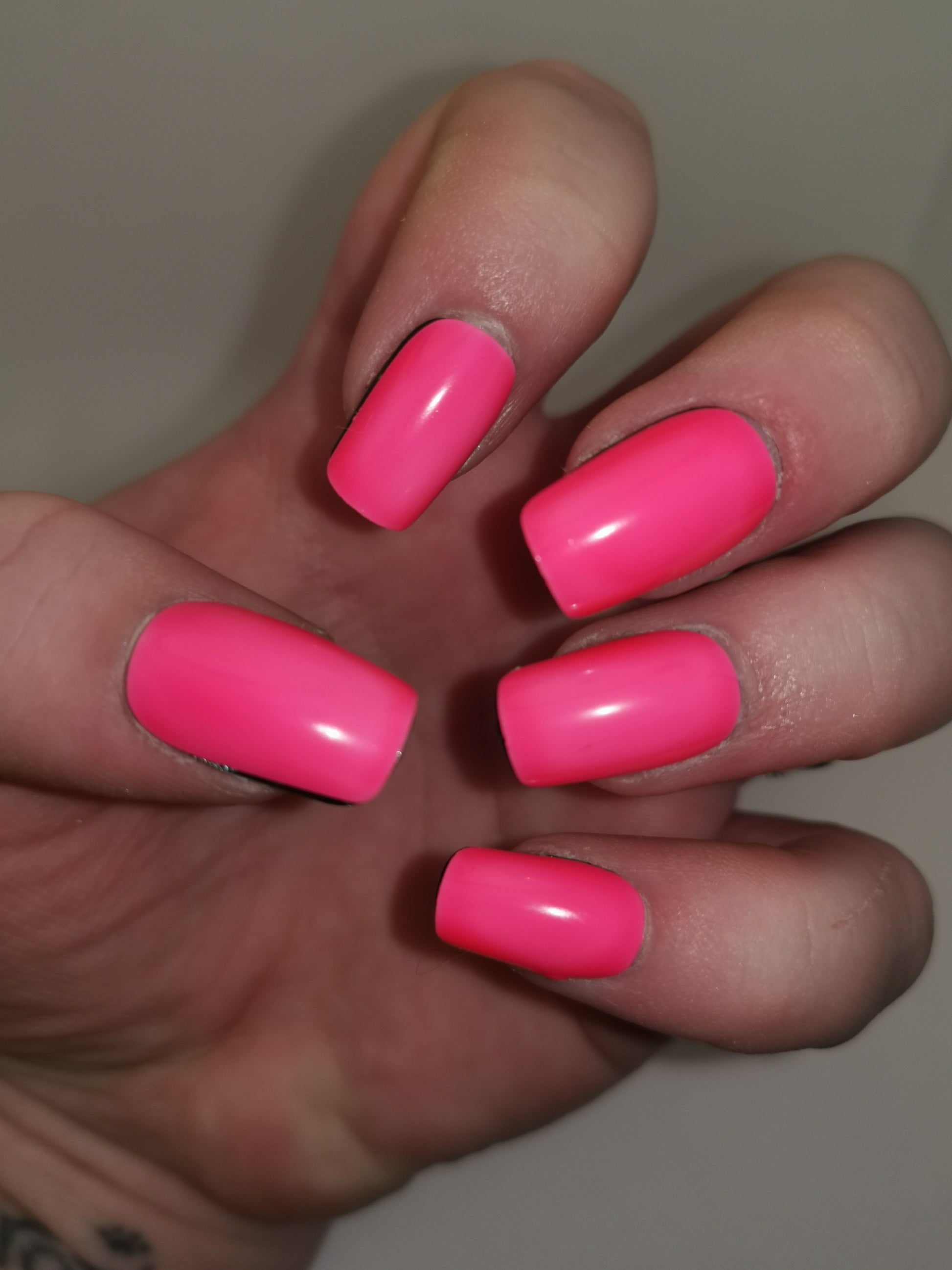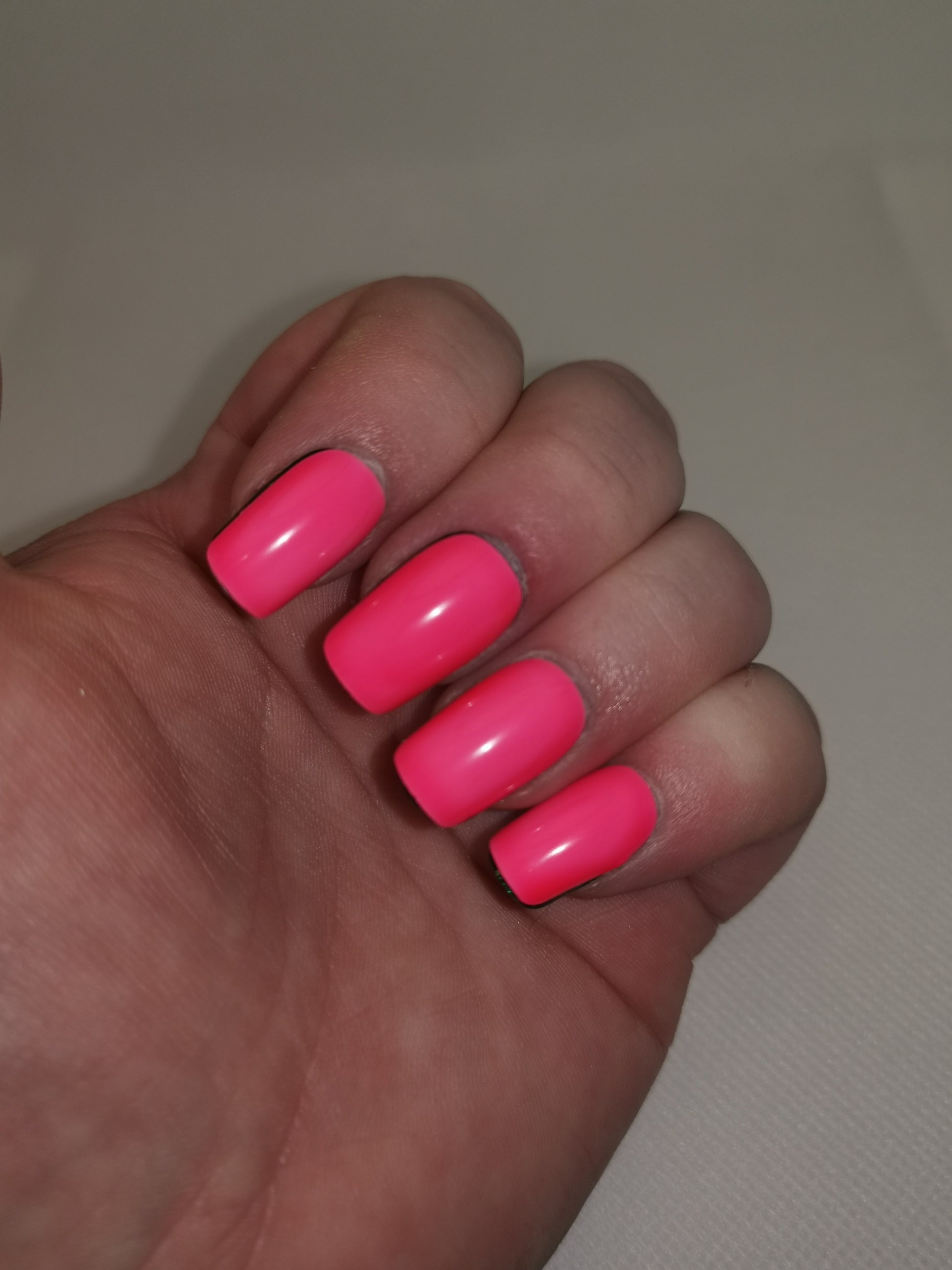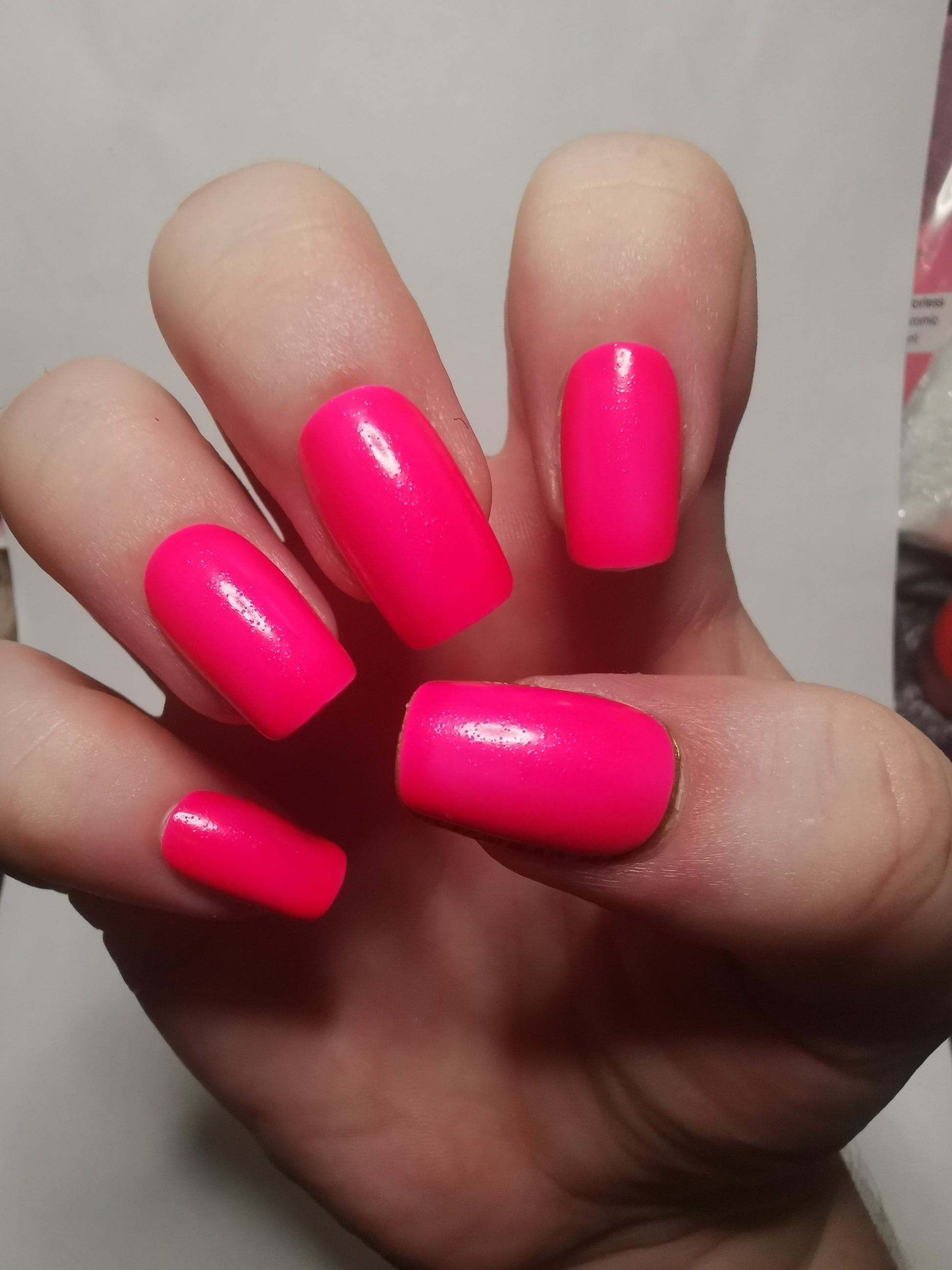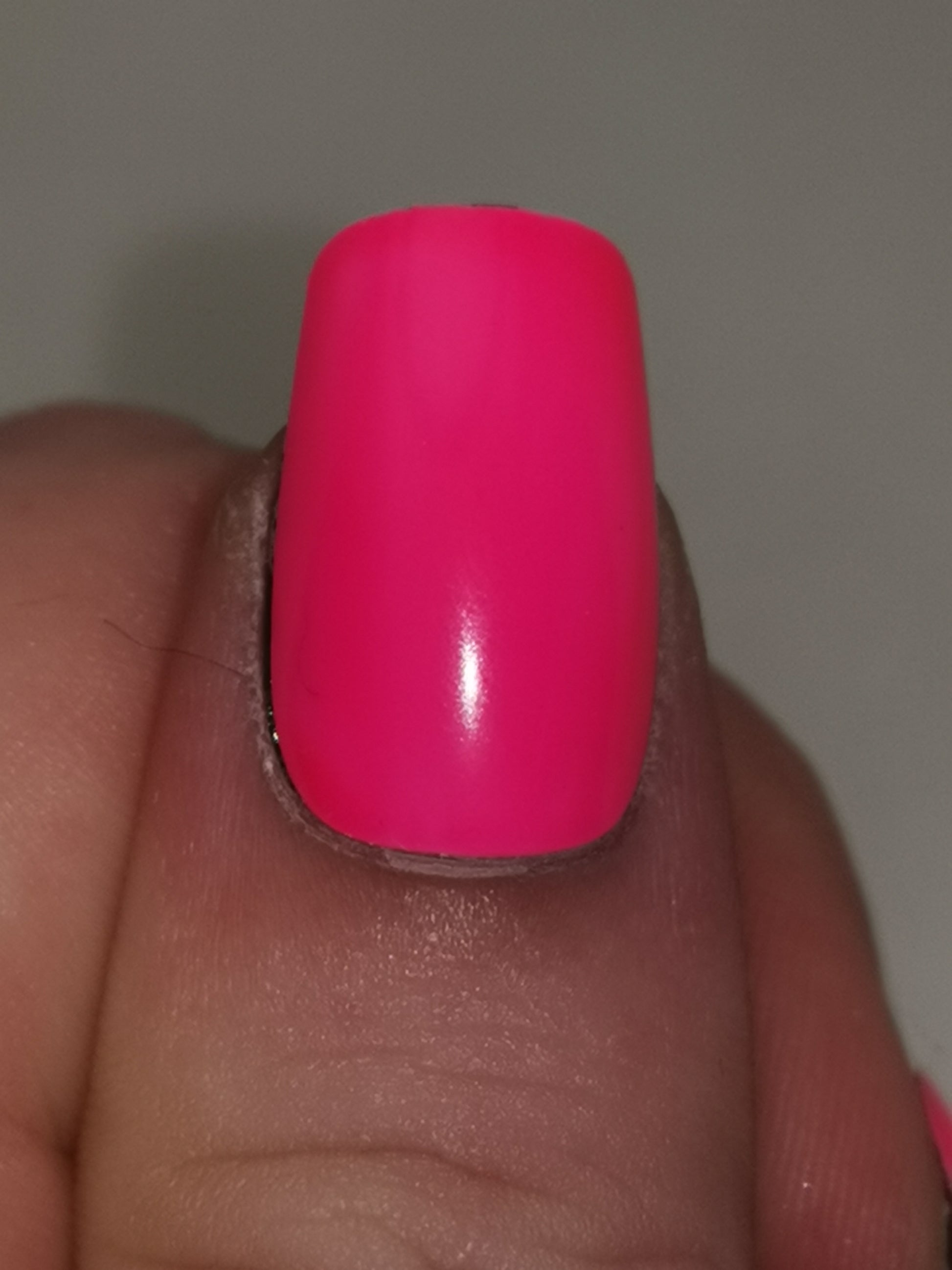 A neon orangey pink jelly polish that glows orangey pink in the dark.