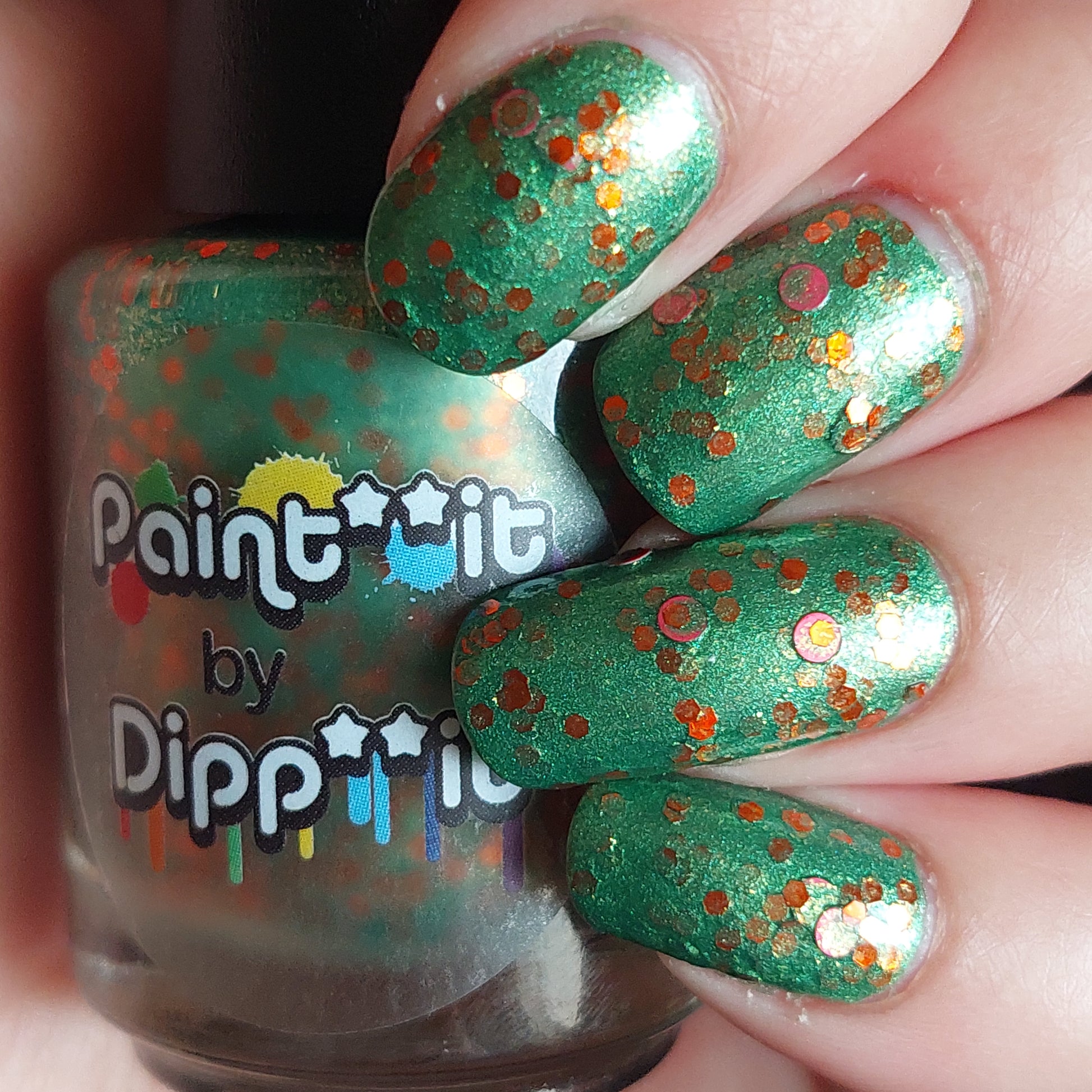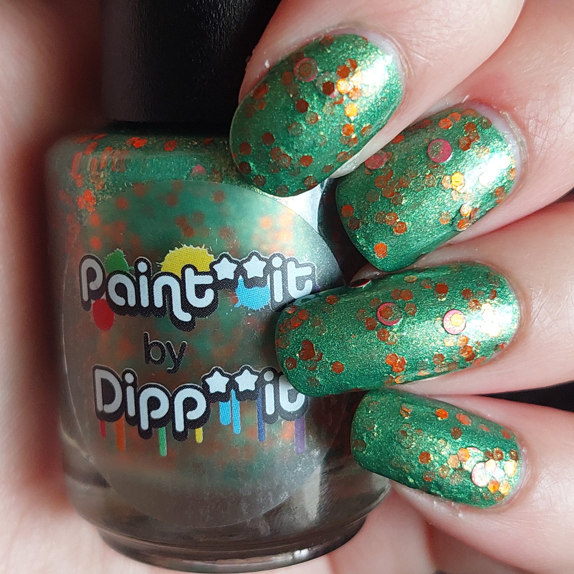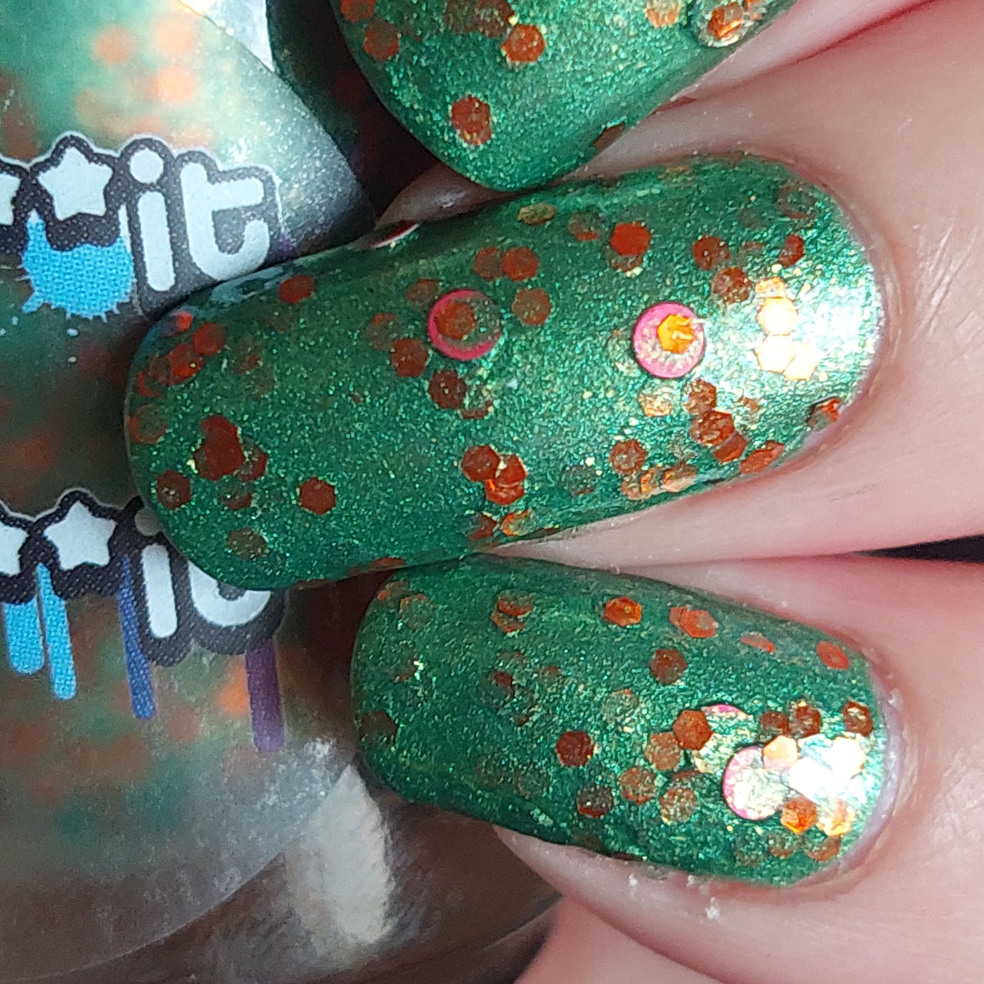 Toxic Temptress is inspired by Poison Ivy and is a green polish filled with shiny orange hex glitter, and larger, round, matte watermelon glitter.