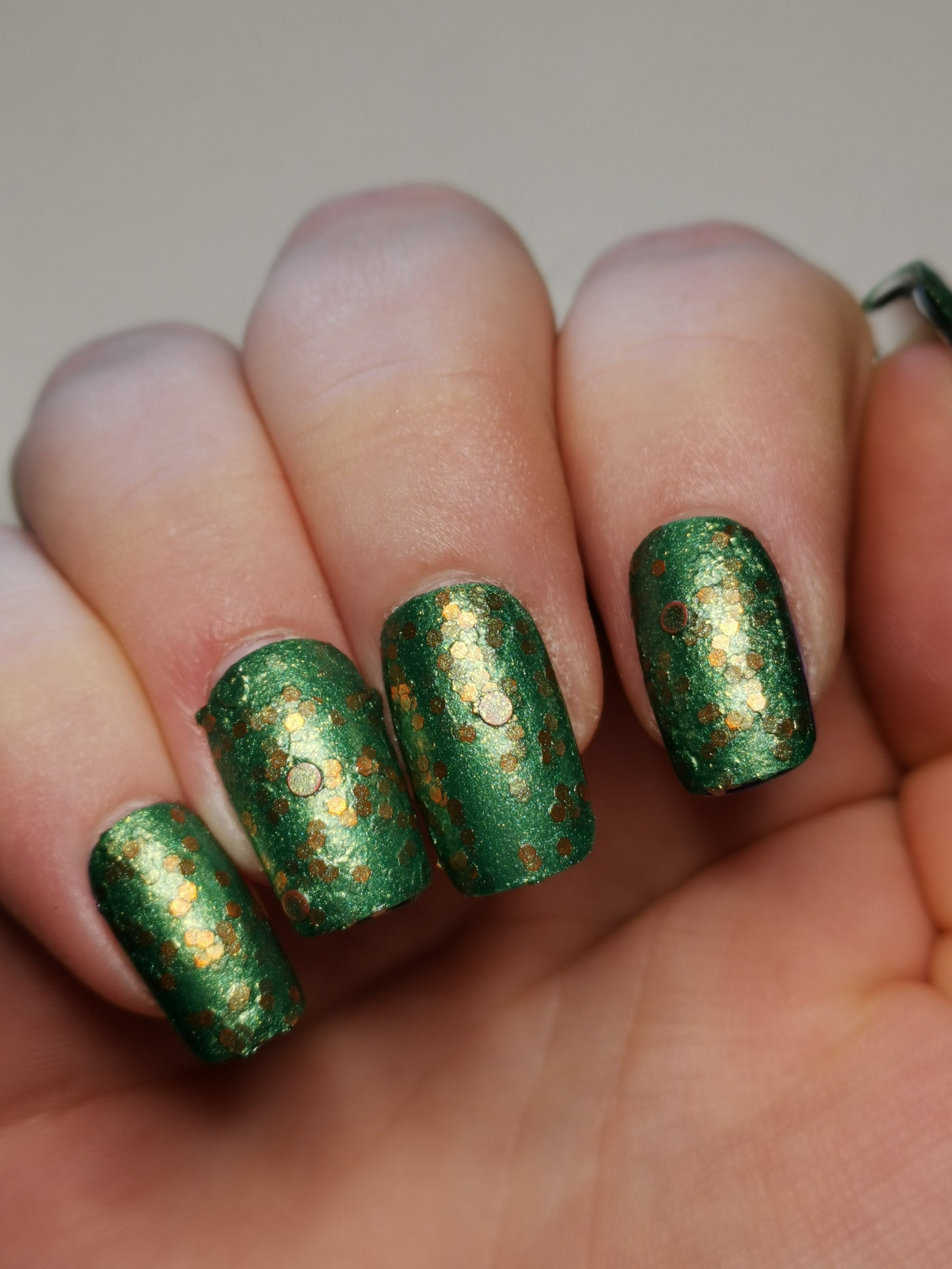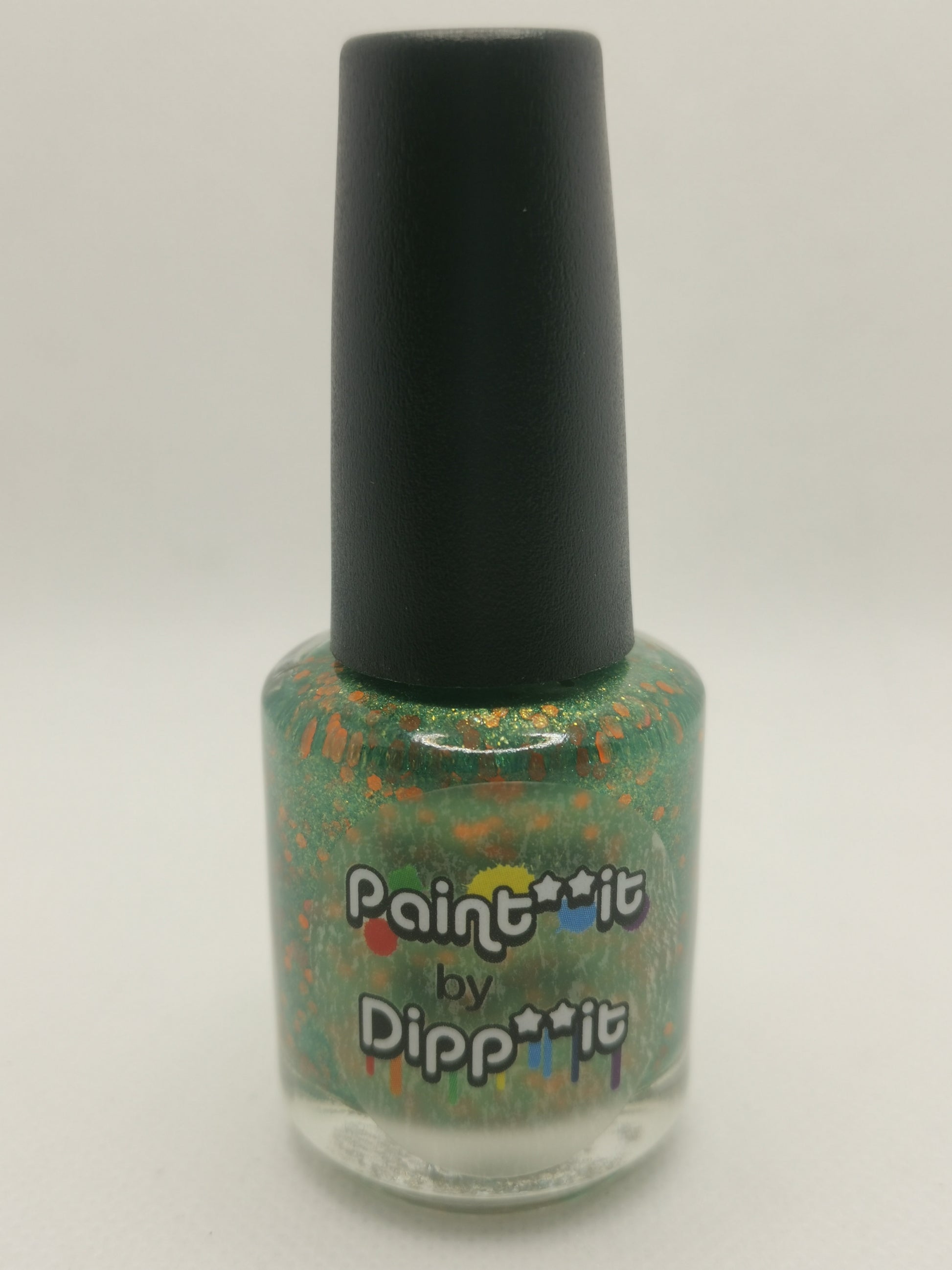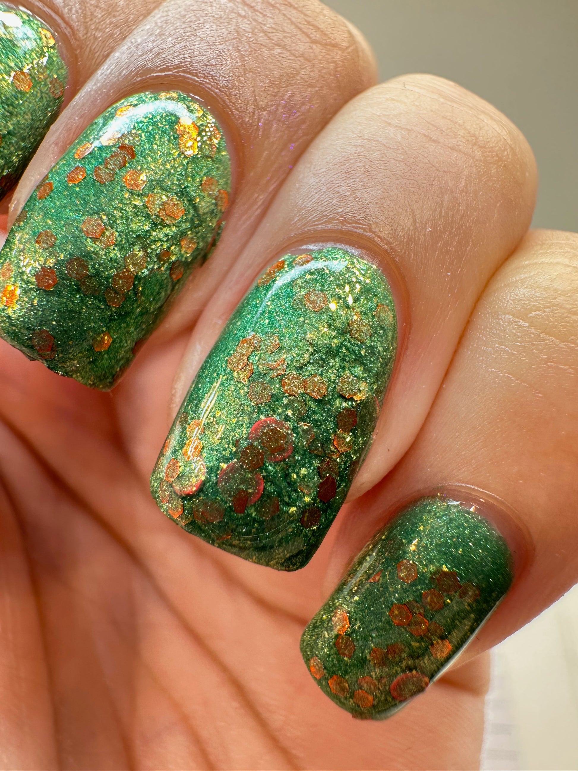 Toxic Temptress is inspired by Poison Ivy and is a green polish filled with shiny orange hex glitter, and larger, round, matte watermelon glitter.