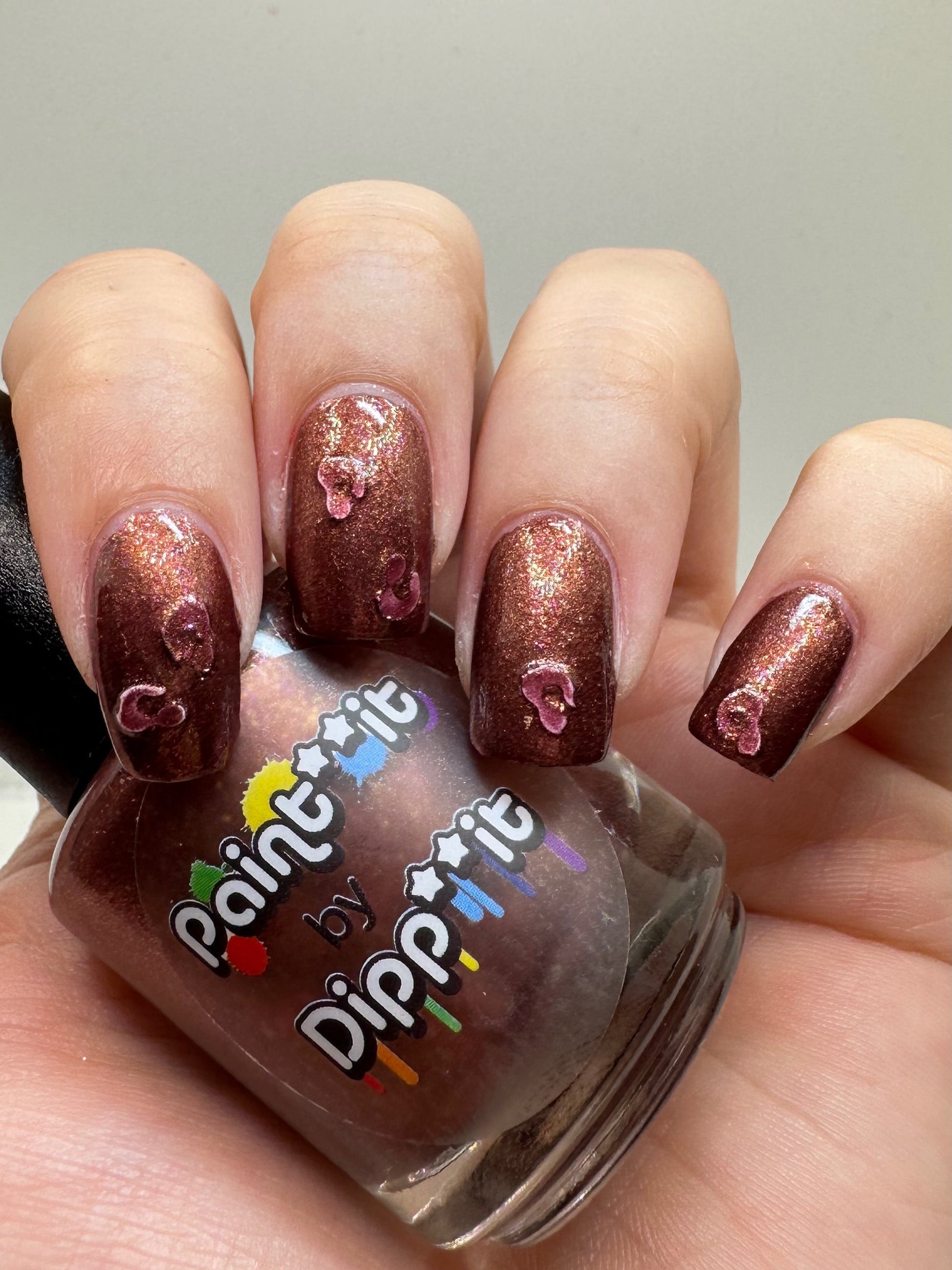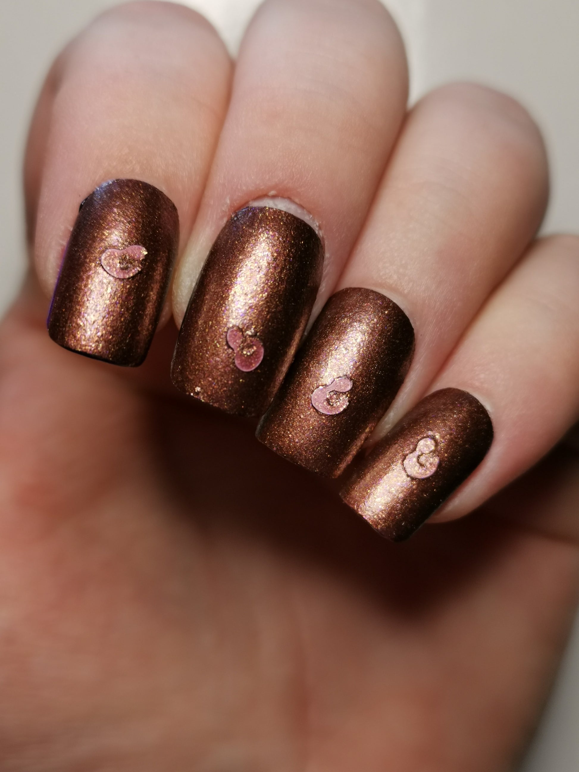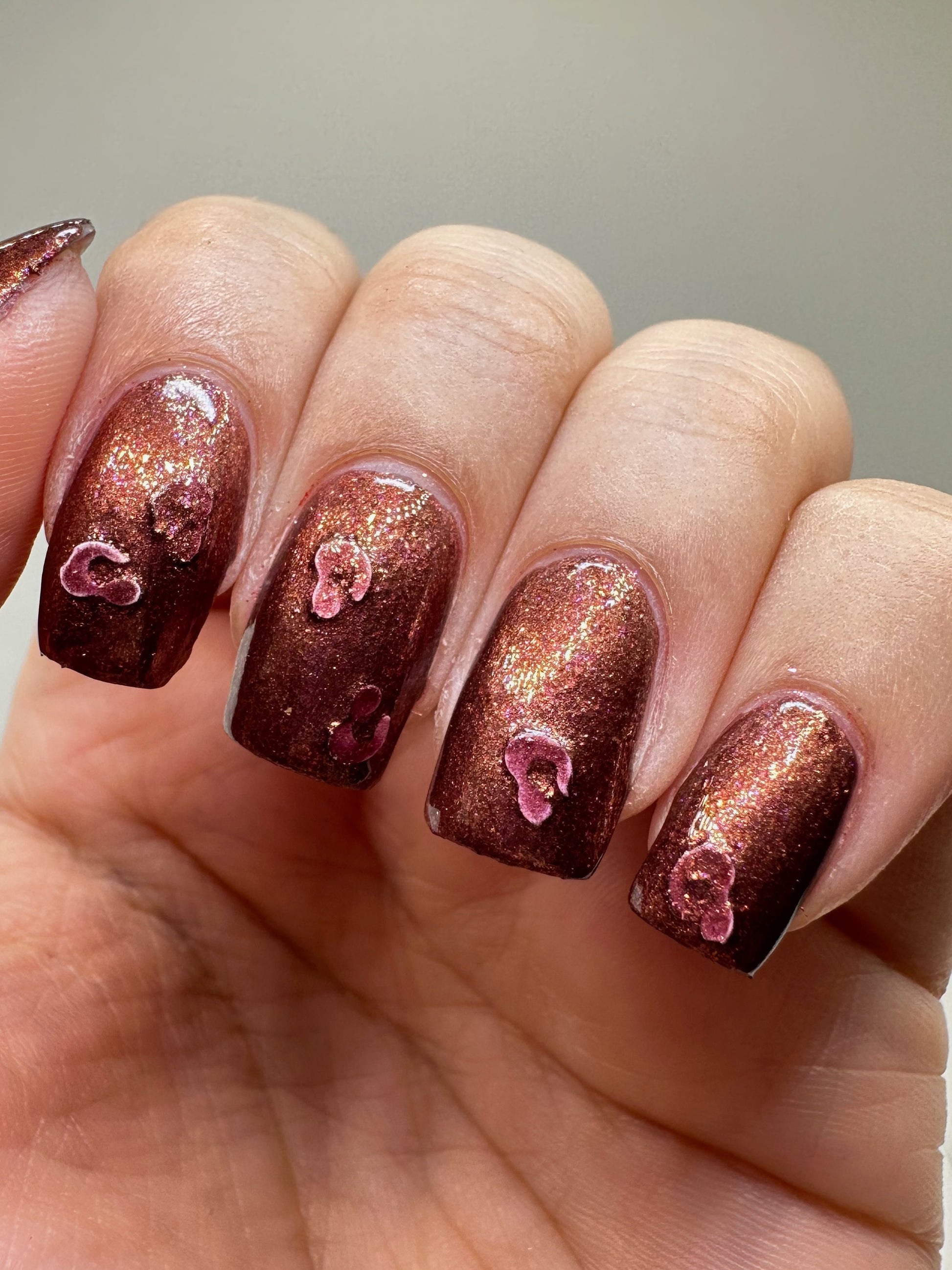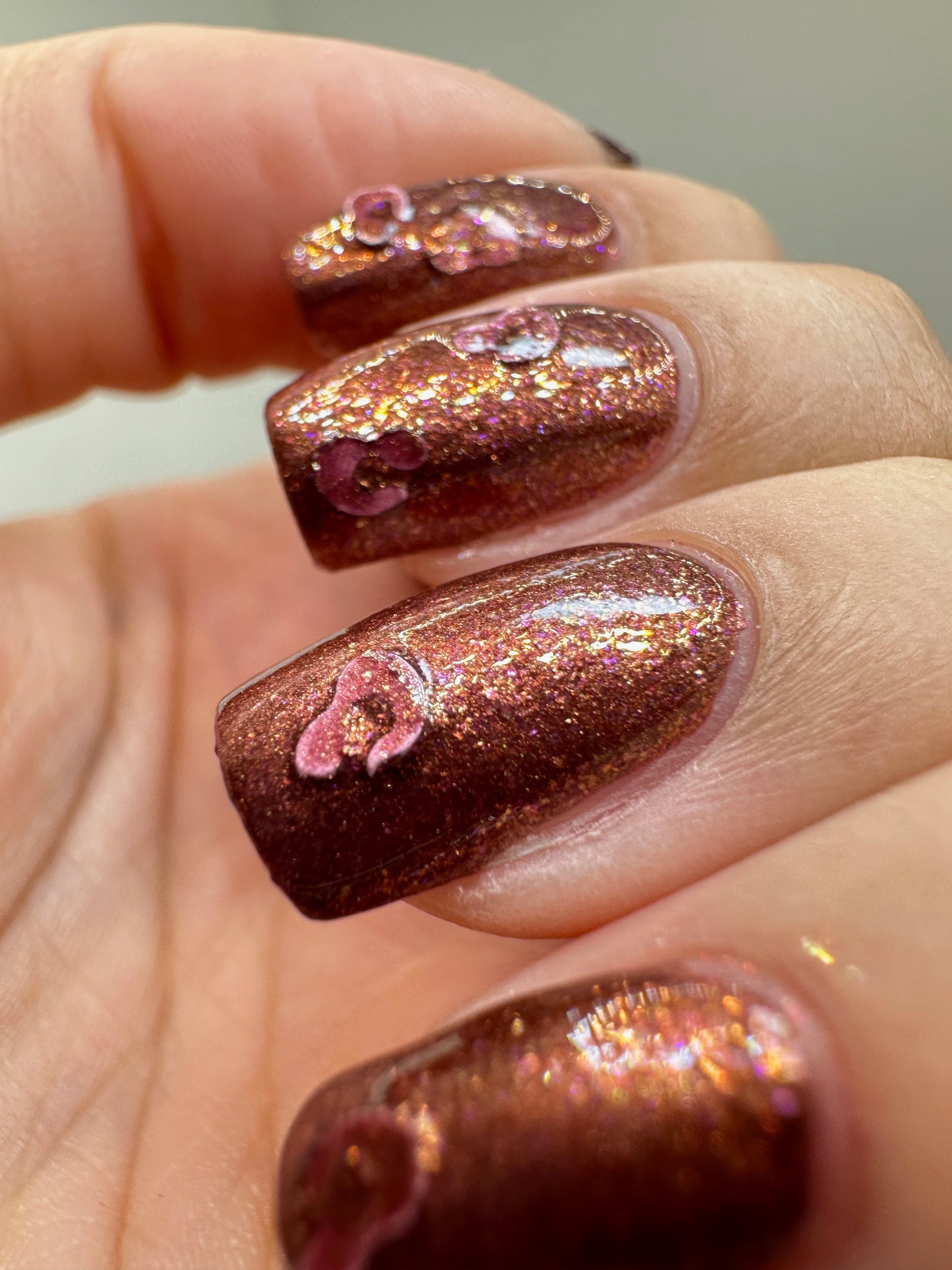Wildcat is inspired by Cheetah and is a brown polish filled with pink and gold microflakes and pink leopard print shaped glitter.