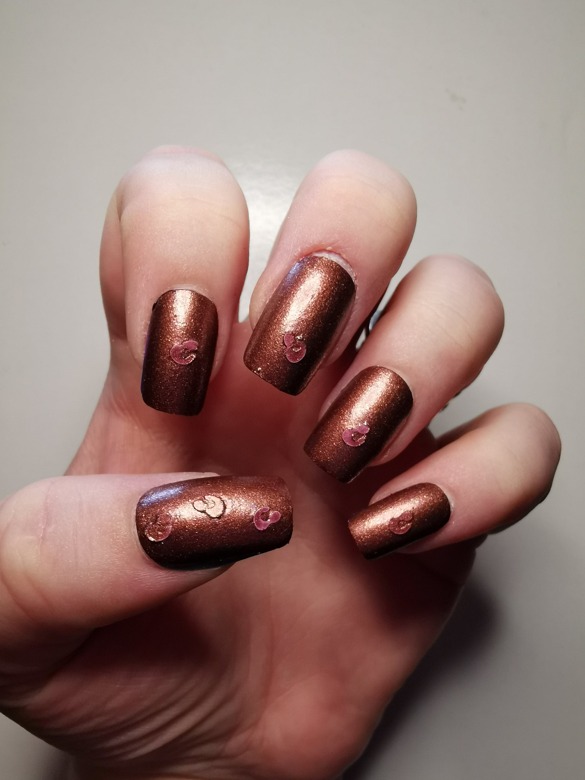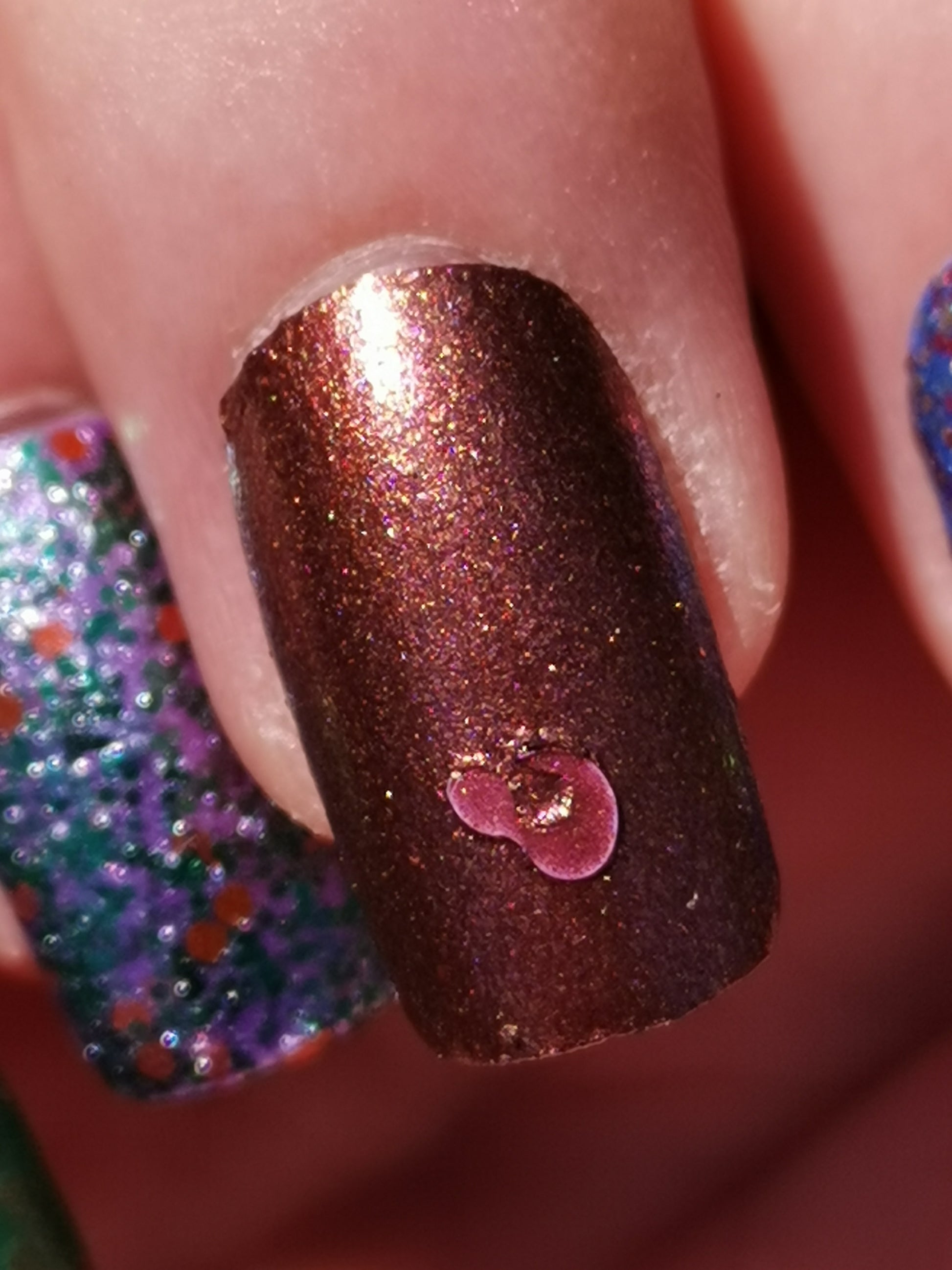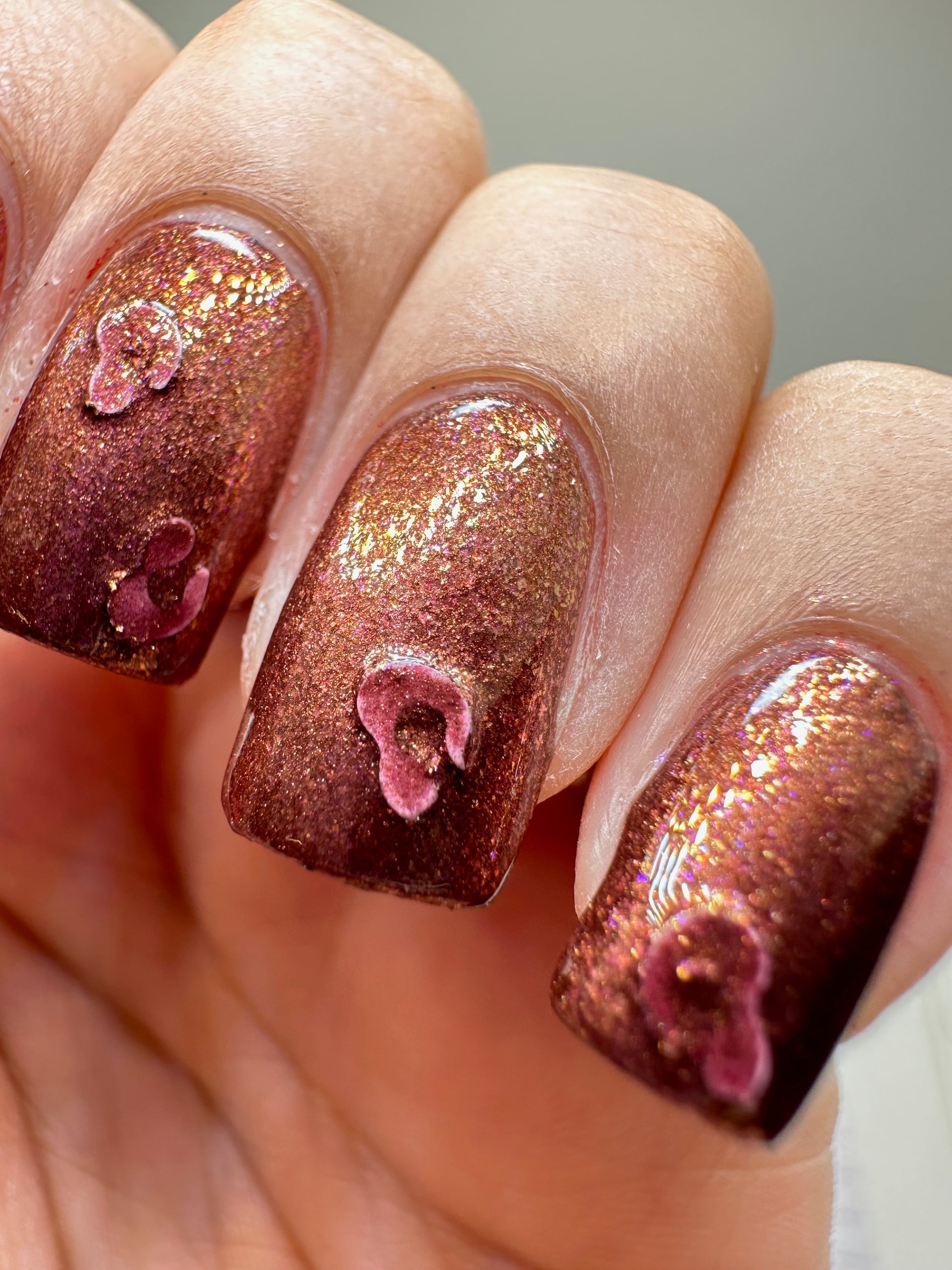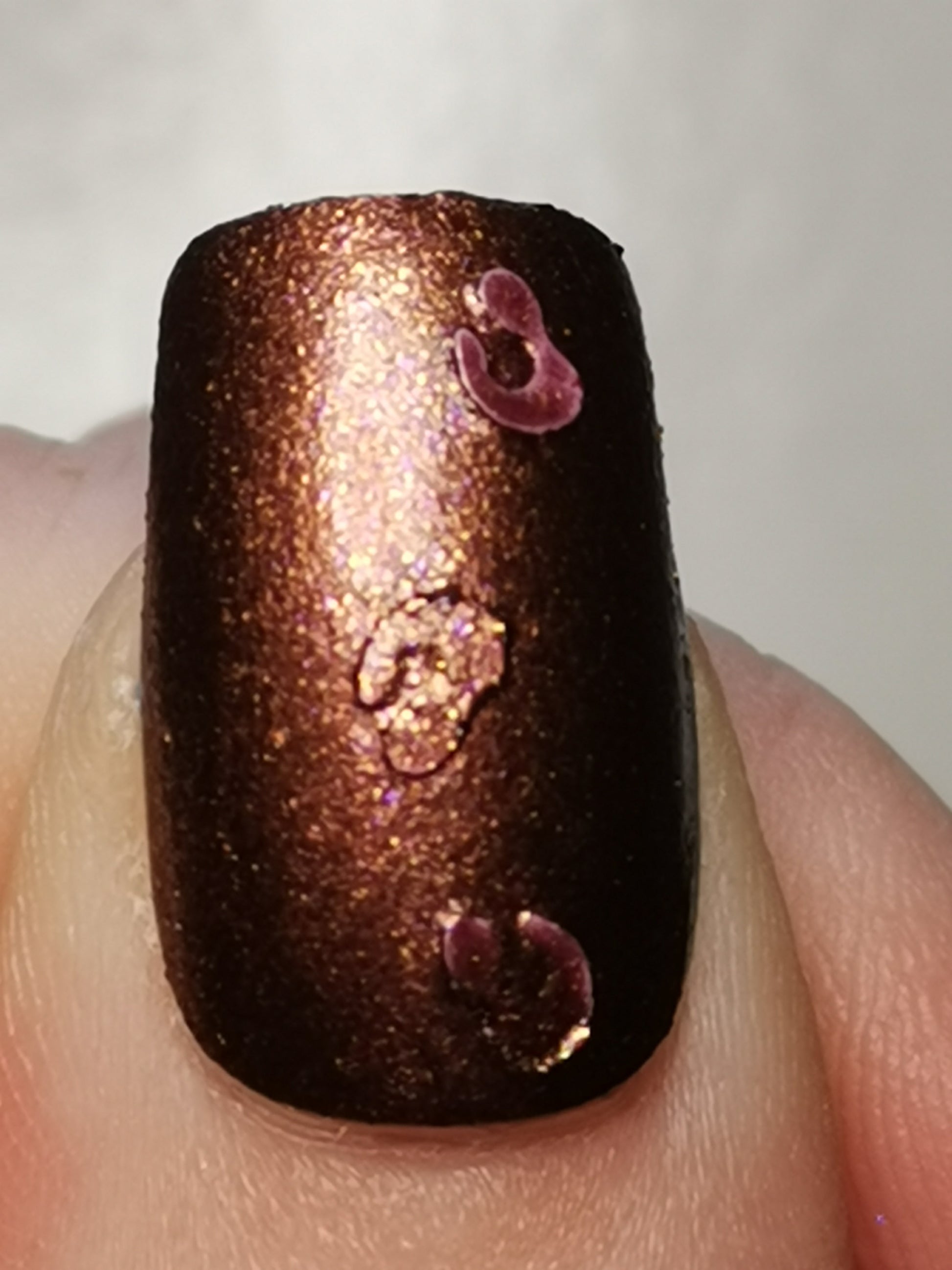 Wildcat is inspired by Cheetah and is a brown polish filled with pink and gold microflakes and pink leopard print shaped glitter.